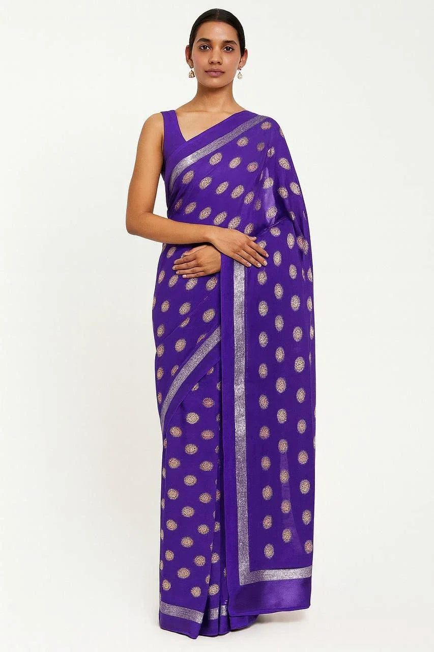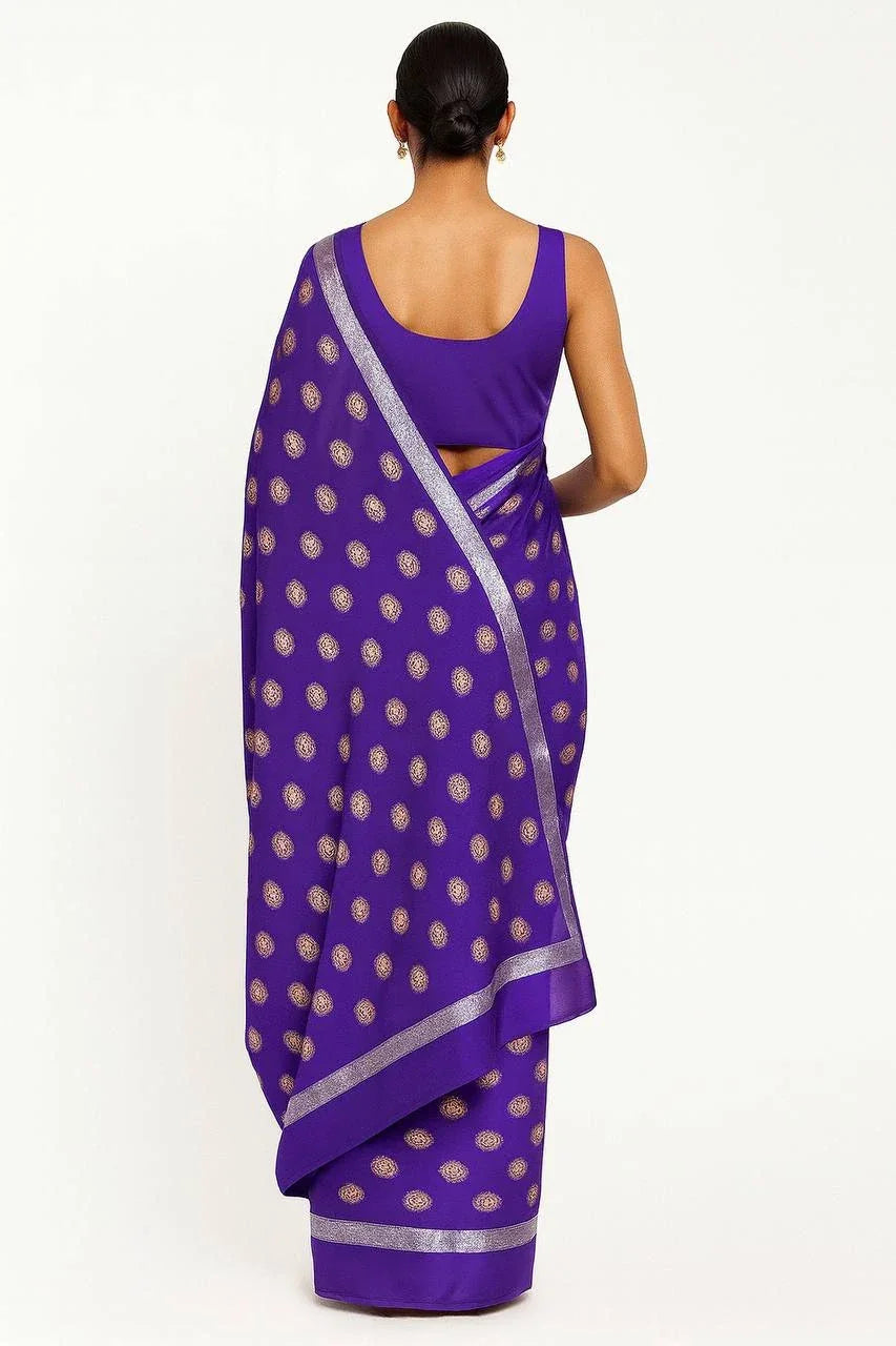 Introducing Glamwiz Ready to Wear Purple Viscose Georgette Saree. Step into the world of elegance with our beautiful Viscose Georgette sarees, meticulously crafted with exquisite embroidery work and stunning zari borders.