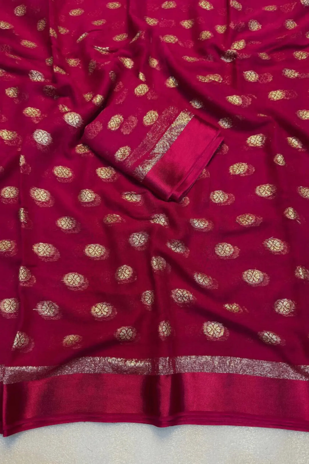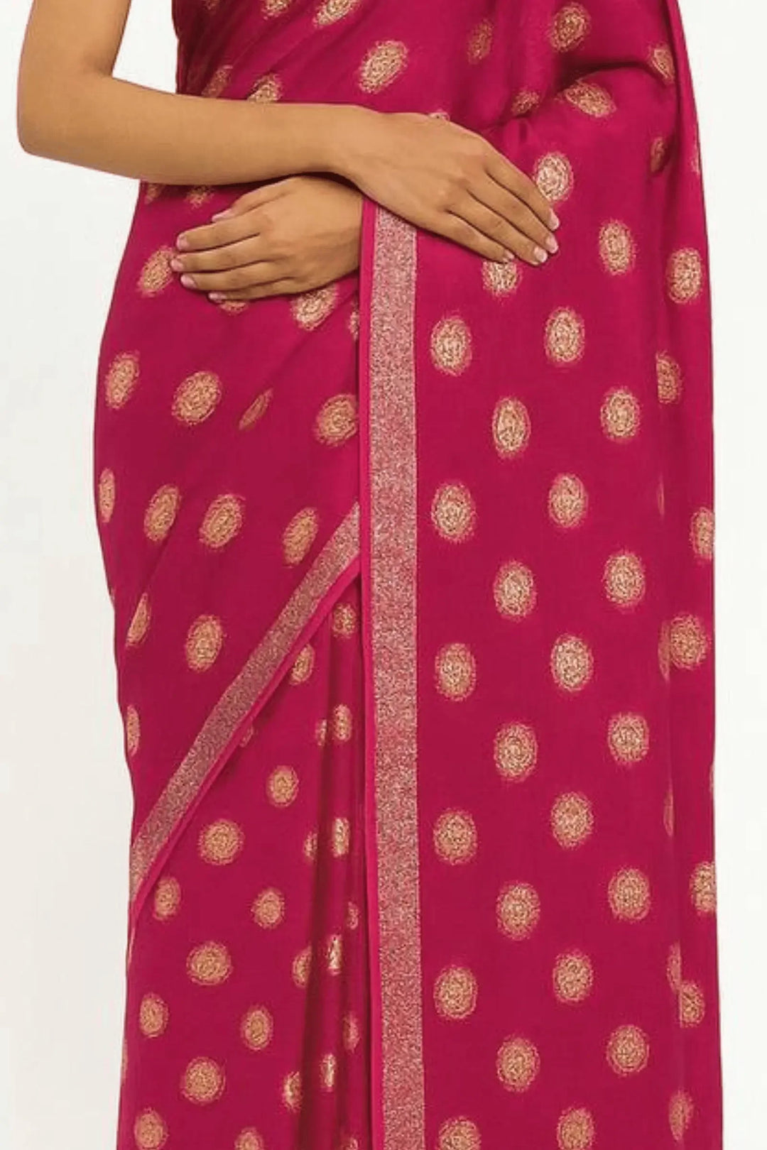 Introducing Glamwiz Ready to Wear Pink Viscose Georgette Saree. Step into the world of elegance with our beautiful Viscose Georgette sarees, meticulously crafted with exquisite embroidery work and stunning zari borders.