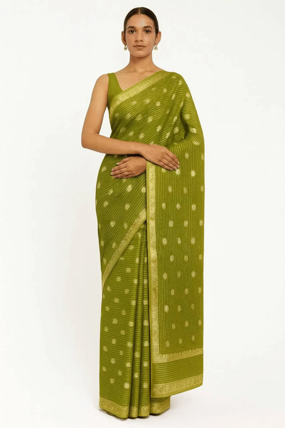 Introducing Glamwiz Ready to Wear Green Viscose Georgette Saree. Step into the world of elegance with our beautiful Viscose Georgette sarees, meticulously crafted with exquisite embroidery work and stunning zari borders.