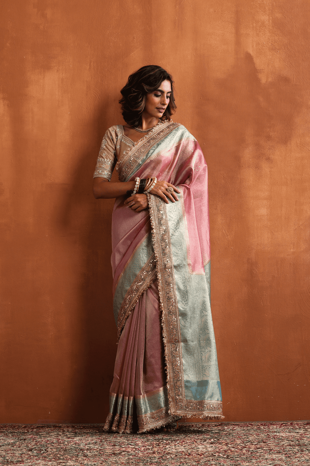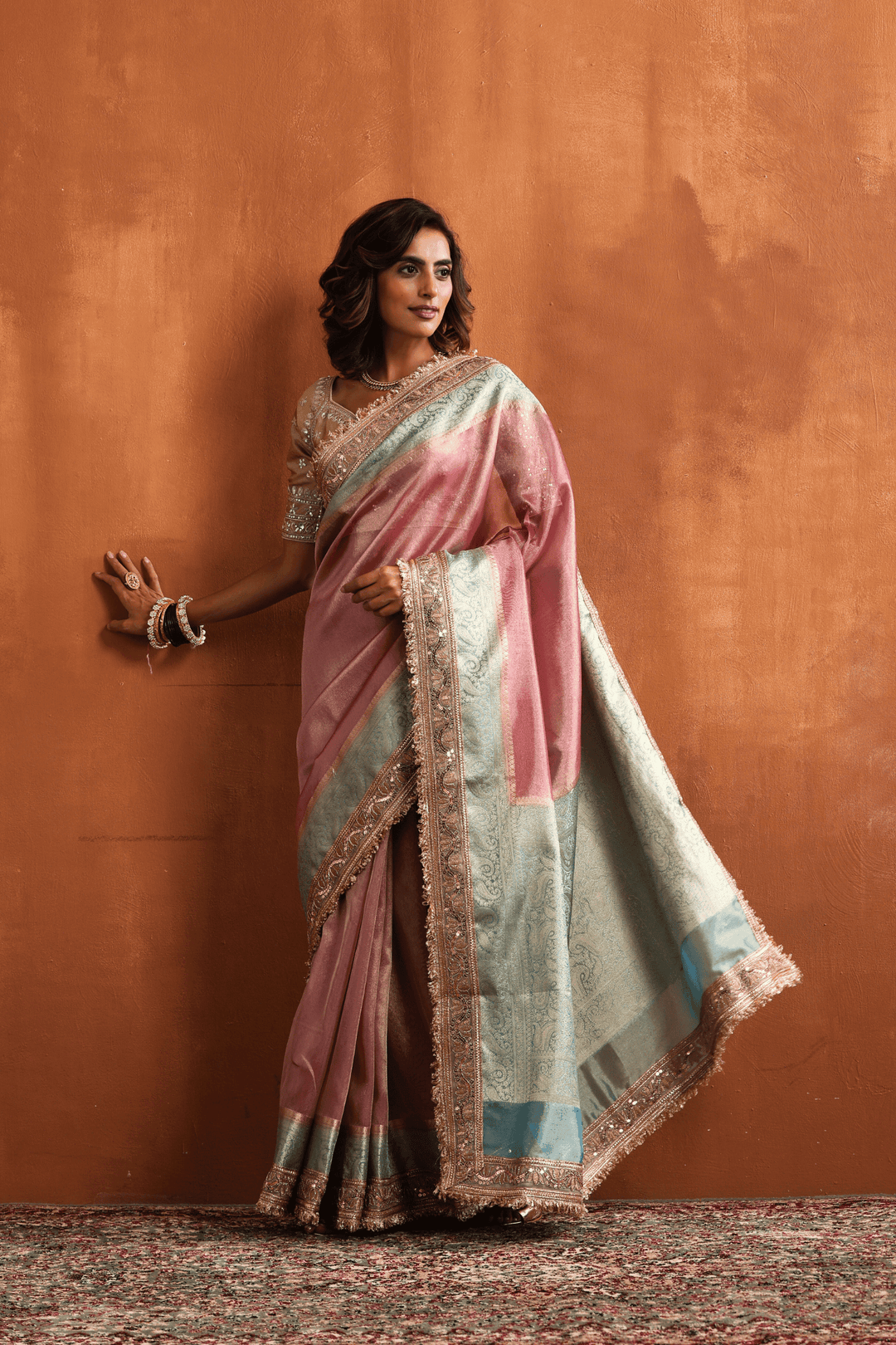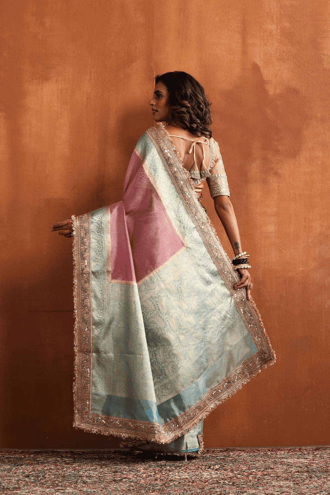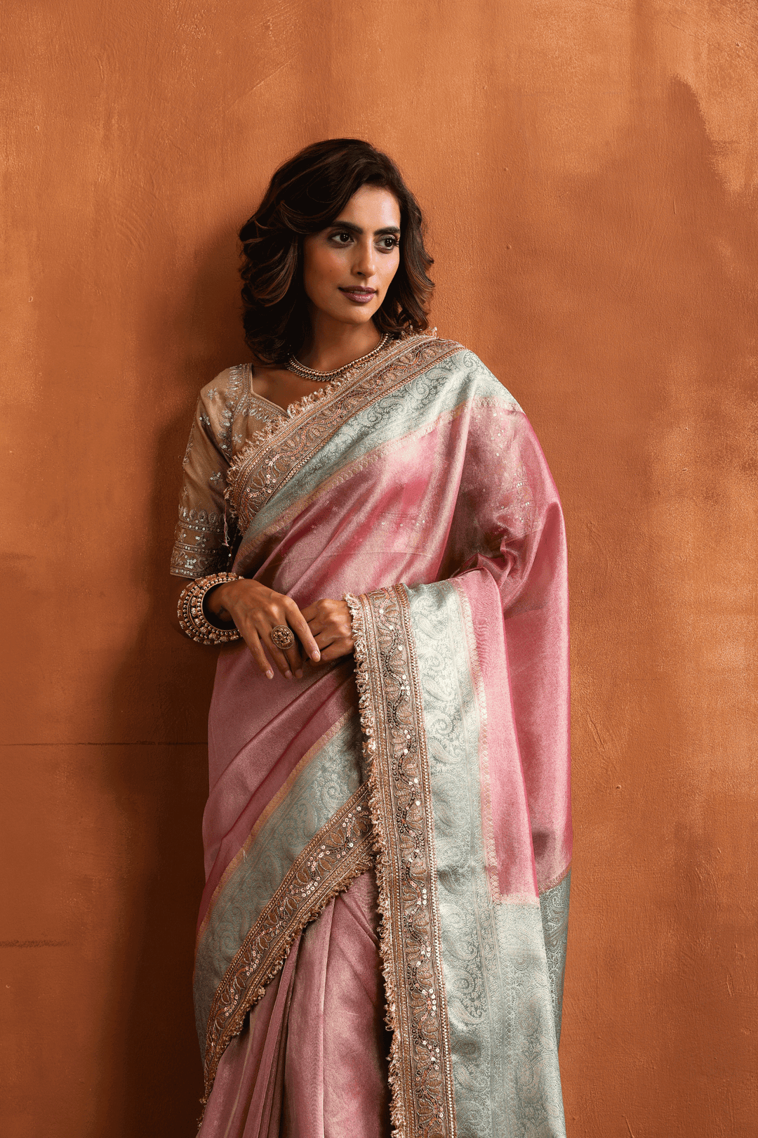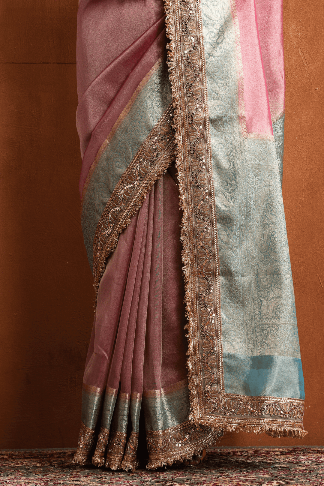 Pink Blush N Blue | Ready to Wear Tissue Banarasi Saree