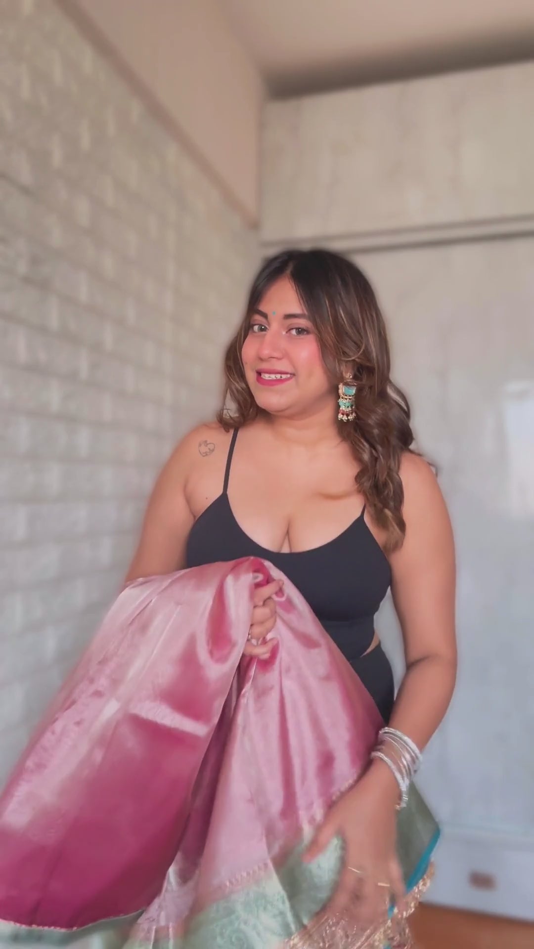 This Tissue Banarasi saree comes with stitched pleats, and is adjustable upto 5 XL.