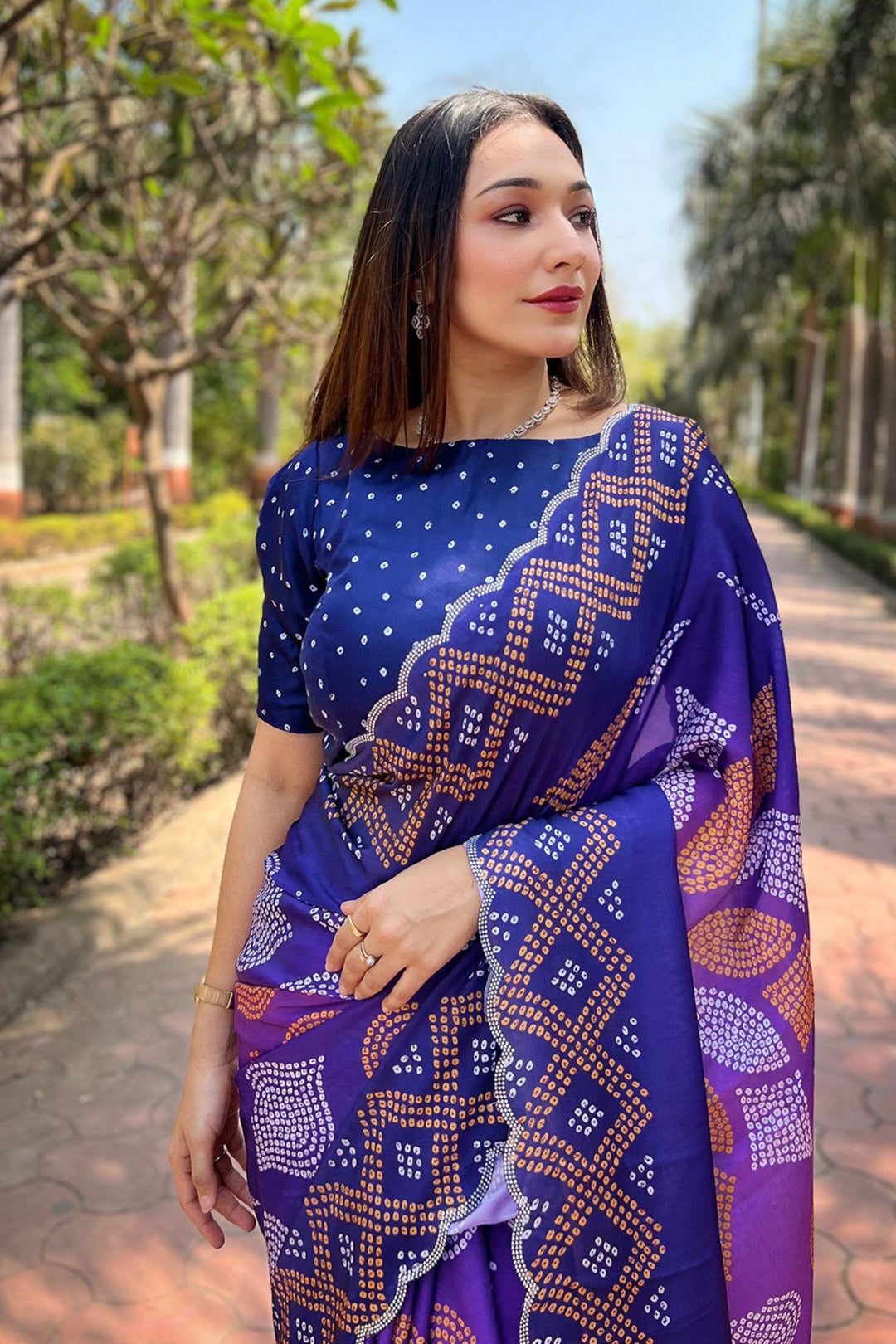 Introducing Glamwiz Ready To Wear Midnight Blue Bandhej Saree in Satin Georgette. Experience the perfect blend of tradition and convenience with the Glamwiz Ready-to-Wear Saree. This stunning saree is designed to offer you the elegance of a traditional saree with the ease of modern fashion.