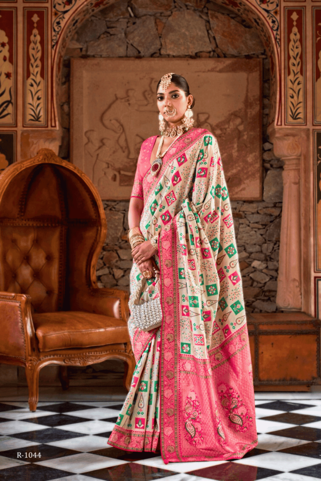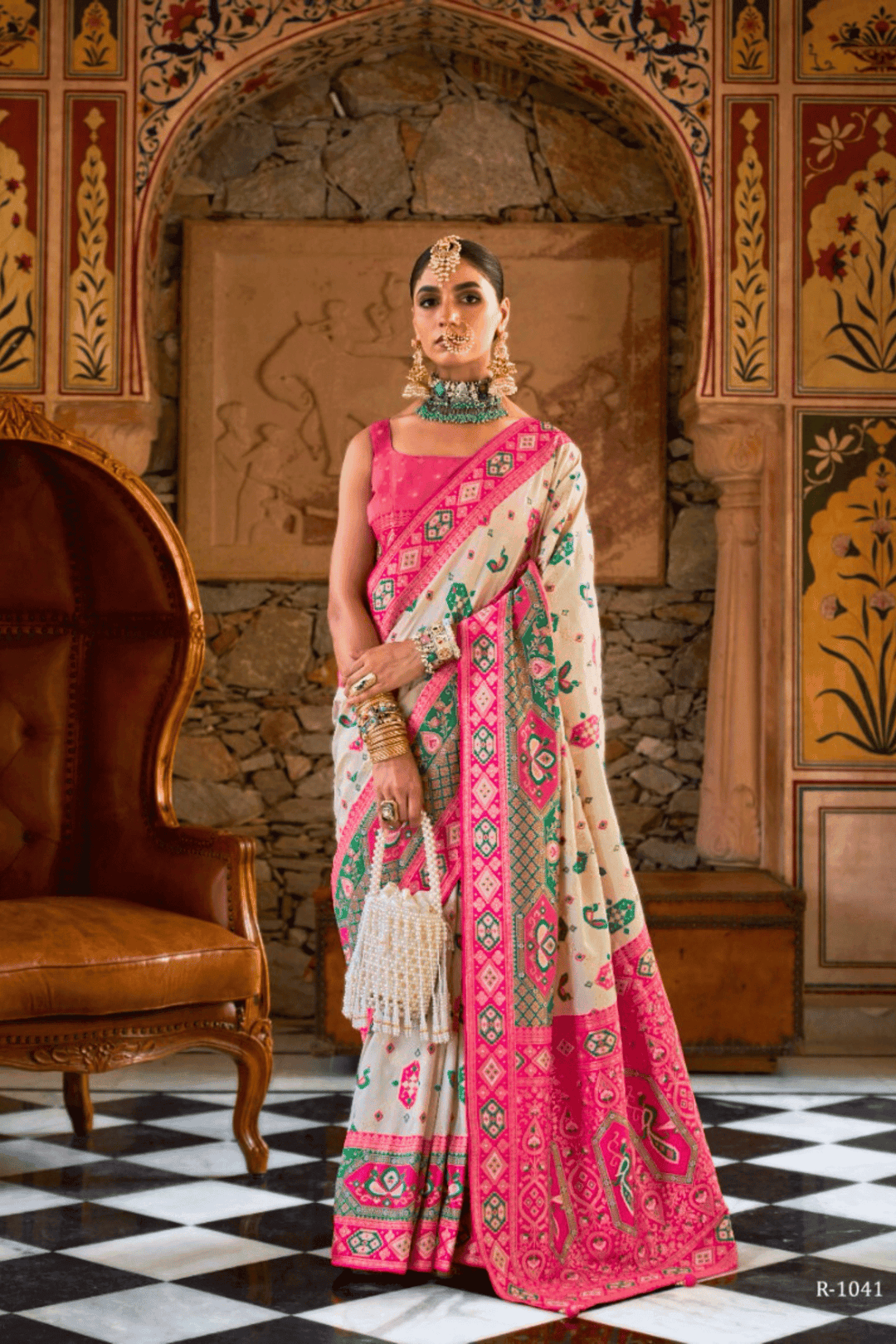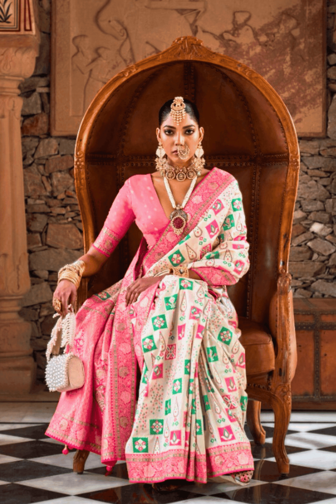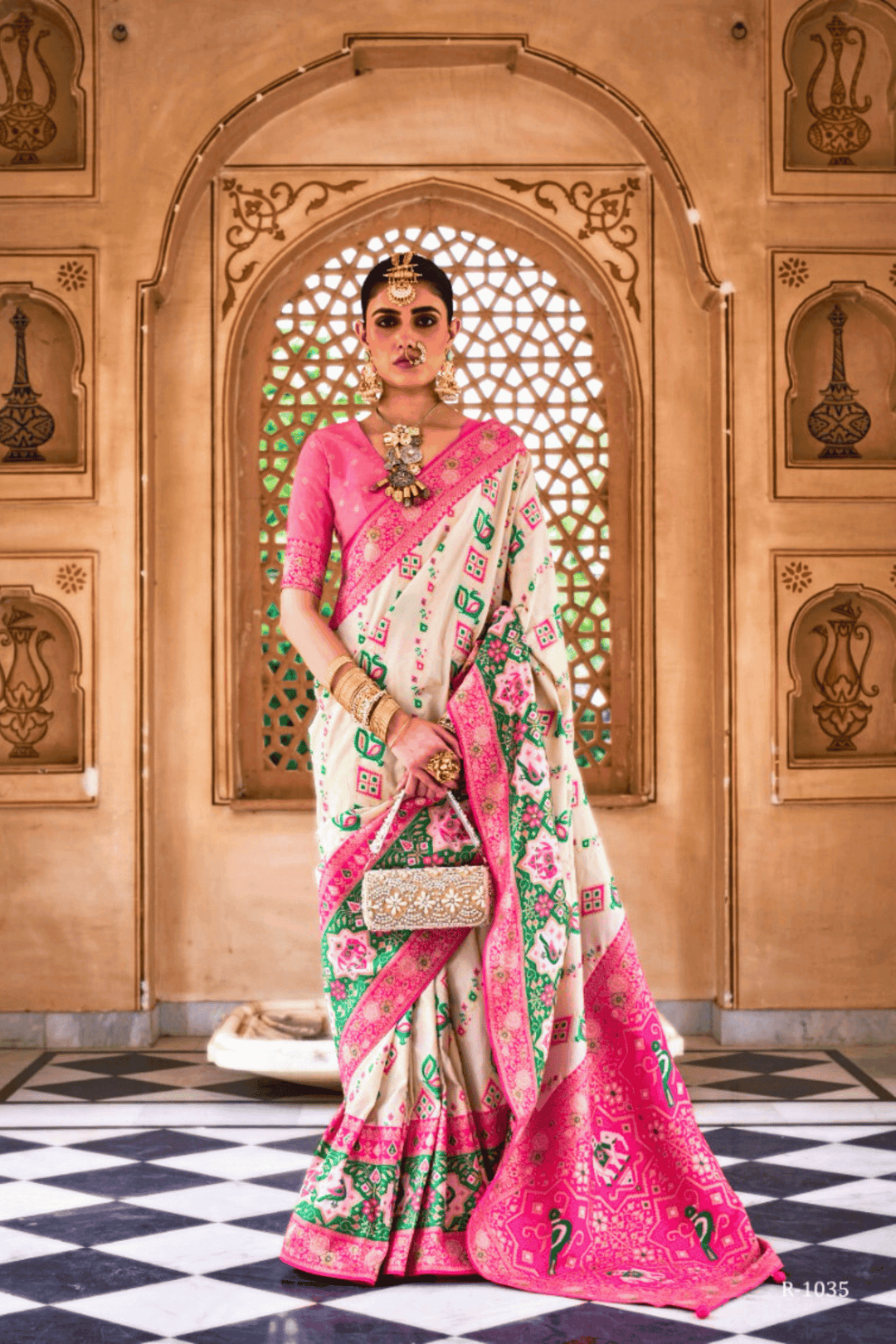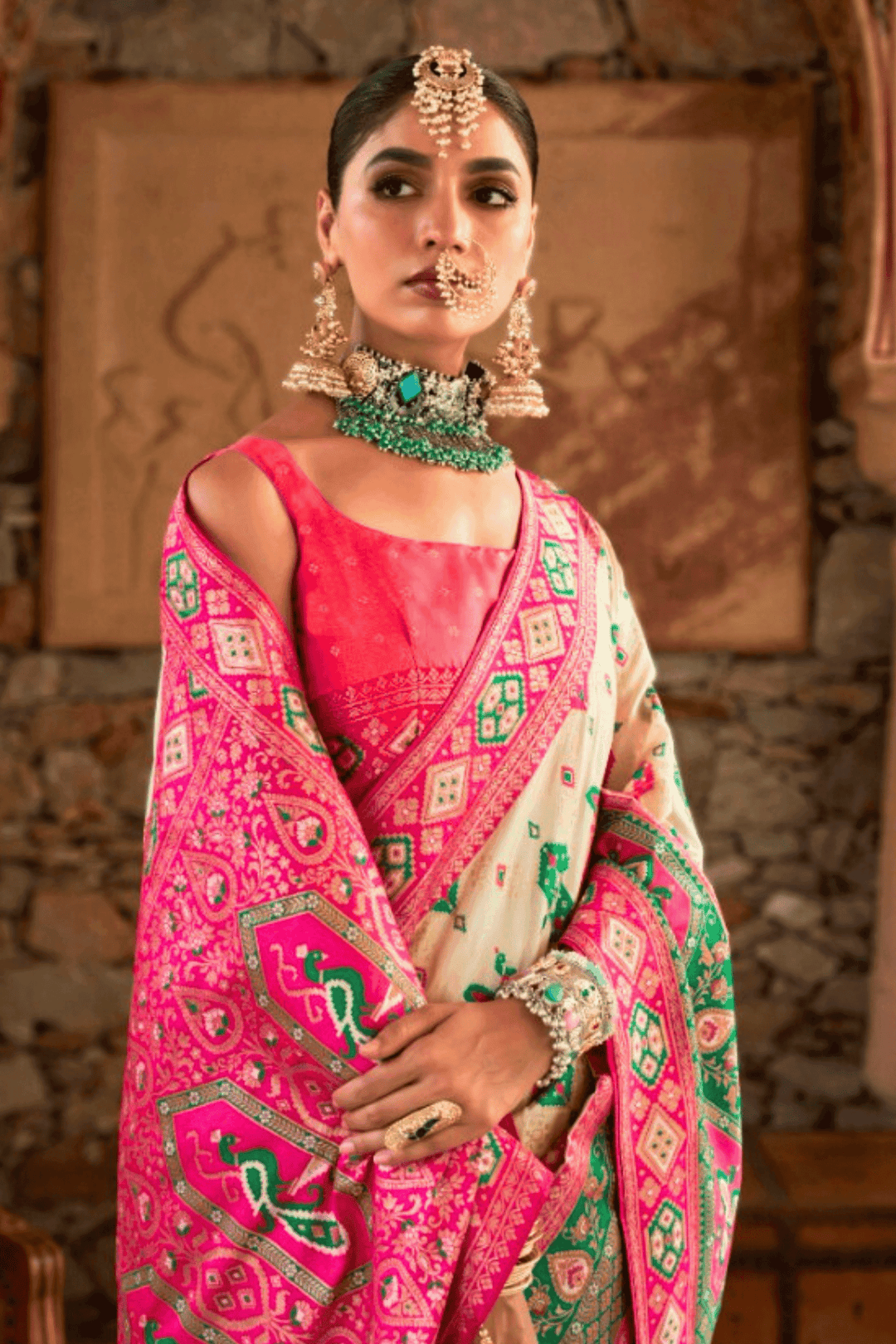 Introducing Glamwiz Ready to Wear Pearl White Patola Saree, where luxury meets tradition. This exquisite saree is crafted from luxurious patola silk, known for its rich colors and intricate patterns.