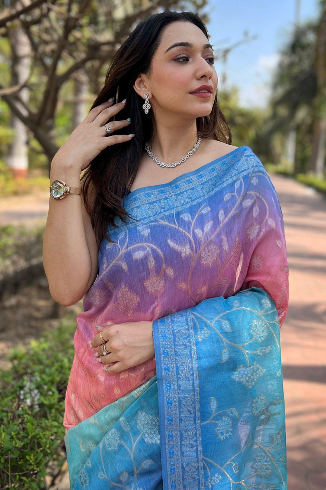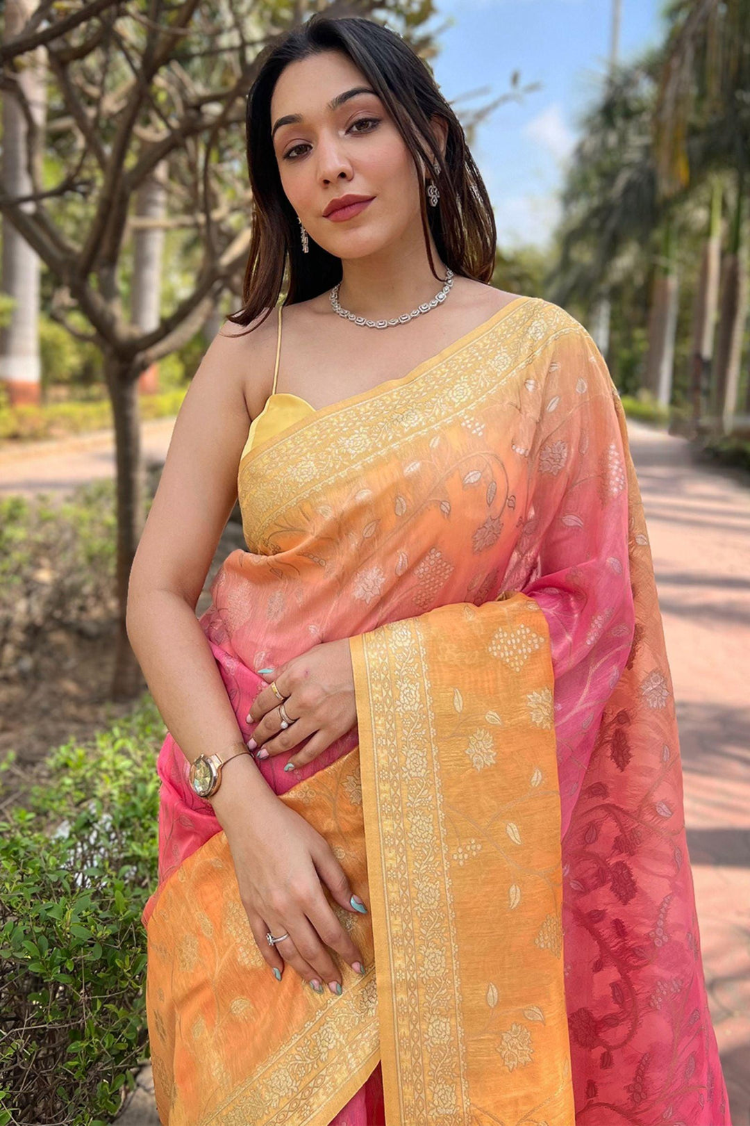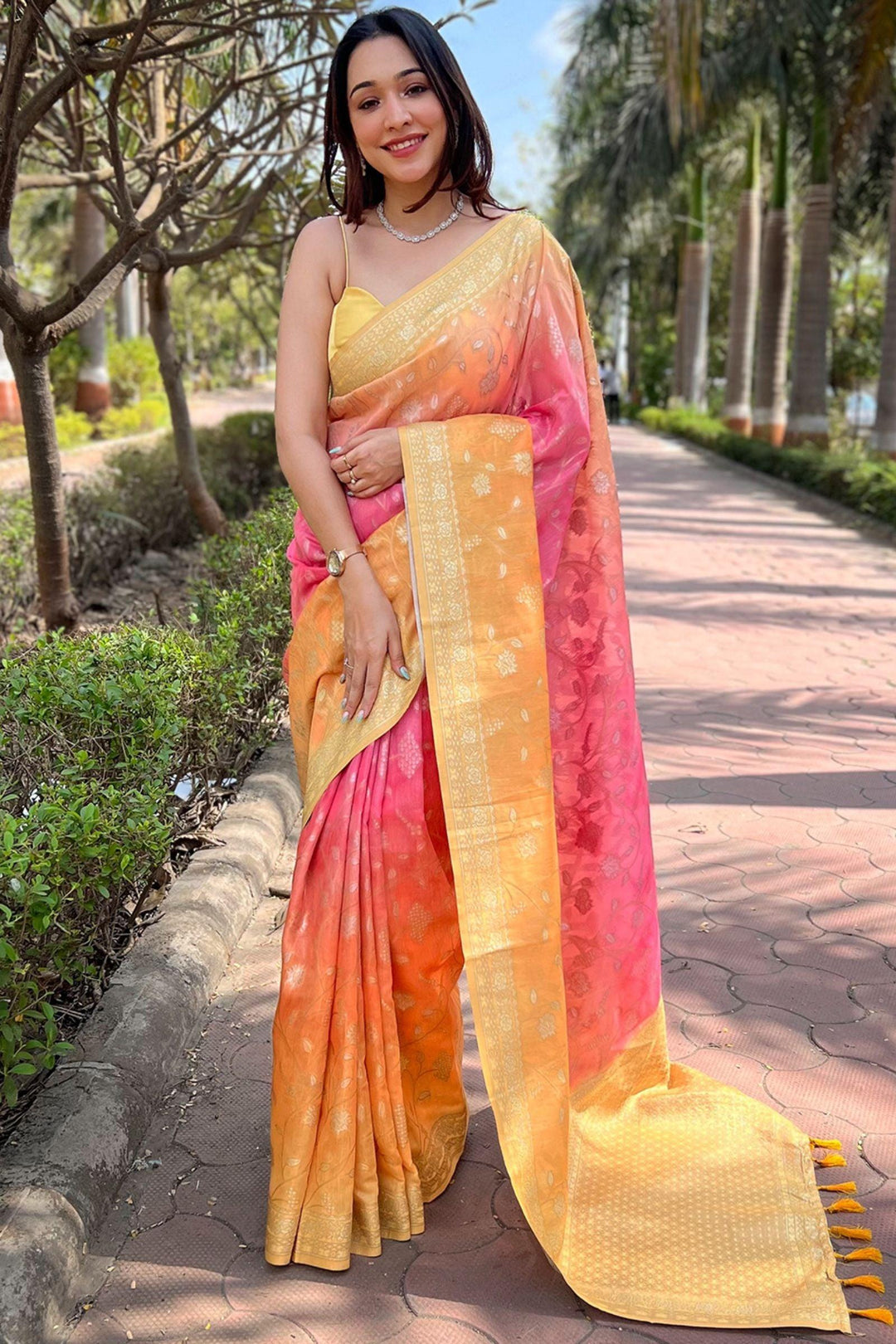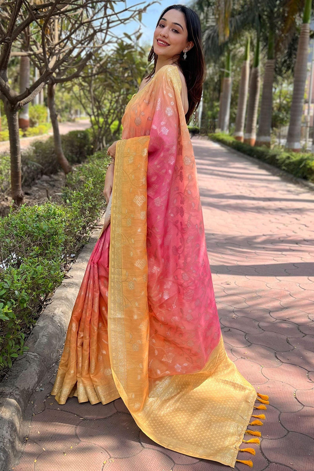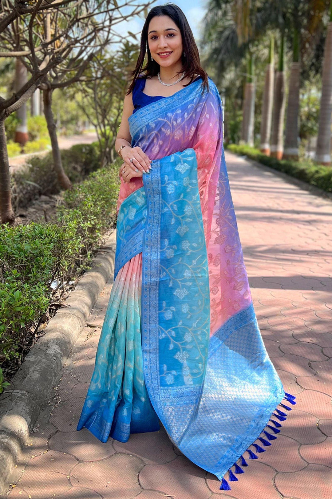 Introducing Glamwiz Ready To Wear Shaded Banarasi Saree. Experience the perfect blend of tradition and convenience with the Glamwiz Ready-to-Wear Saree. This stunning saree is designed to offer you the elegance of a traditional saree with the ease of modern fashion.