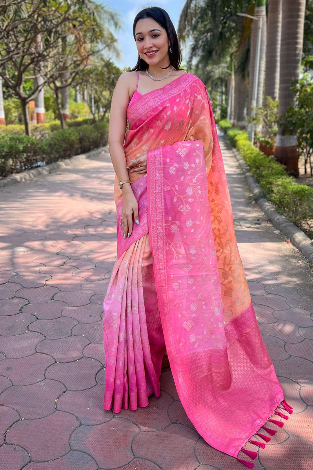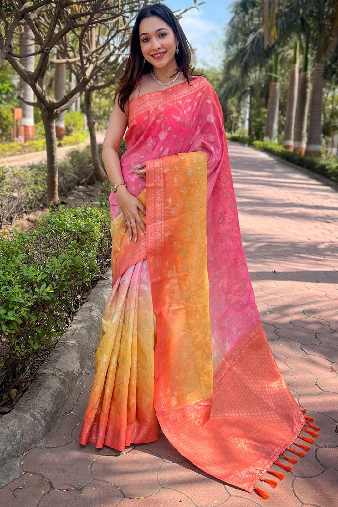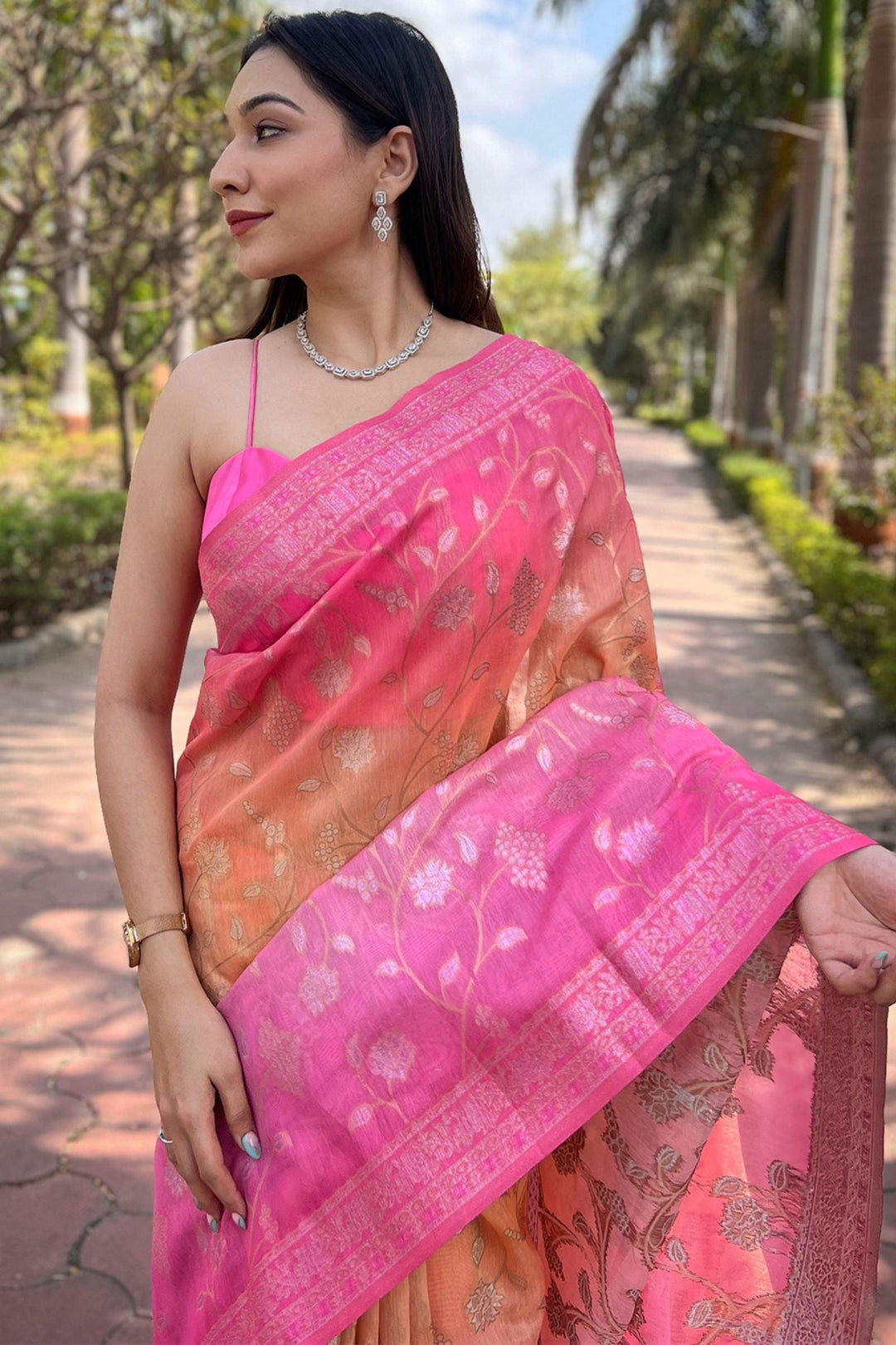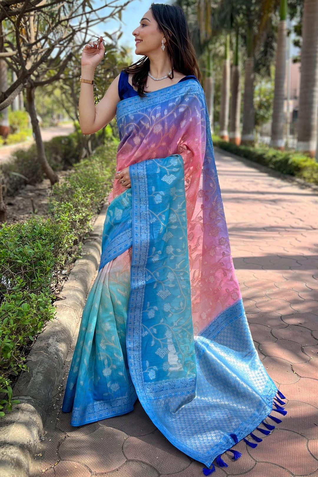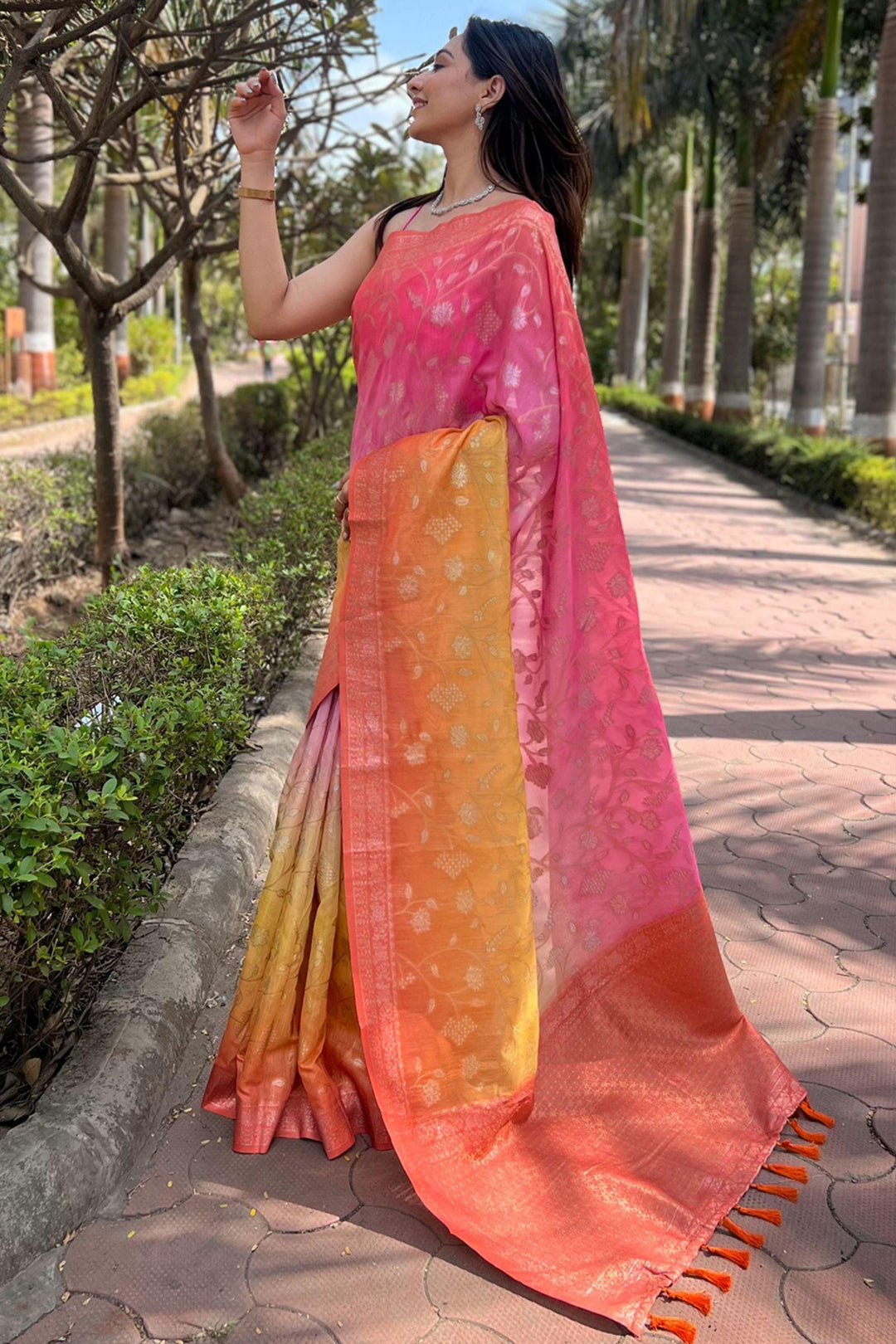 Introducing Glamwiz Ready To Wear Shaded Banarasi Saree. Experience the perfect blend of tradition and convenience with the Glamwiz Ready-to-Wear Saree. This stunning saree is designed to offer you the elegance of a traditional saree with the ease of modern fashion.