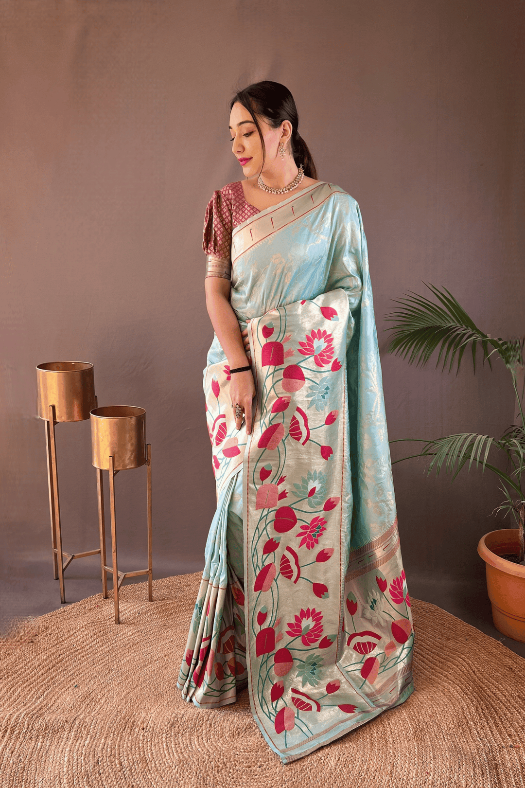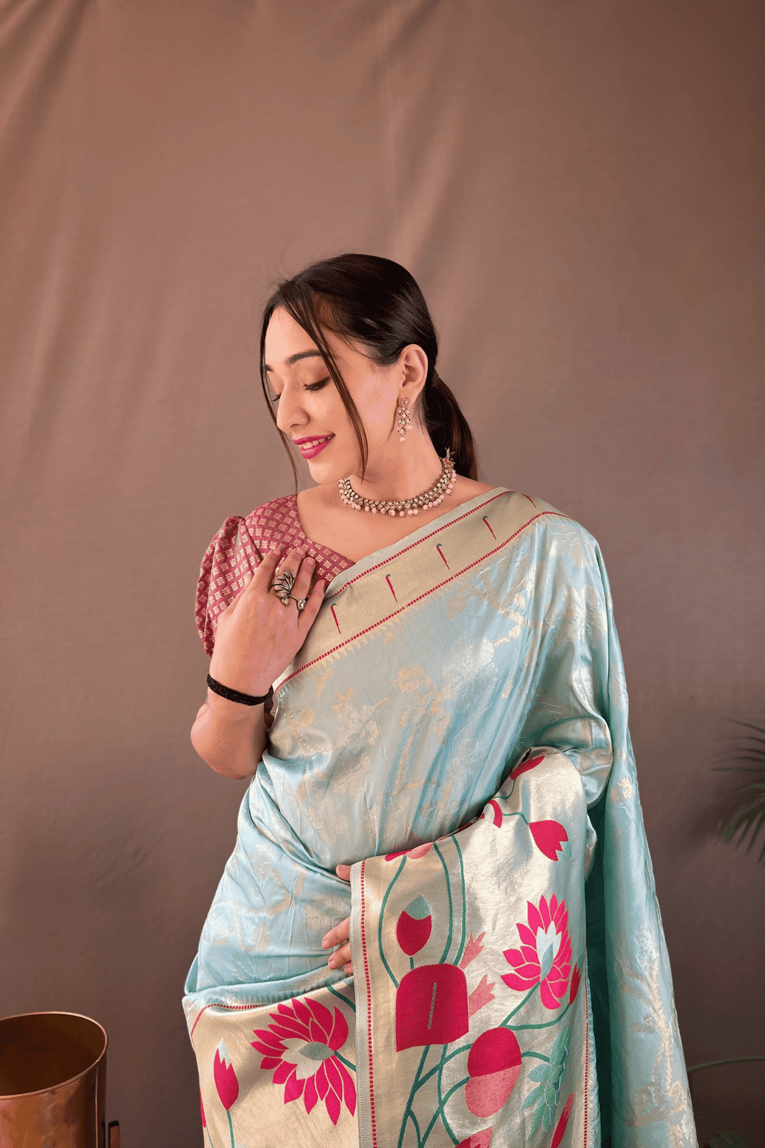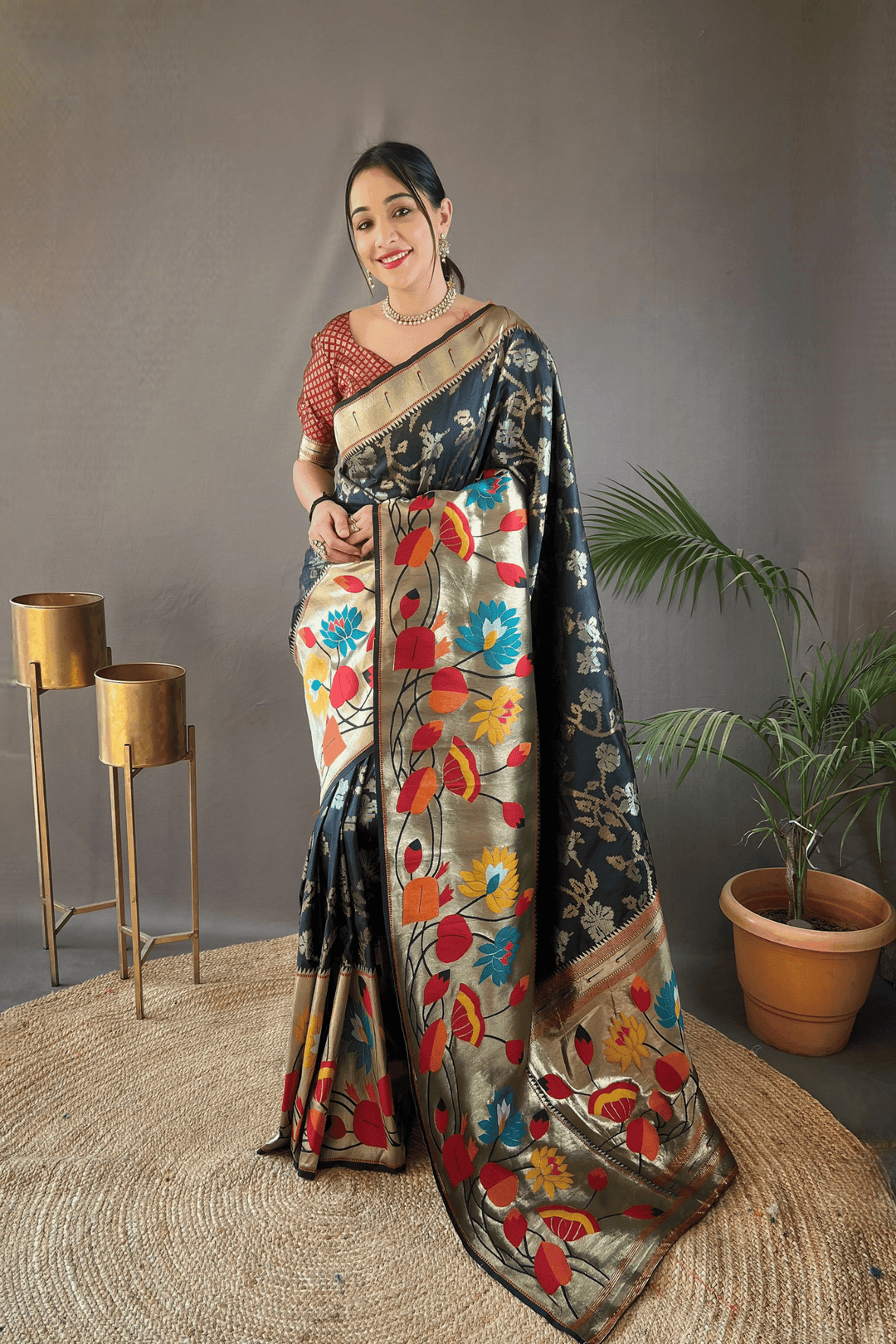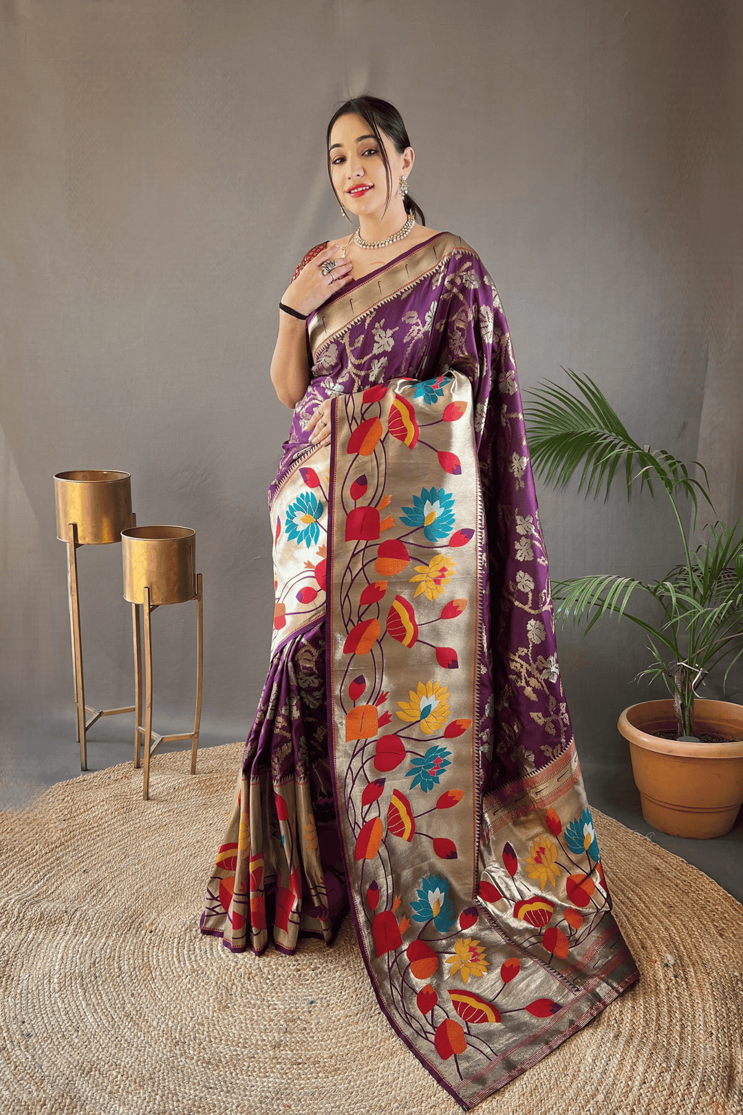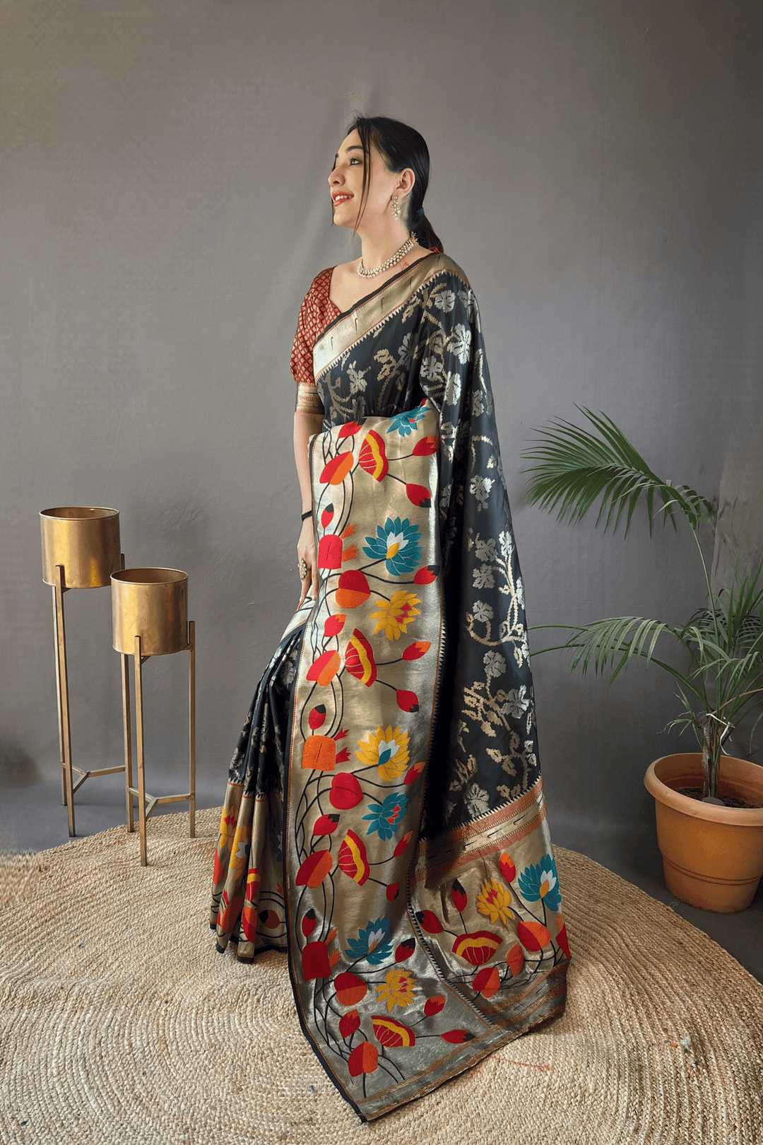 Elevate your style with Ready to Wear Soft Silk Paithani Saree, a stunning fusion of fashion and luxury. Pre Draped saree comes with a 1 Mtr unstitched blouse.The hooks do NOT show up as they are practically invisible. Just wear a petticoat /pant/skirt and you are ready to drape it! Fits from 28" waist upto 42" waist.