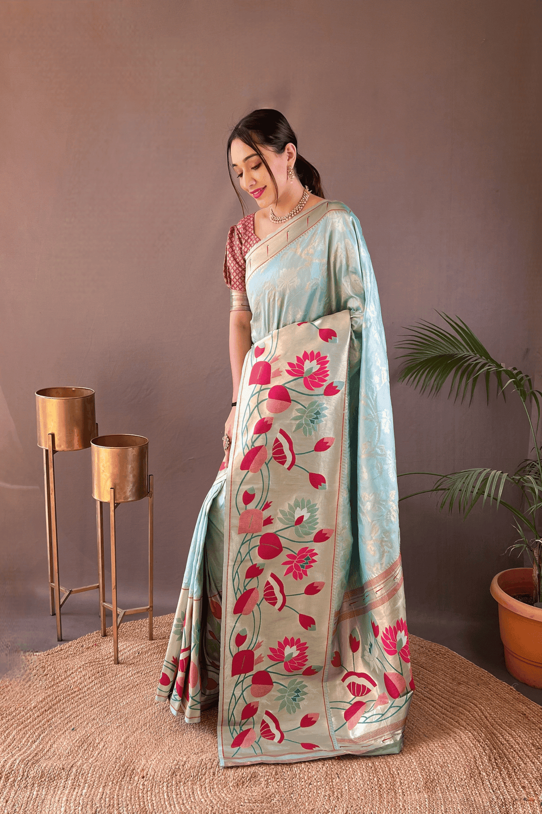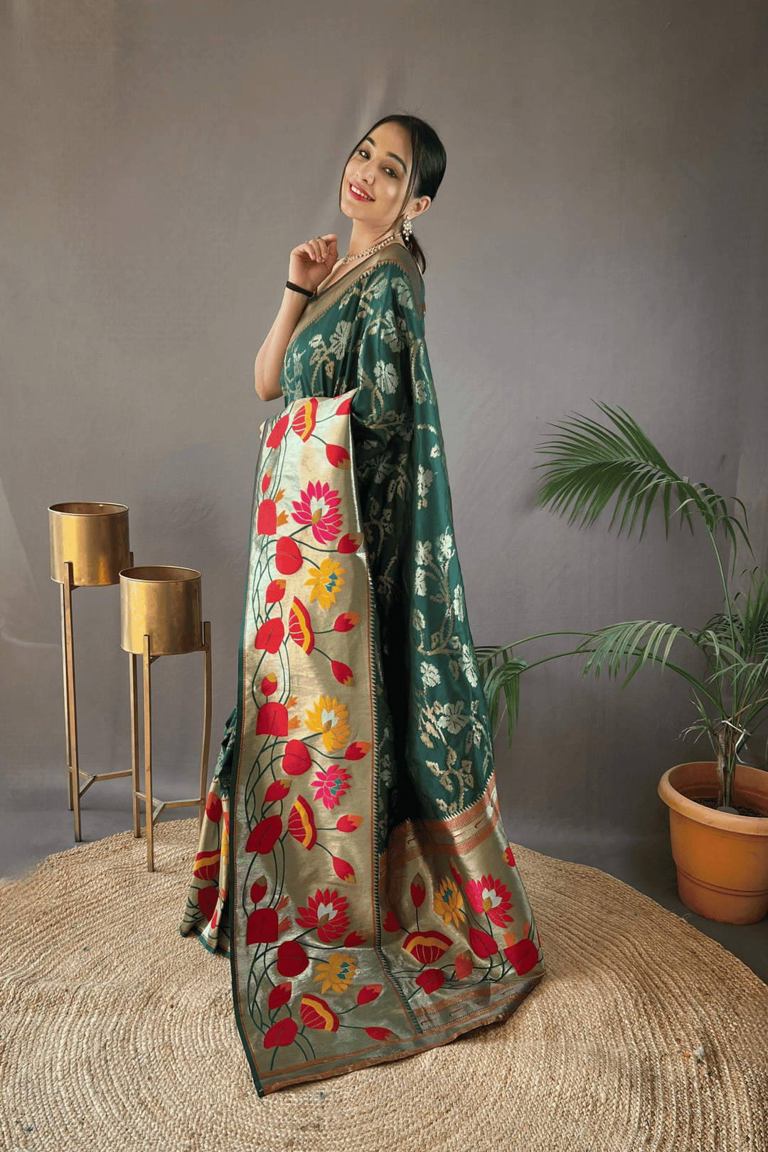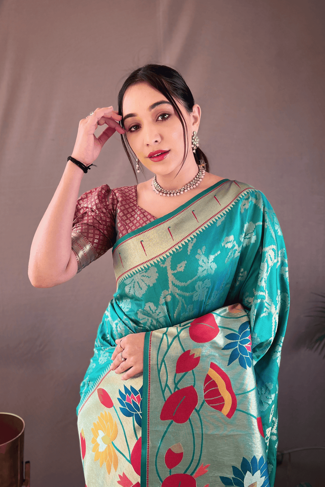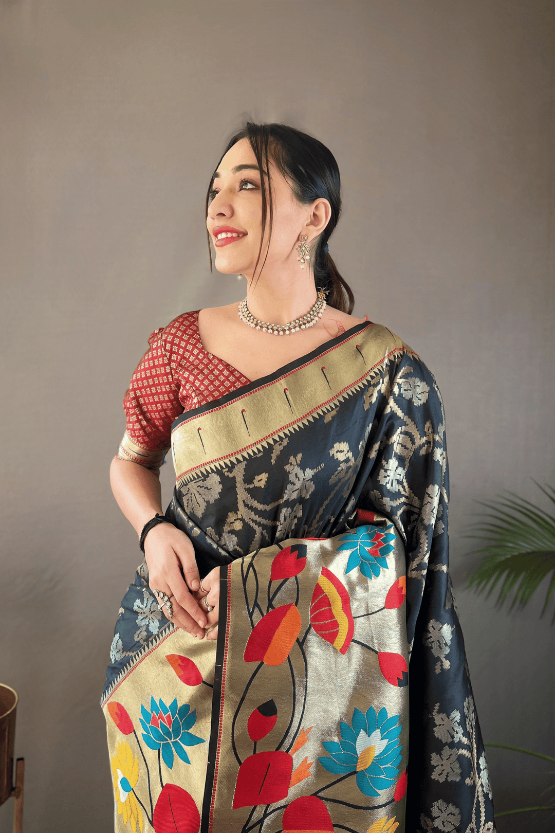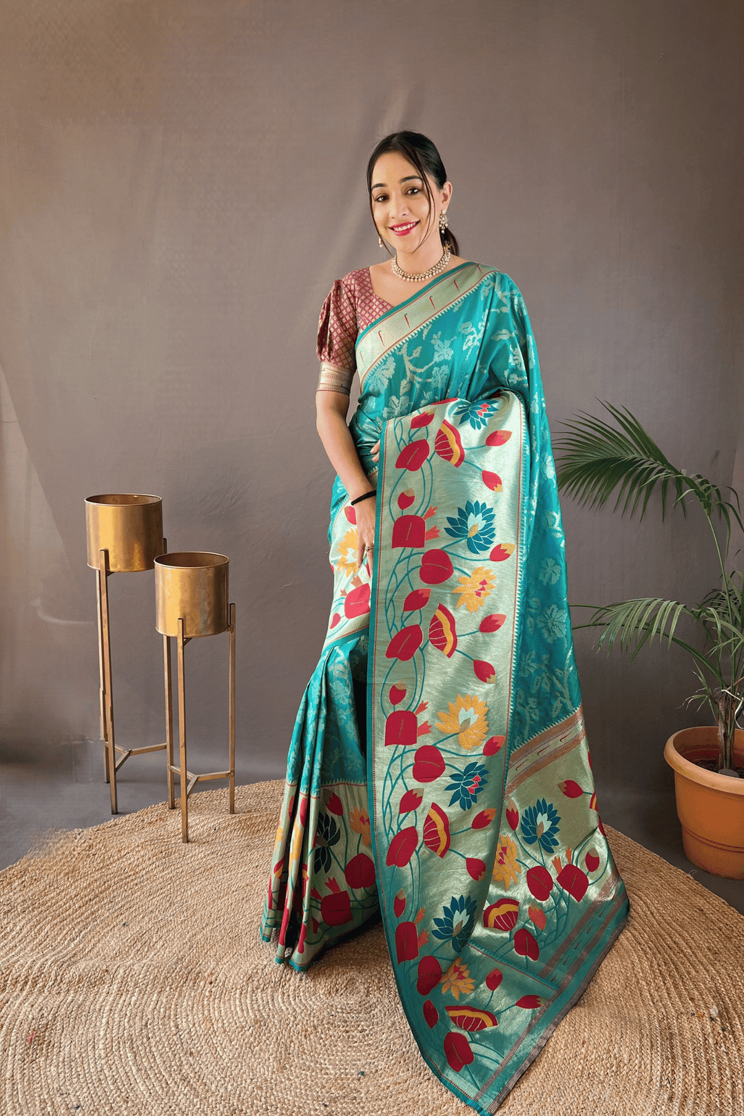 Elevate your style with Ready to Wear Soft Silk Paithani Saree, a stunning fusion of fashion and luxury. Pre Draped saree comes with a 1 Mtr unstitched blouse.The hooks do NOT show up as they are practically invisible. Just wear a petticoat /pant/skirt and you are ready to drape it! Fits from 28" waist upto 42" waist.