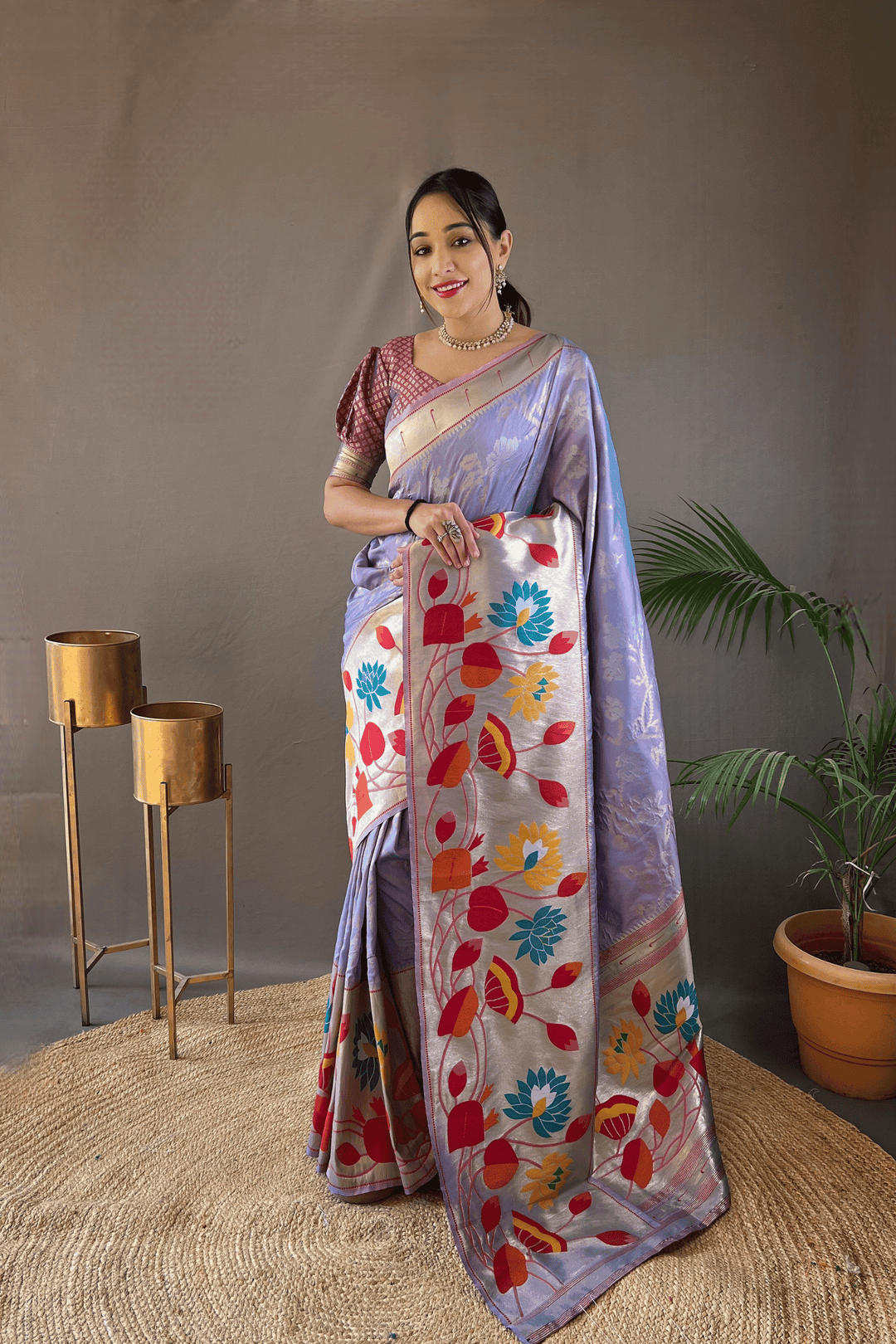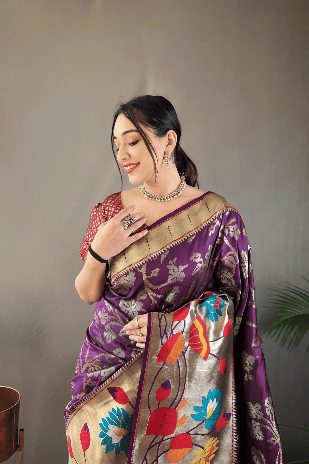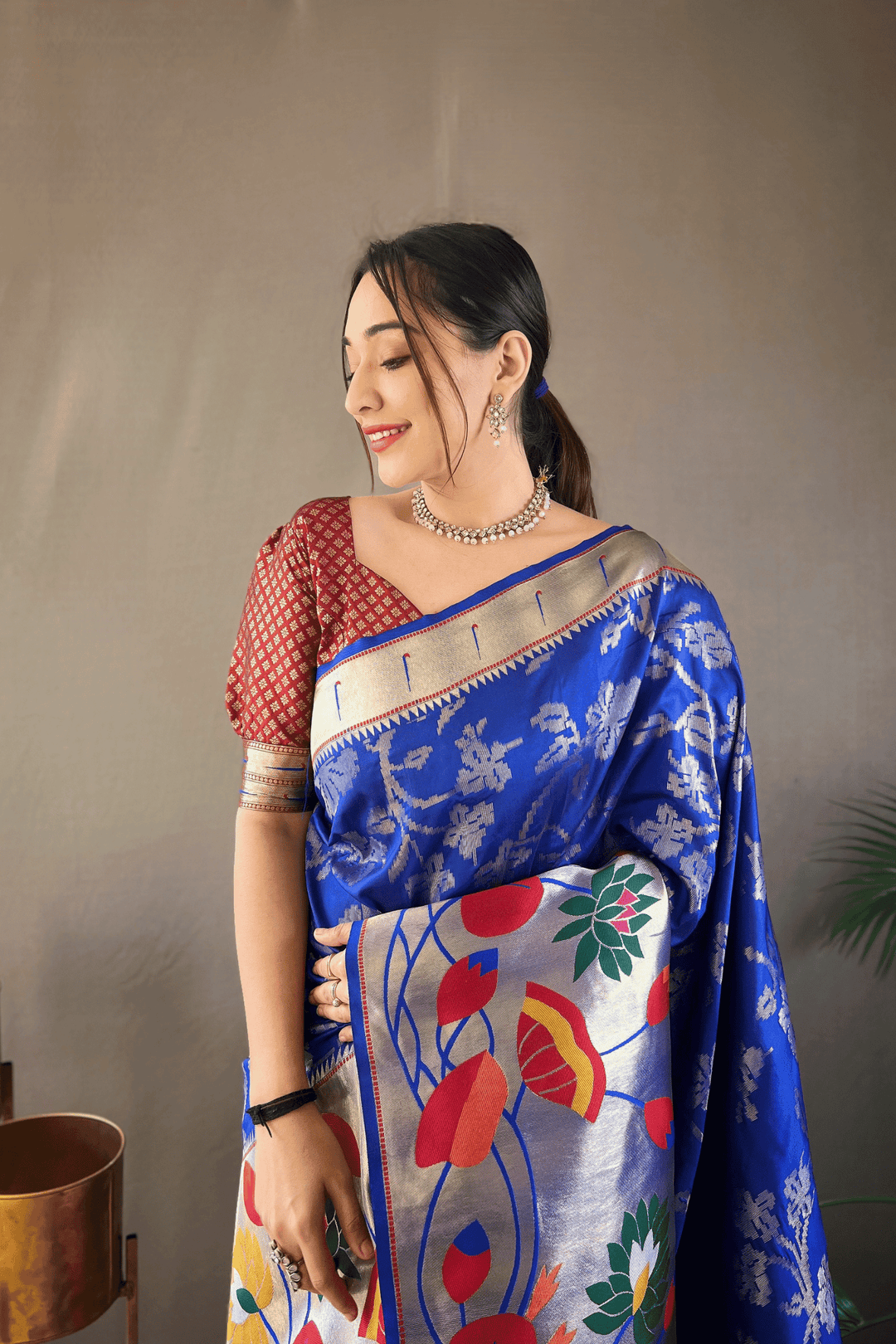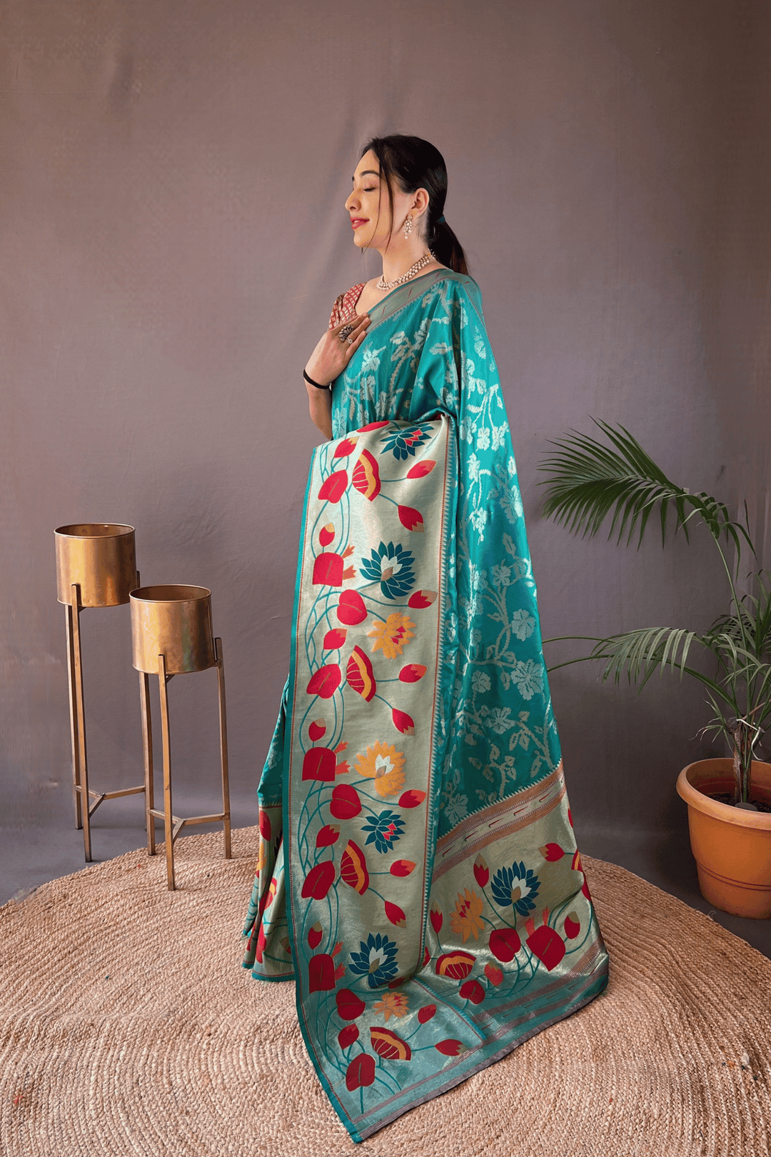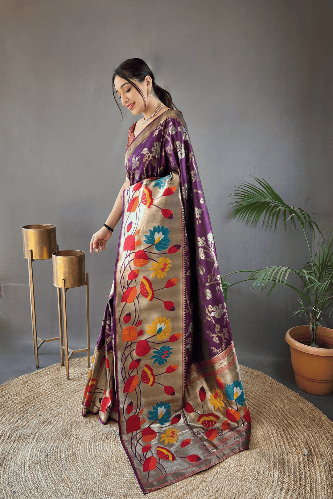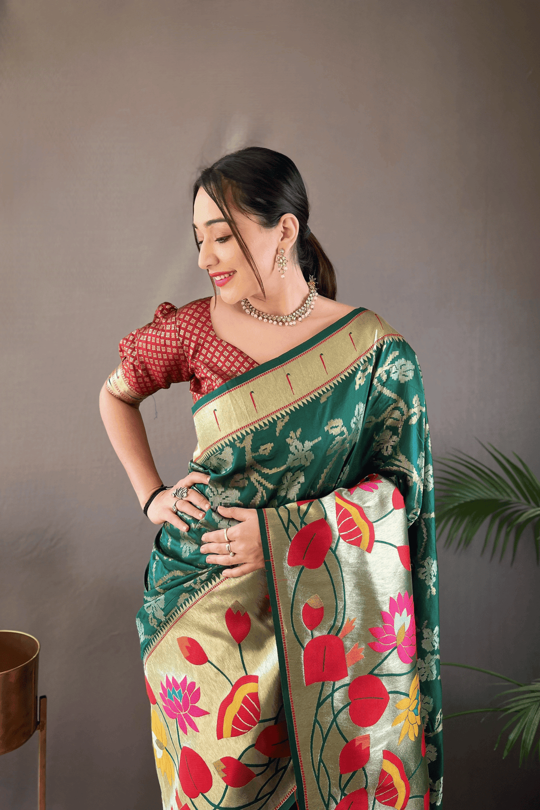 Elevate your style with Ready to Wear Soft Silk Paithani Saree, a stunning fusion of fashion and luxury. Pre Draped saree comes with a 1 Mtr unstitched blouse.The hooks do NOT show up as they are practically invisible. Just wear a petticoat /pant/skirt and you are ready to drape it! Fits from 28" waist upto 42" waist.