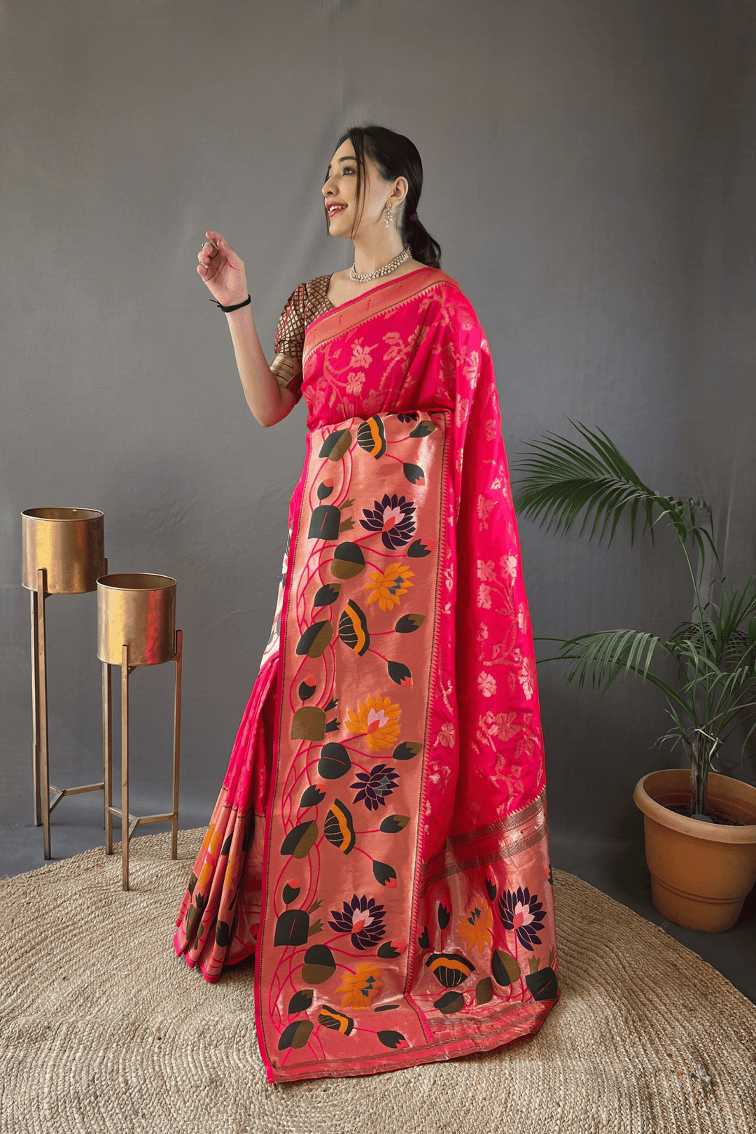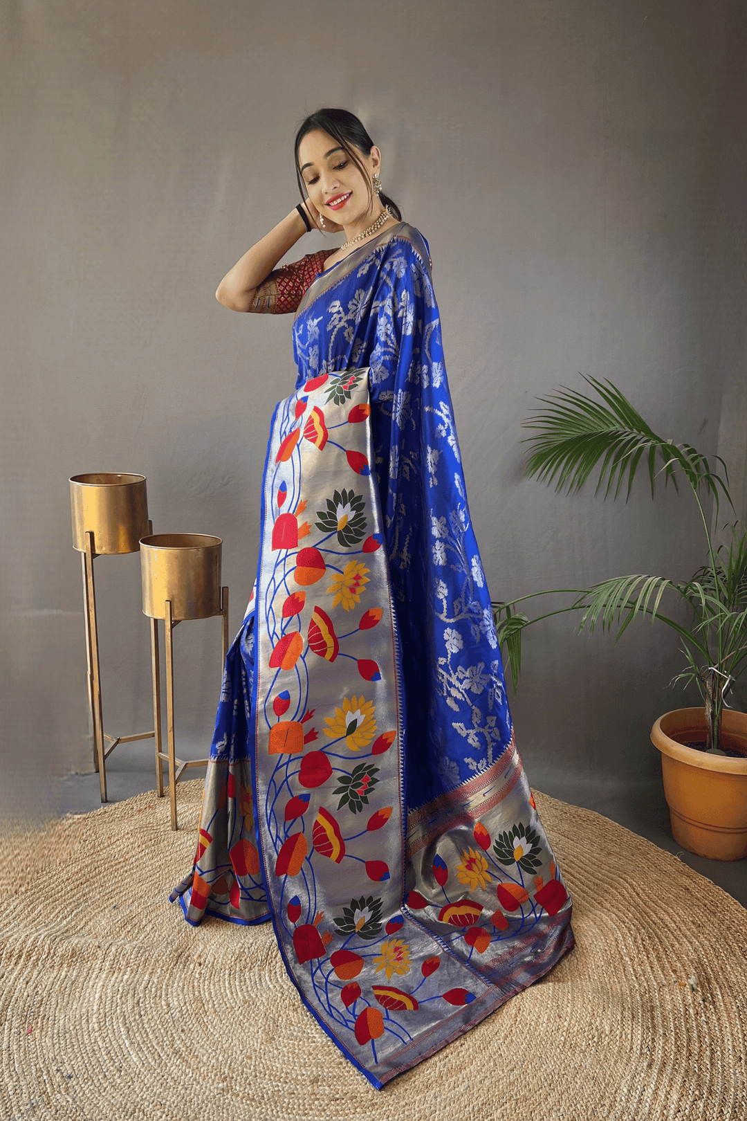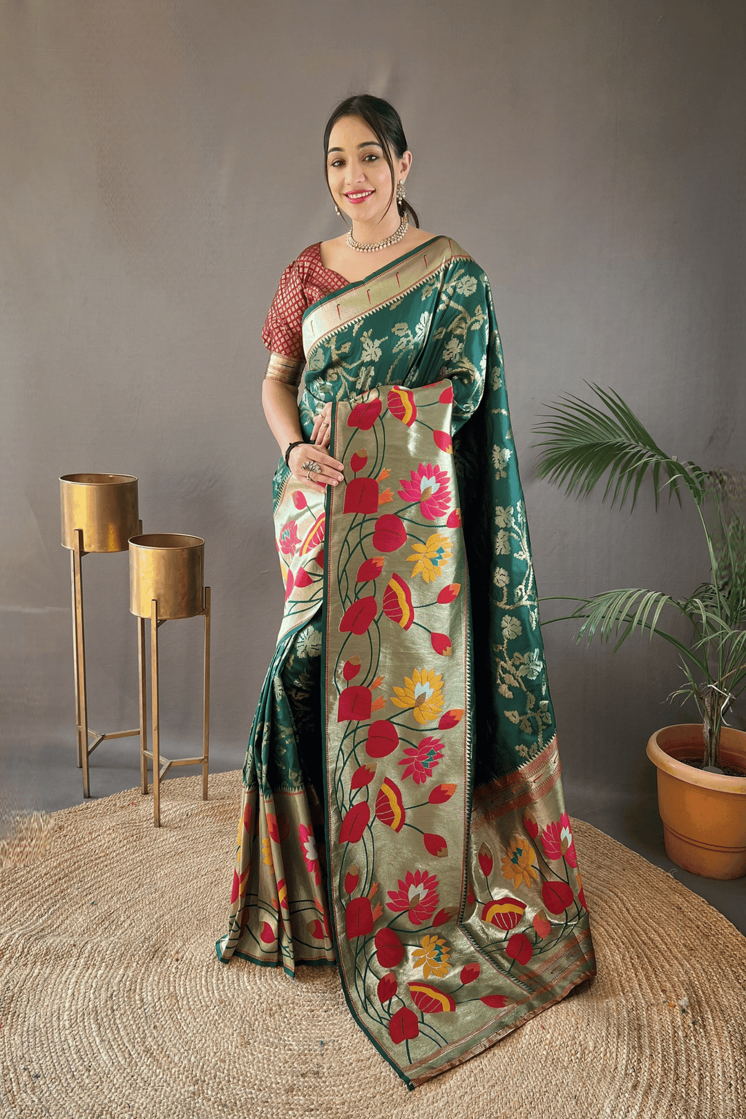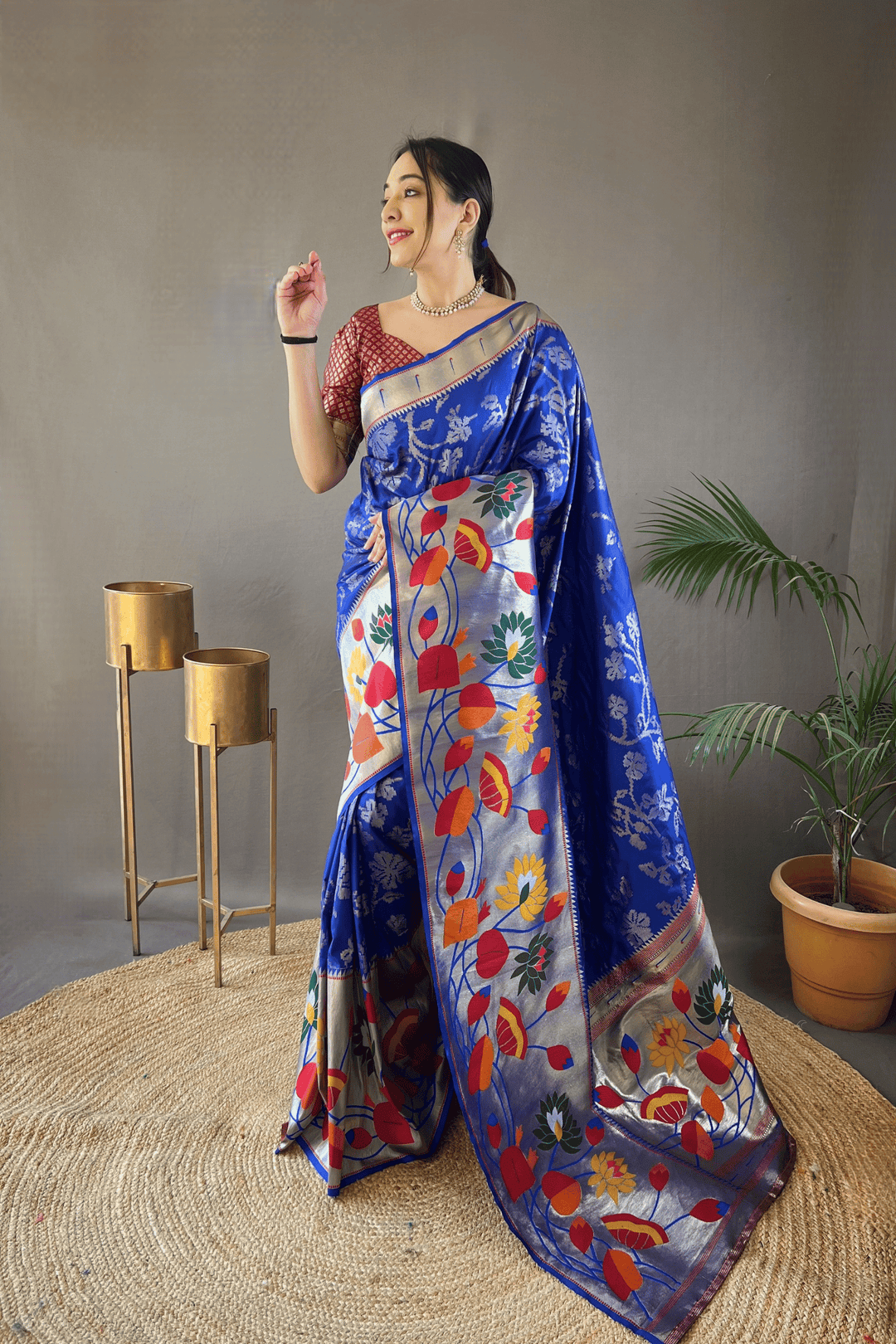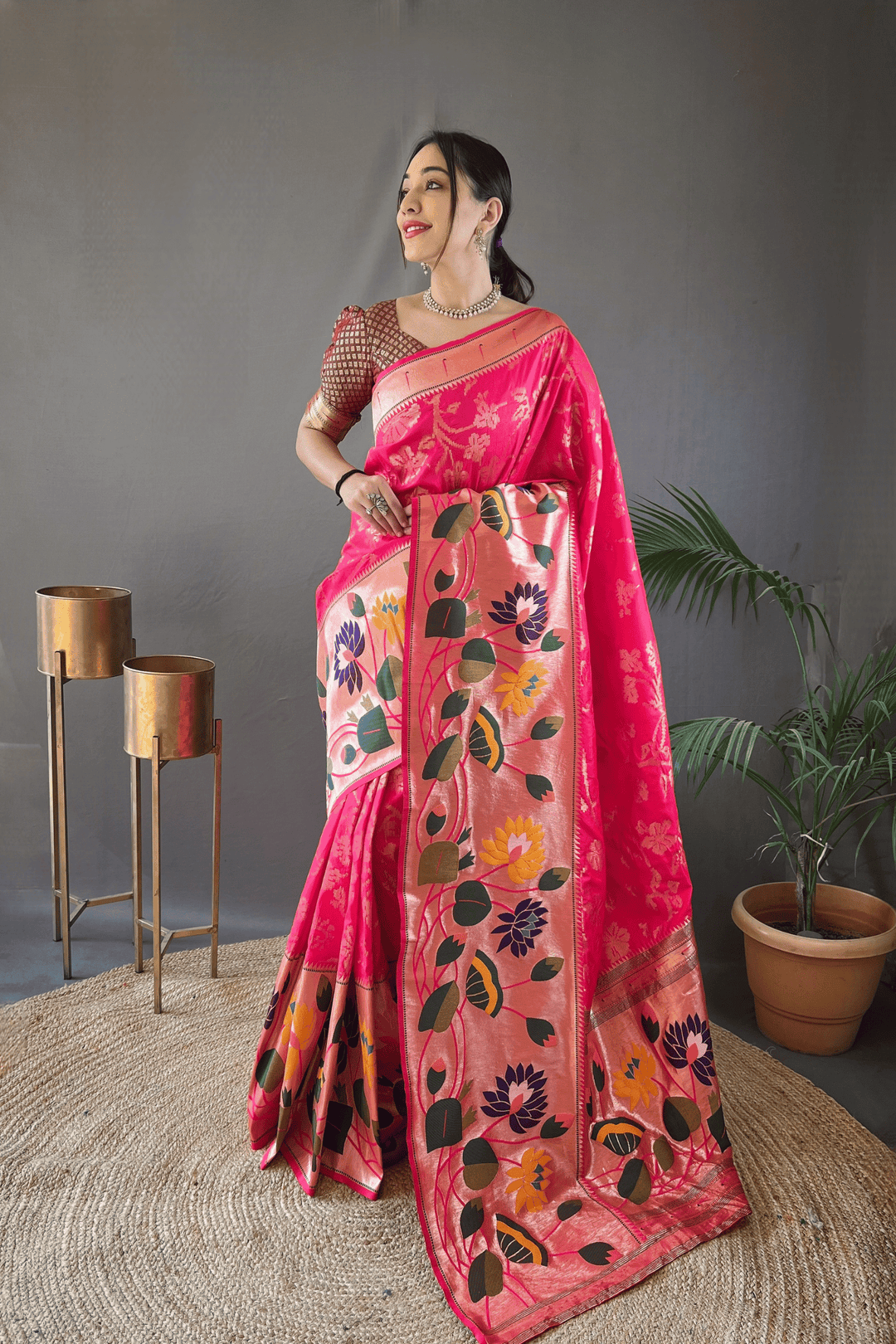 Elevate your style with Ready to Wear Soft Silk Paithani Saree, a stunning fusion of fashion and luxury. Pre Draped saree comes with a 1 Mtr unstitched blouse.The hooks do NOT show up as they are practically invisible. Just wear a petticoat /pant/skirt and you are ready to drape it! Fits from 28" waist upto 42" waist.
