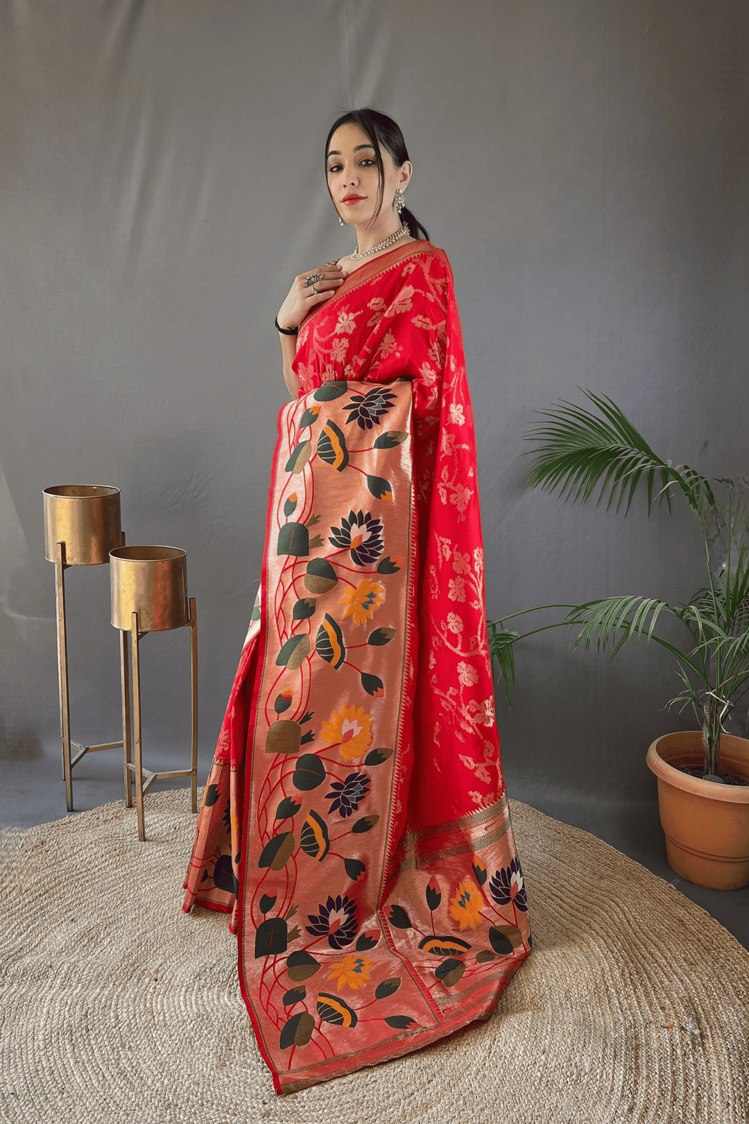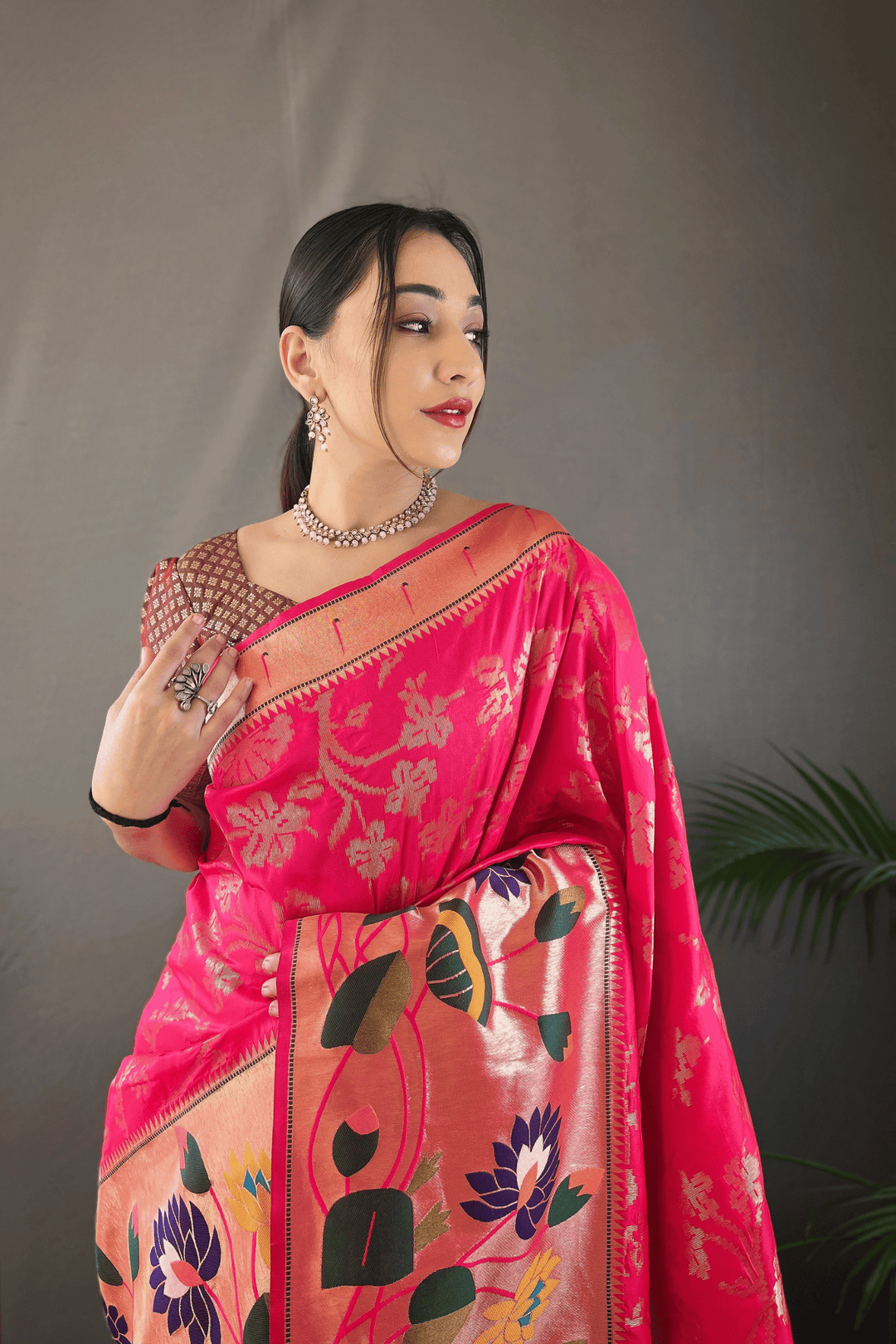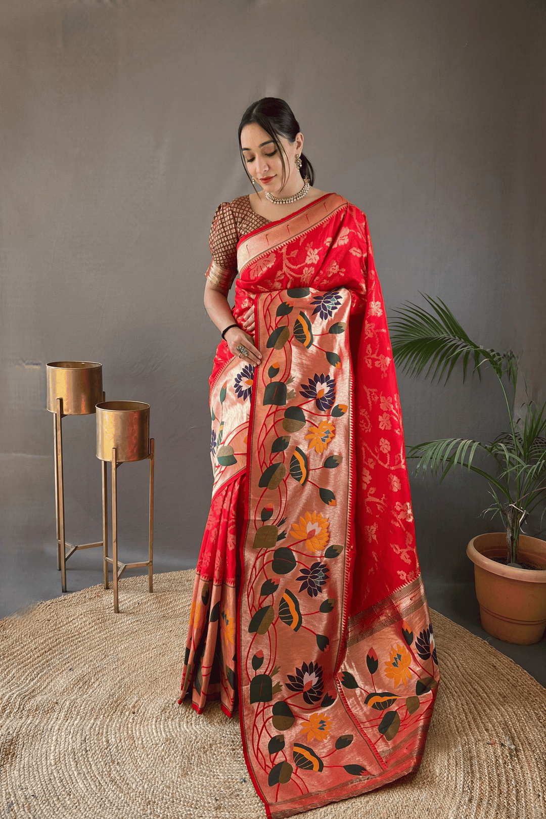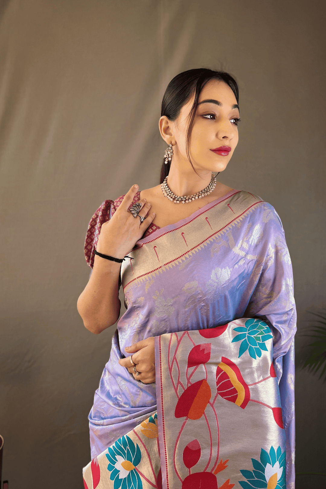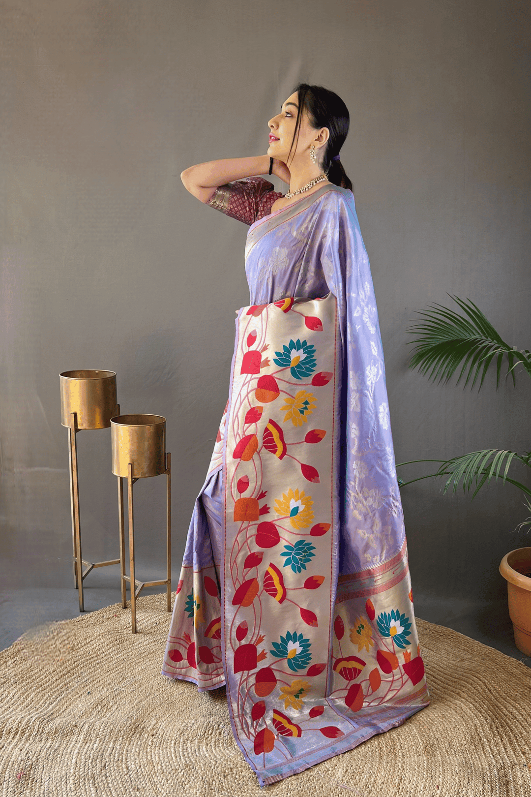 Elevate your style with Ready to Wear Soft Silk Paithani Saree, a stunning fusion of fashion and luxury. Pre Draped saree comes with a 1 Mtr unstitched blouse.The hooks do NOT show up as they are practically invisible. Just wear a petticoat /pant/skirt and you are ready to drape it! Fits from 28" waist upto 42" waist.