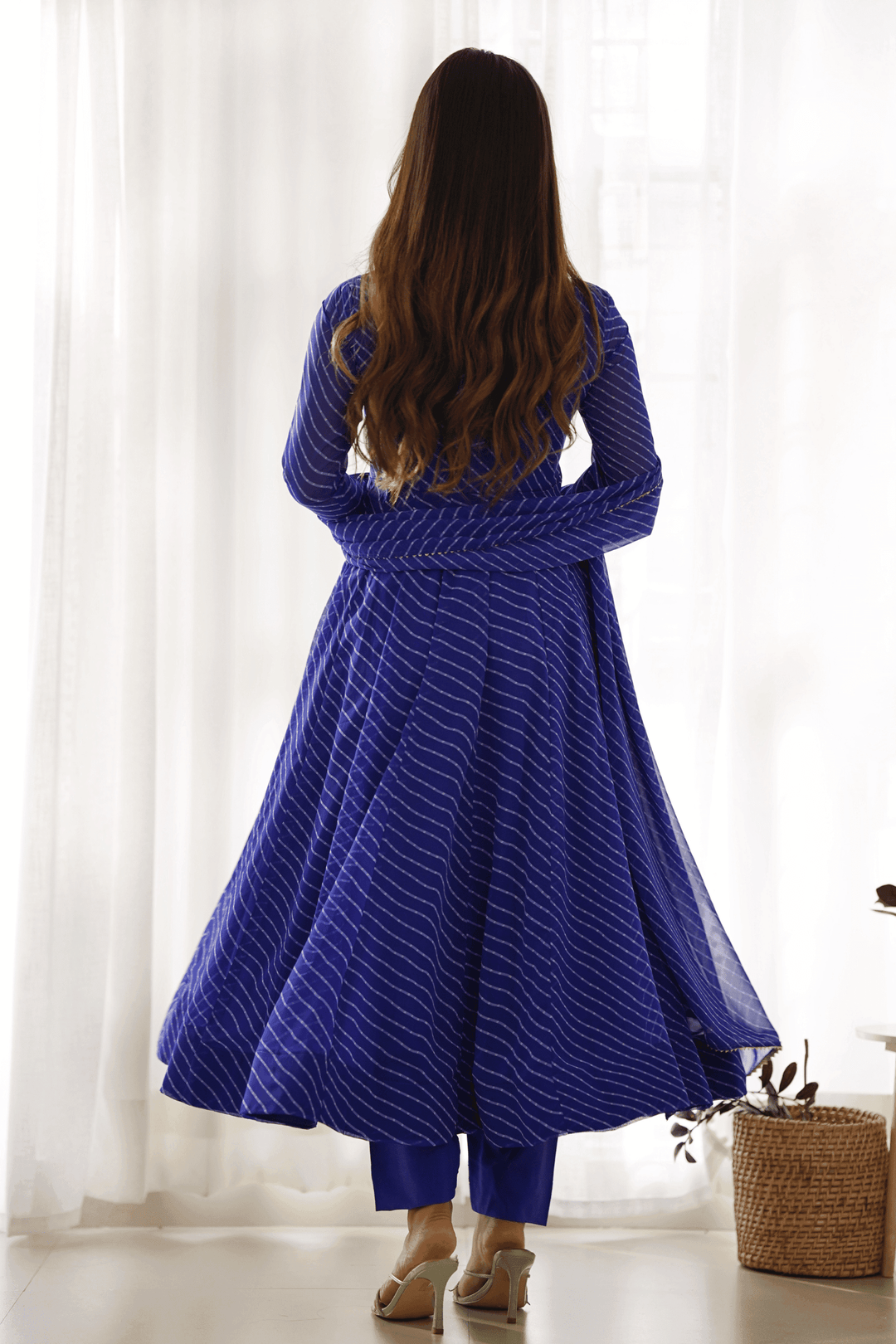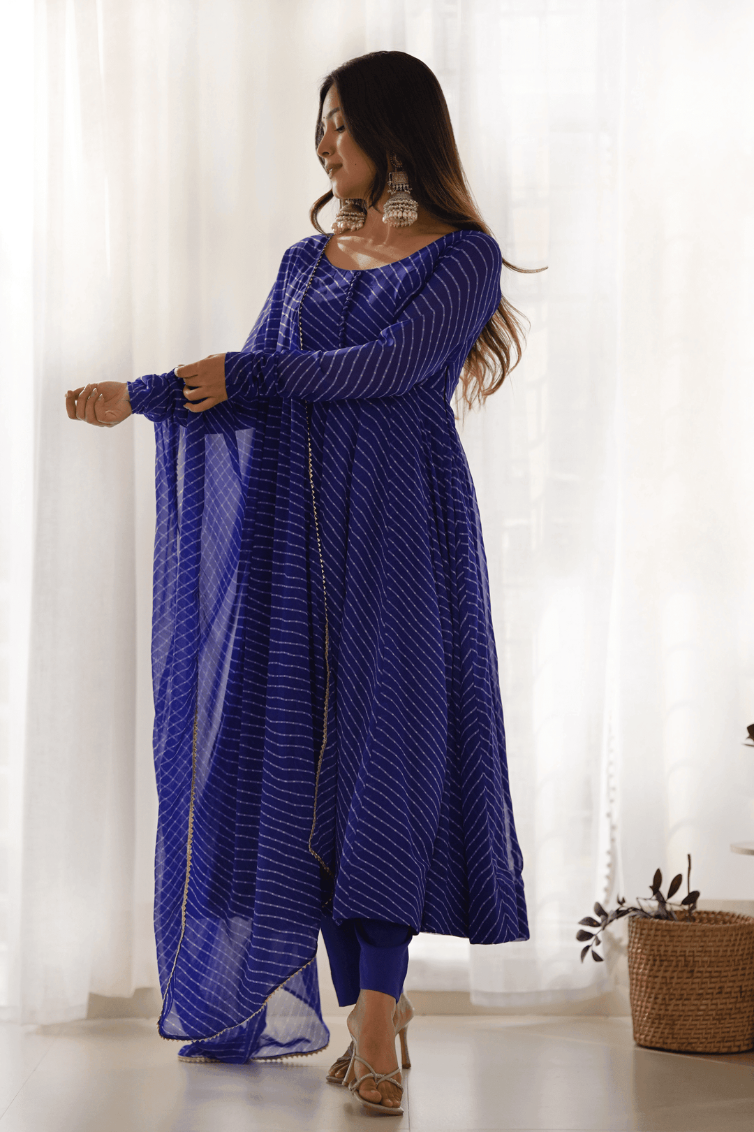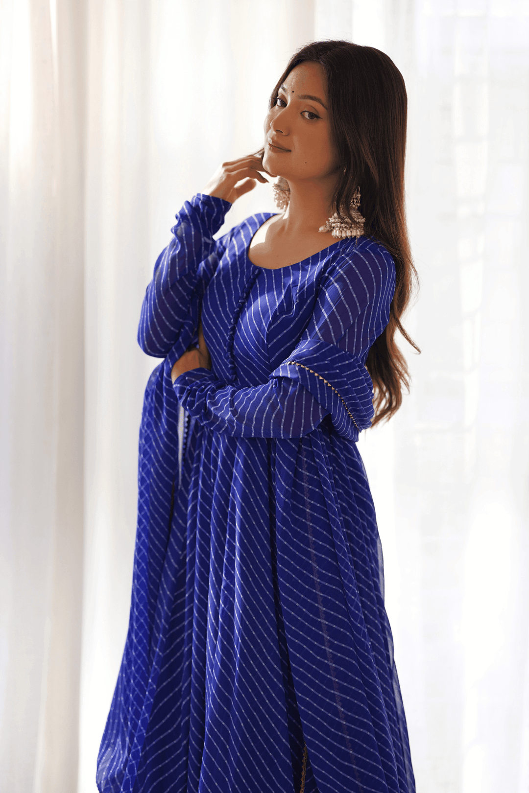 Introducing Glamwiz Royal Blue Leheriya Print Anarkali Suit, a blend of sophistication and allure. The deep, rich tones blend seamlessly, creating a stunning and sophisticated look.