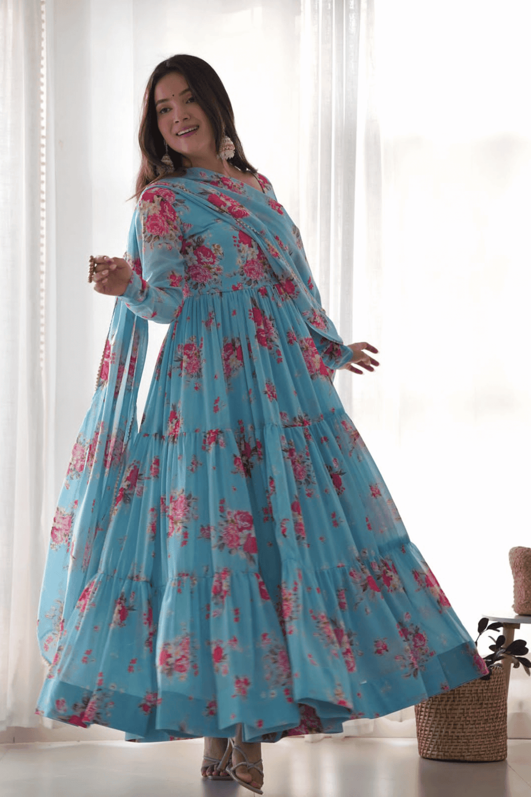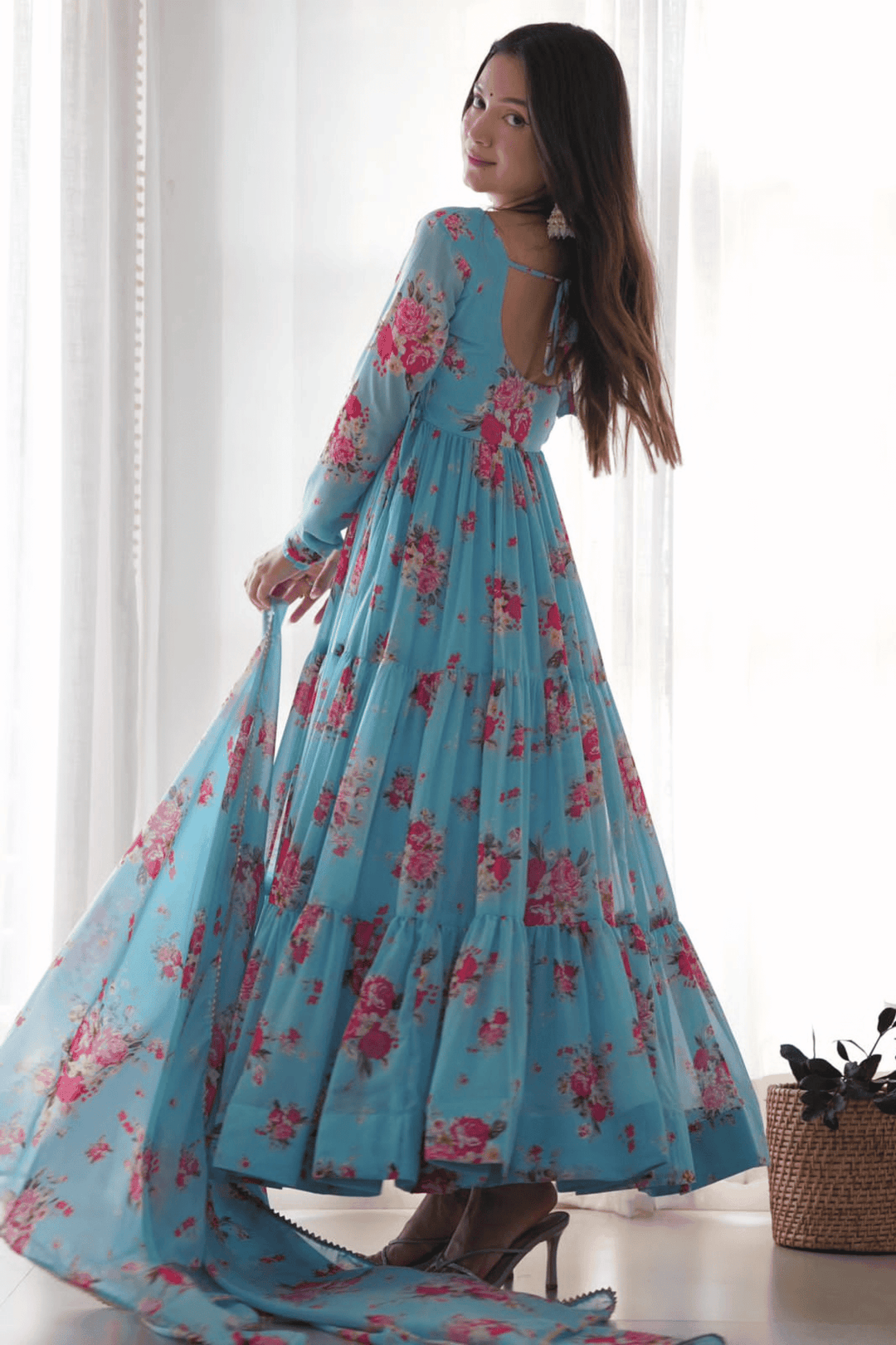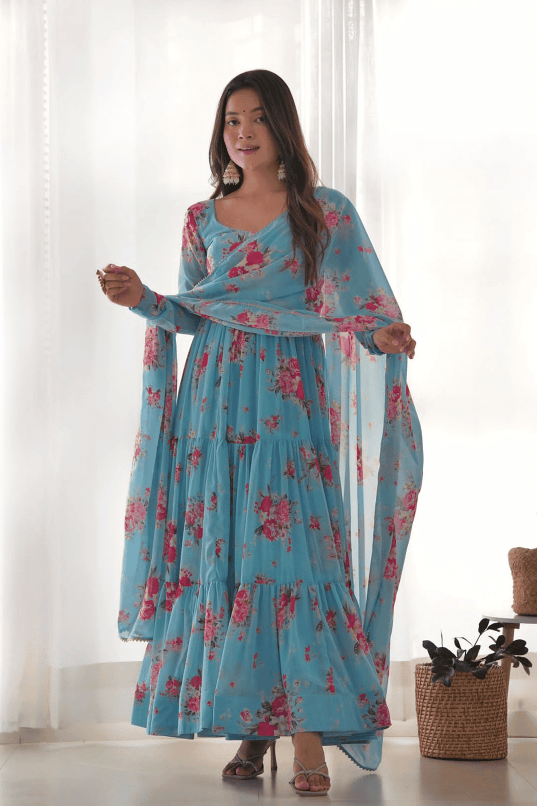 Introducing Glamwiz Sky Blue Floral Print Anarkali Suit, This colorful floral printed outfit is the perfect blend of tradition and contemporary style, ideal for upcoming festivities and weddings.
