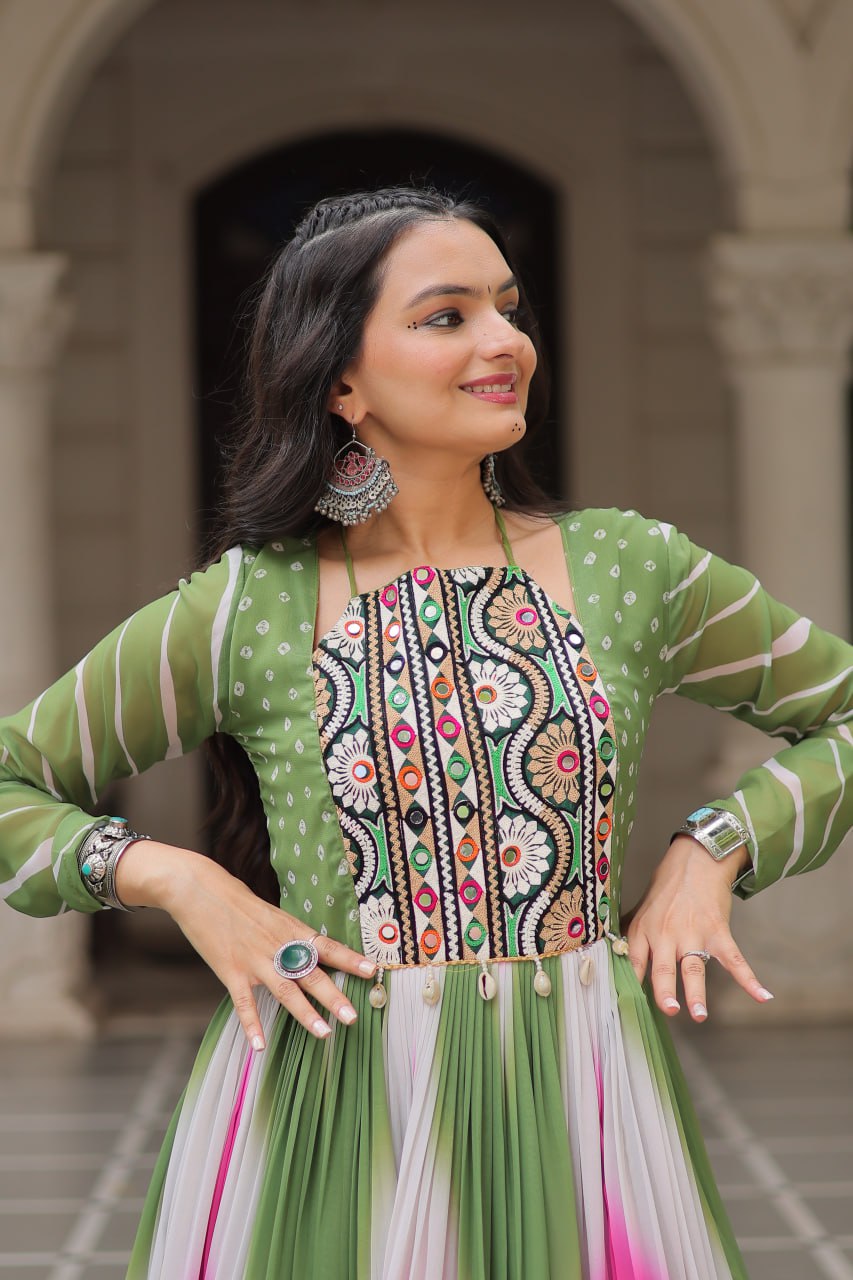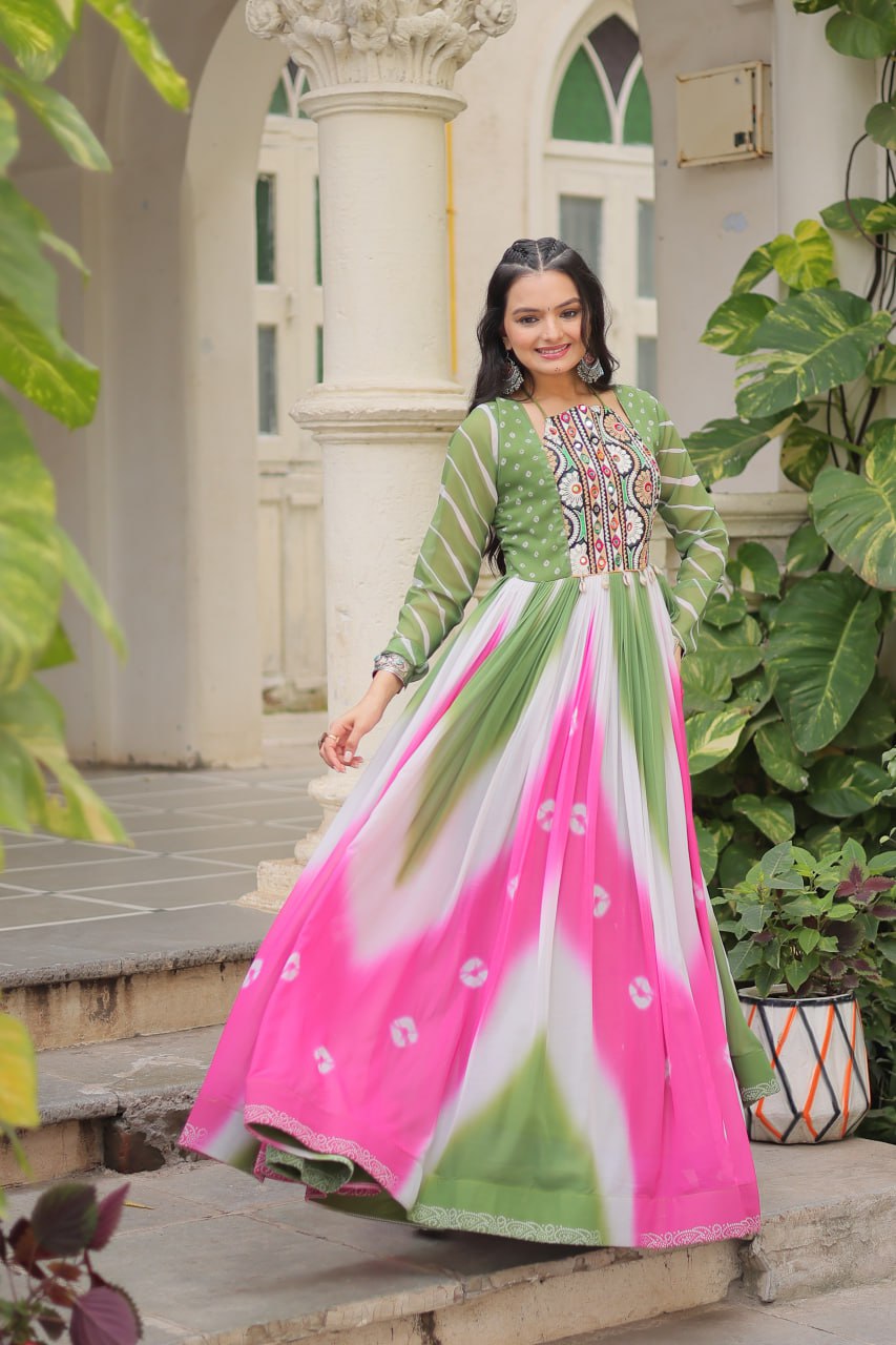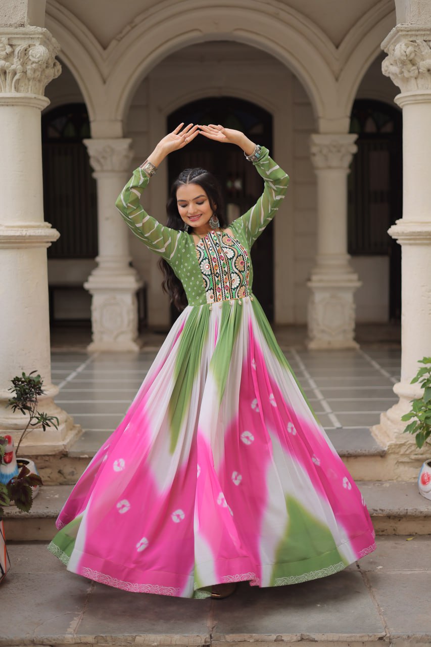 Adorn yourself in elegance with the Glamwiz Bandhej Printed Anarkali Gown.