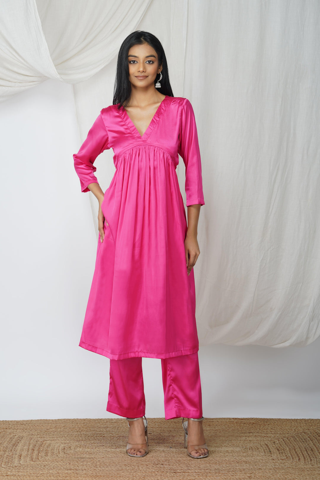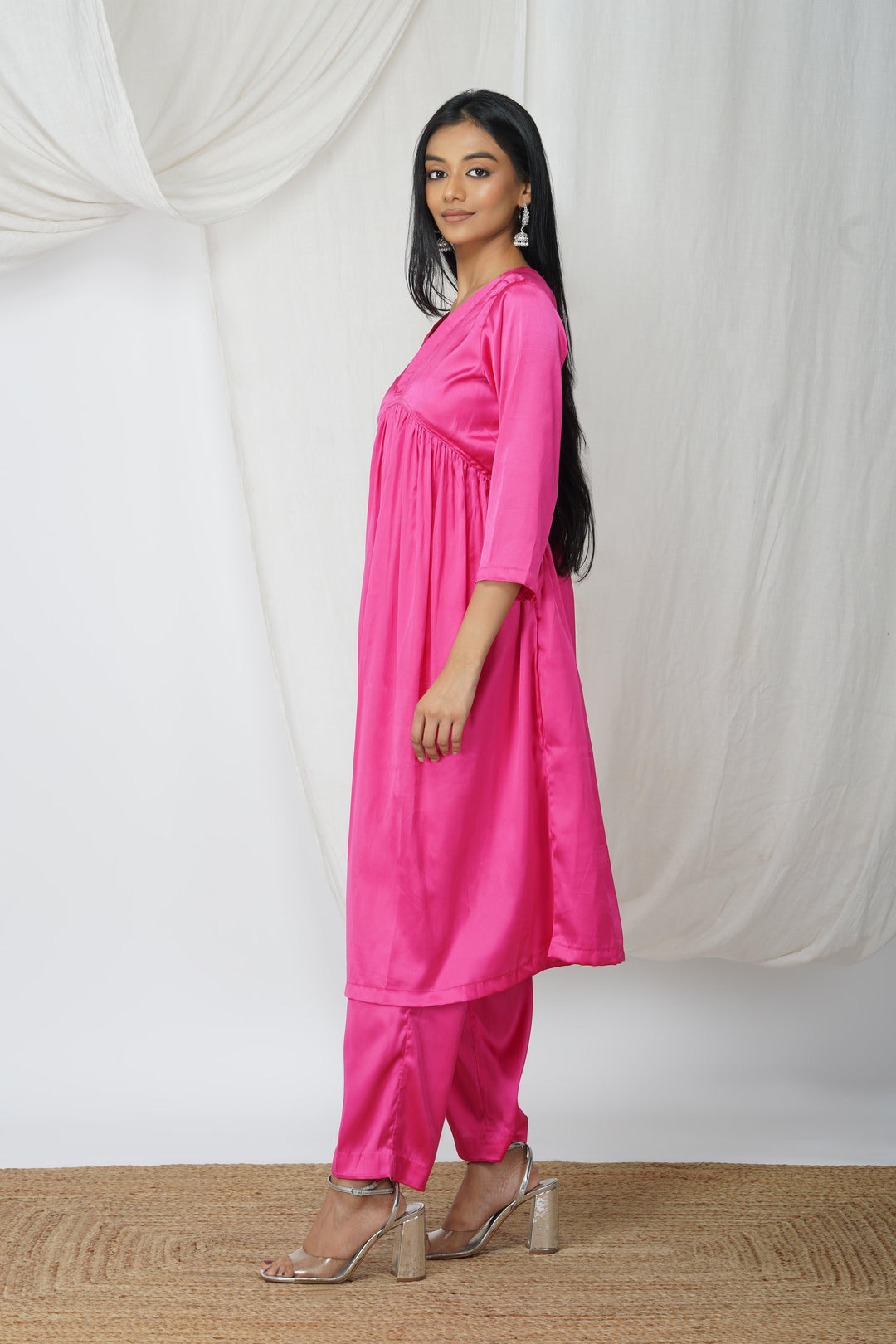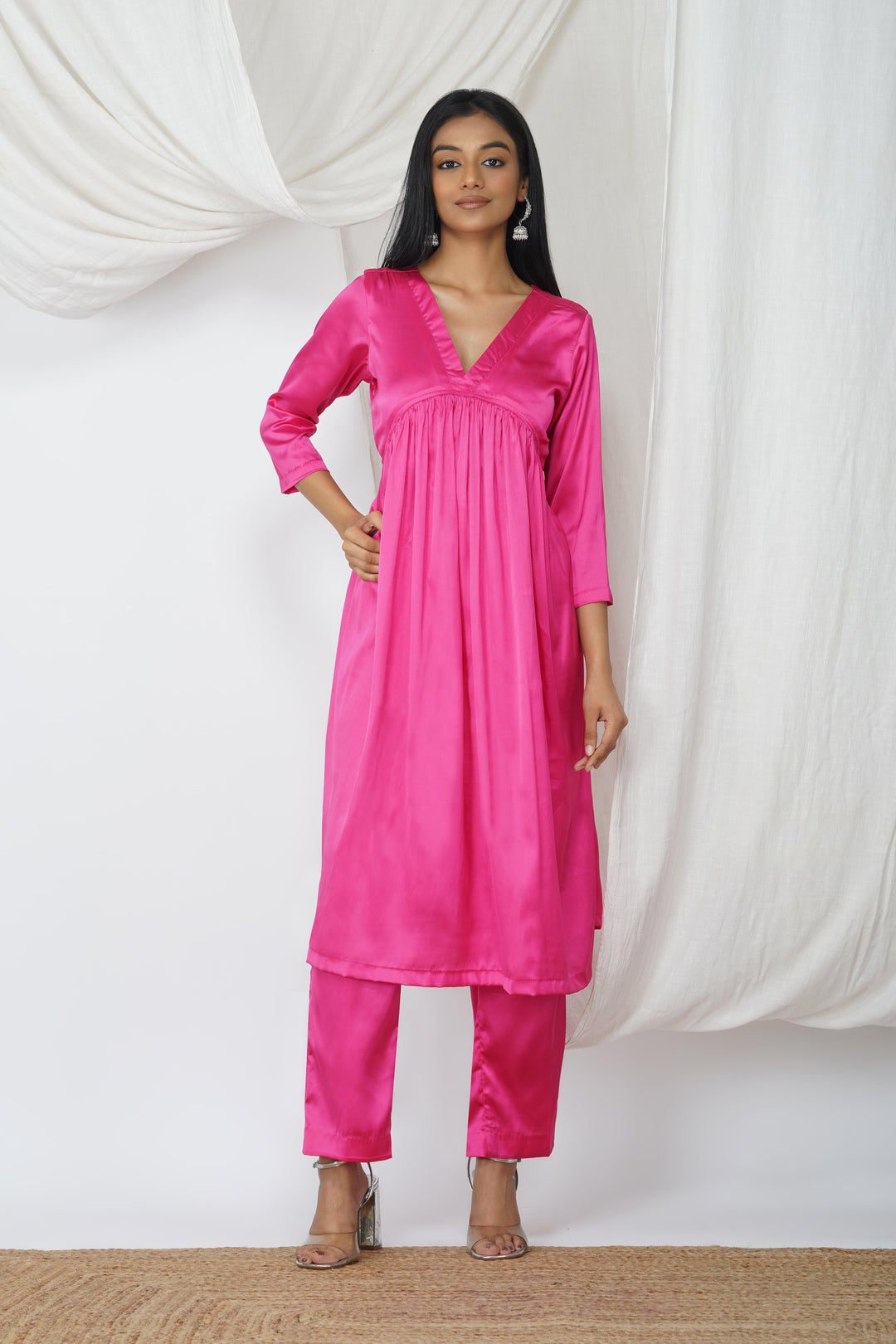 Make a bold statement with the Fuchsia Satin Coord Set. This vibrant ensemble features an empire waist kurti and matching pants, crafted from luxurious satin fabric for a silky, smooth feel. The fuchsia hue creates a striking and eye-catching look, perfect for special occasions or festive celebrations.