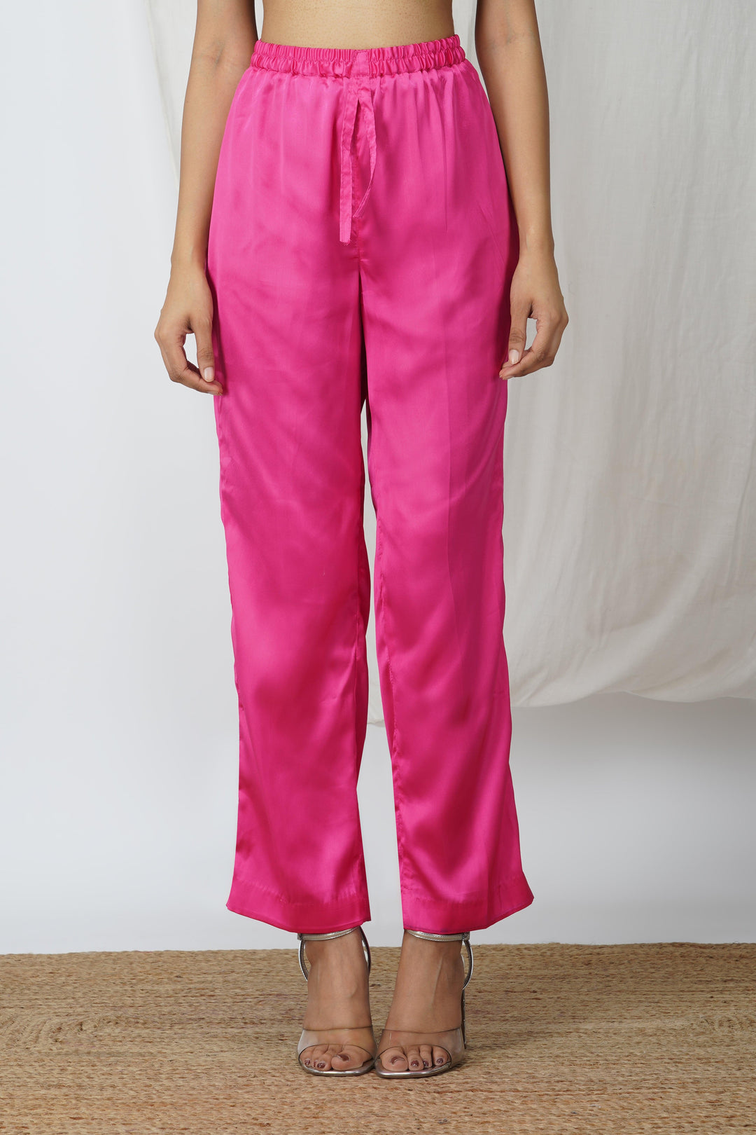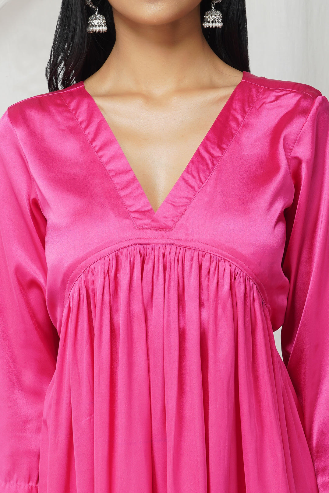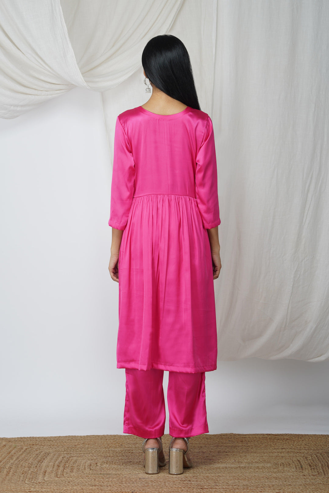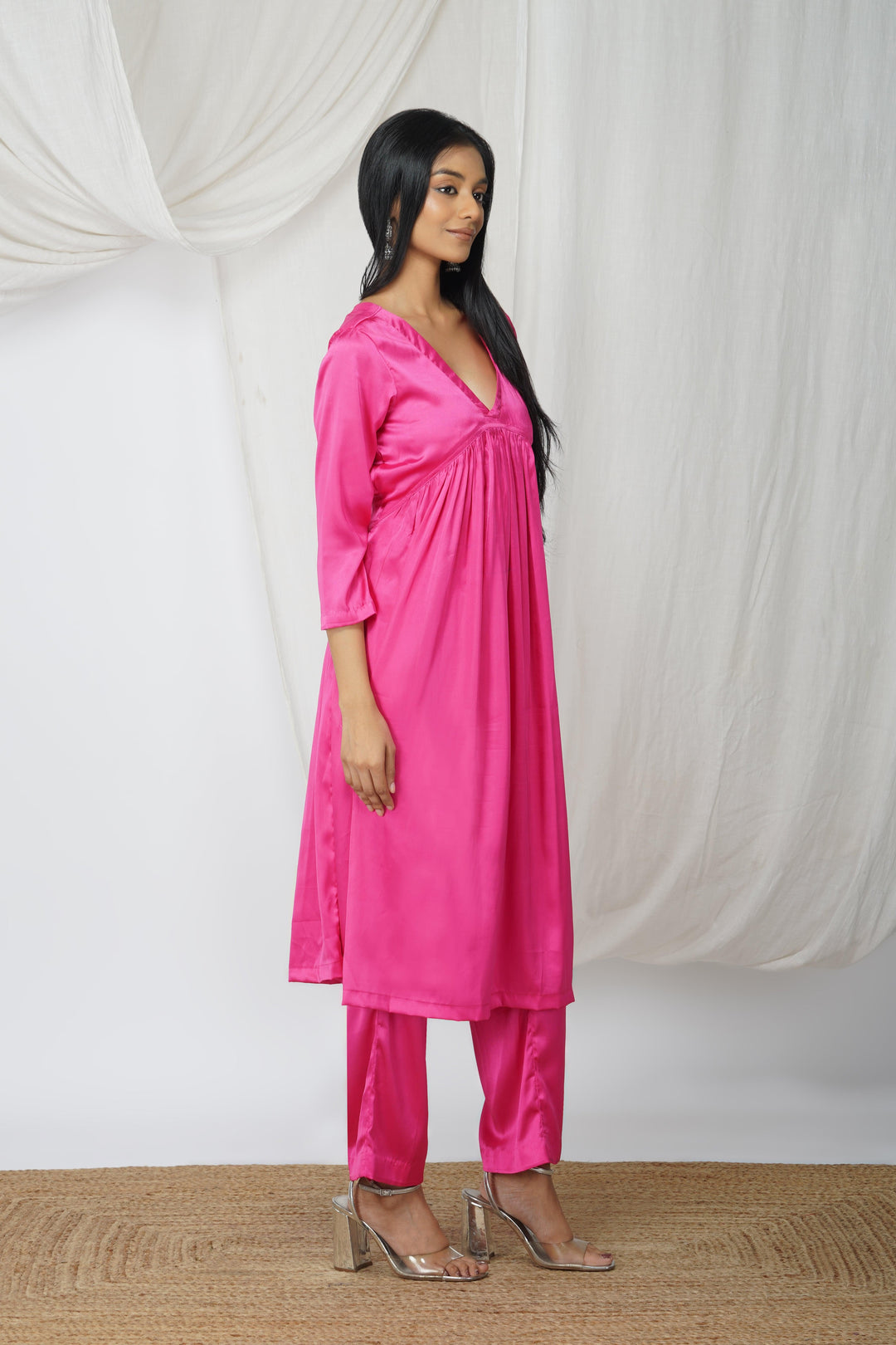 Make a bold statement with the Fuchsia Satin Coord Set. This vibrant ensemble features an empire waist kurti and matching pants, crafted from luxurious satin fabric for a silky, smooth feel. The fuchsia hue creates a striking and eye-catching look, perfect for special occasions or festive celebrations.