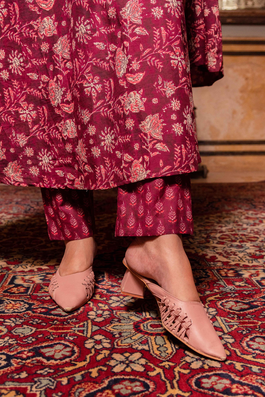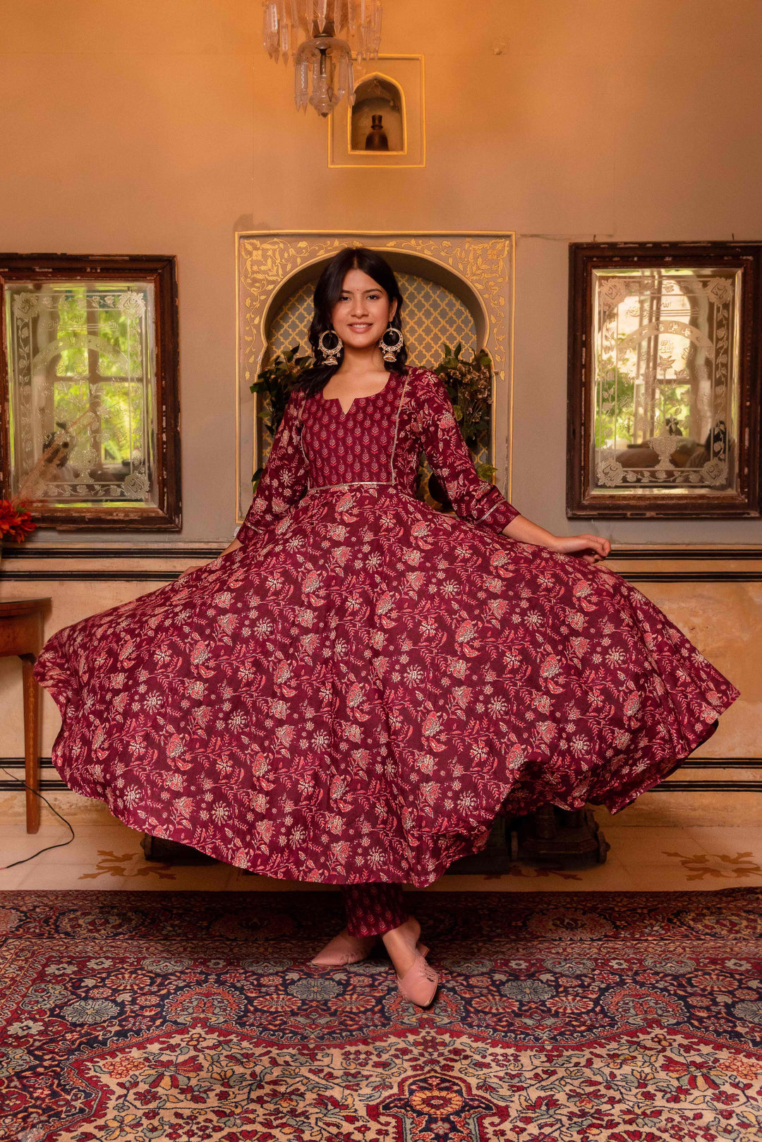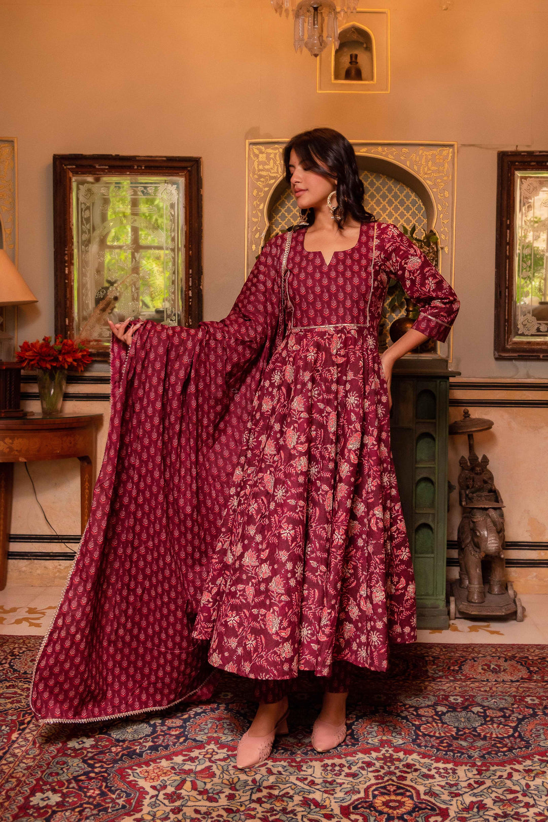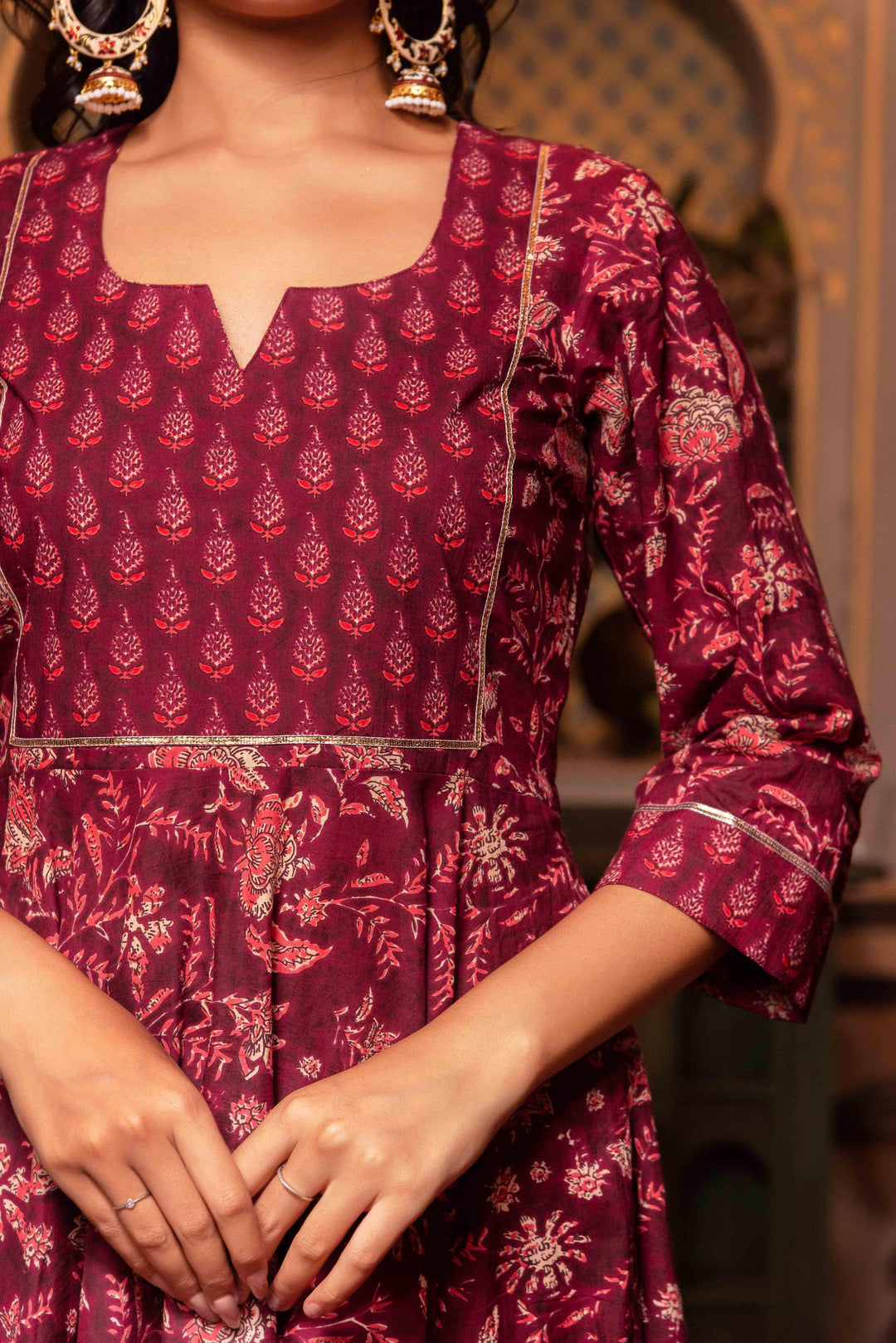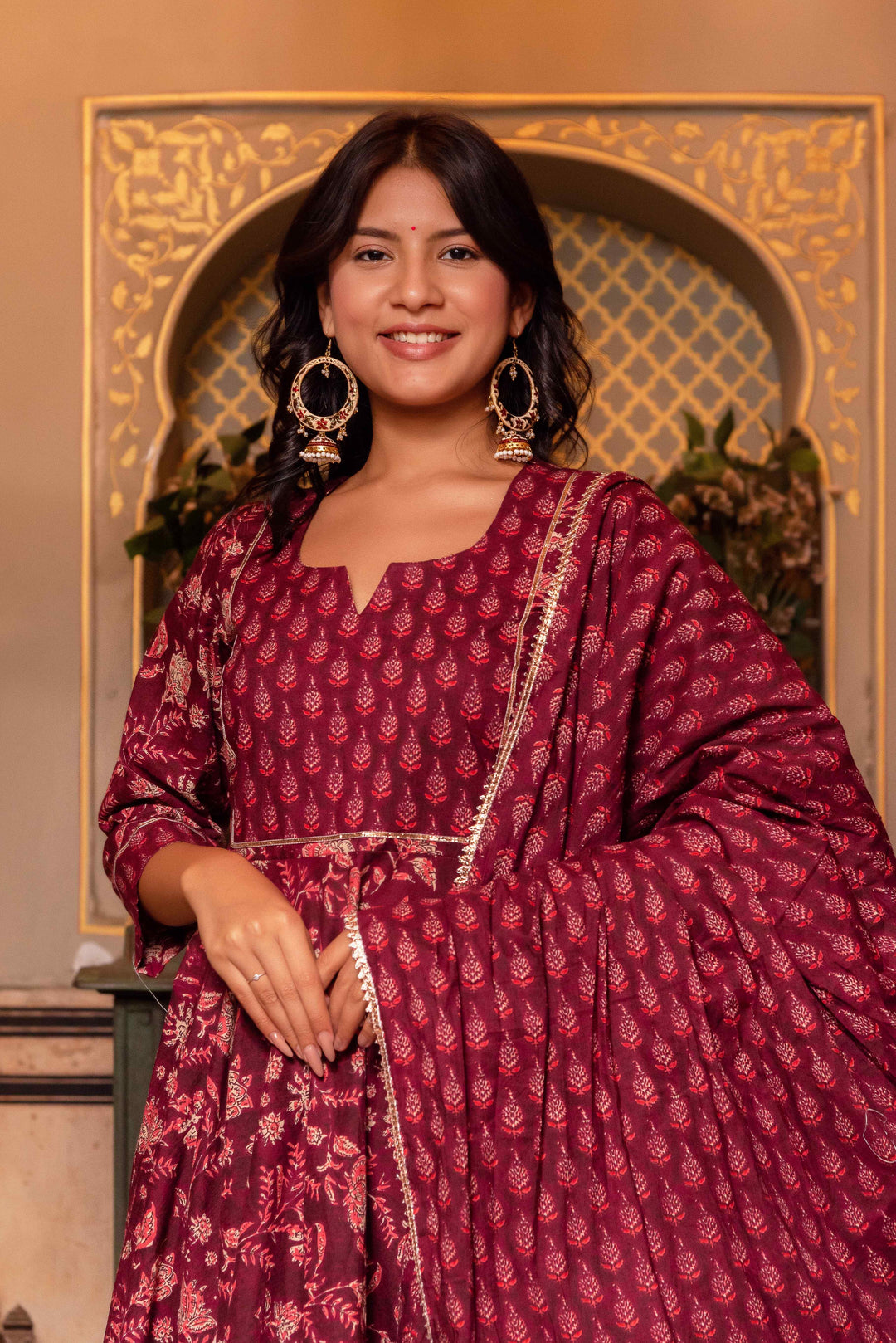 Maroon Hand Block Print Cotton Anarkali Set
