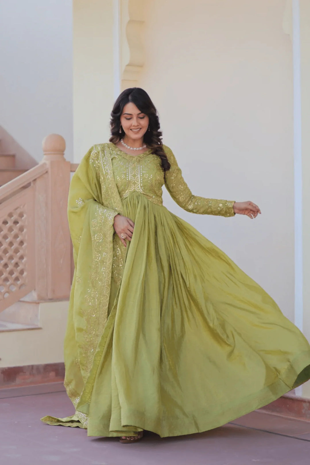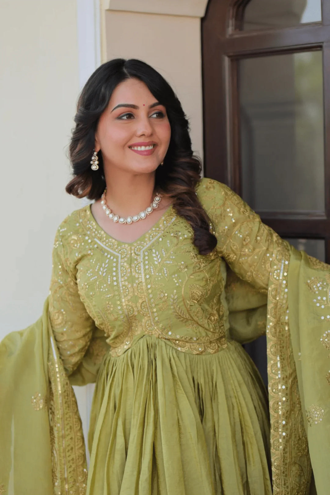 Step into a world of timeless elegance with Olive Heirloom, a graceful olive green Anarkali set adorned with delicate golden embroidery. Paired with a detailed dupatta, this ensemble blends royal aesthetics with breezy comfort — perfect for mehendi functions, day weddings, or festive brunches.