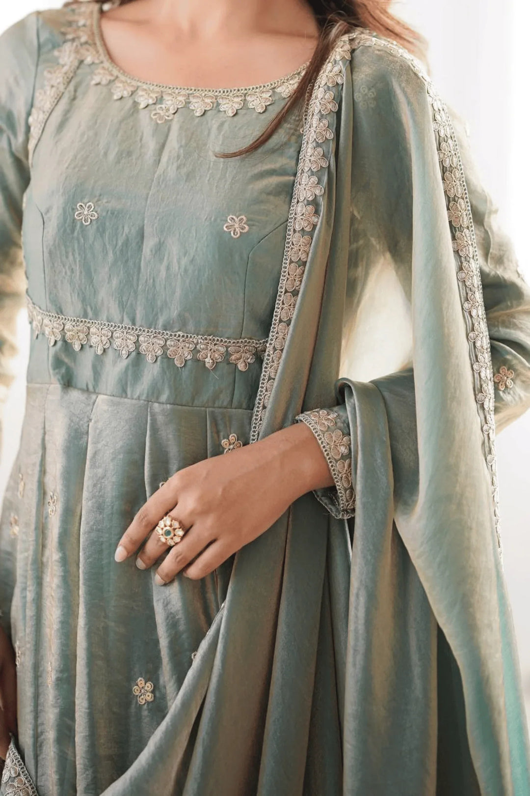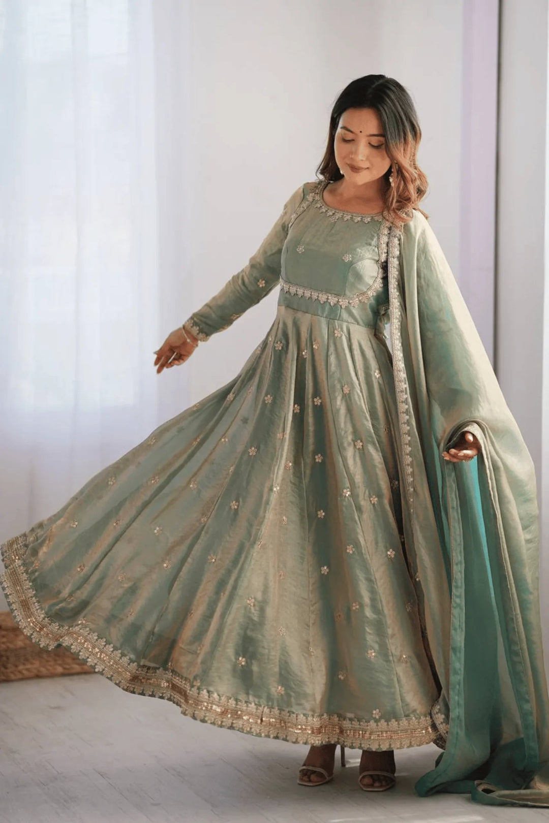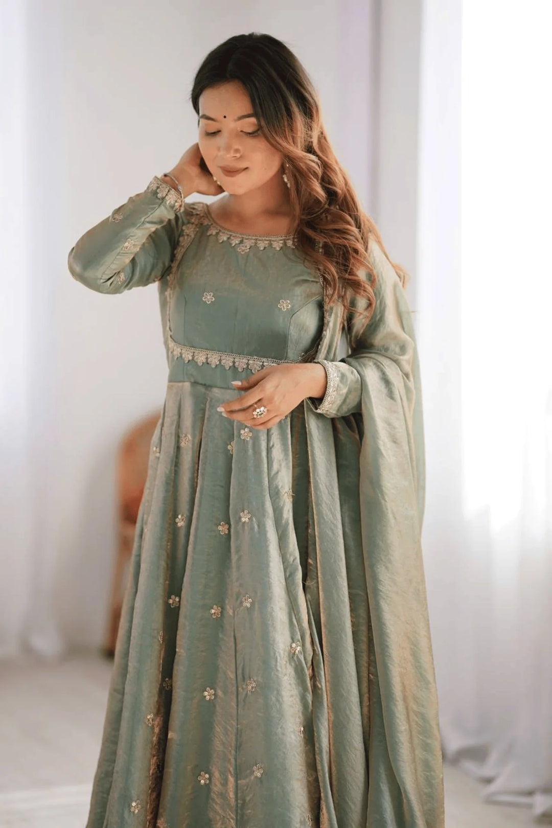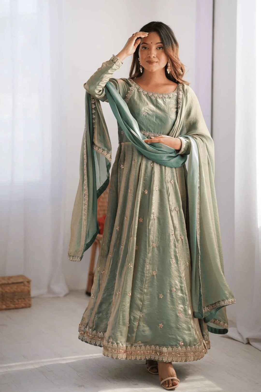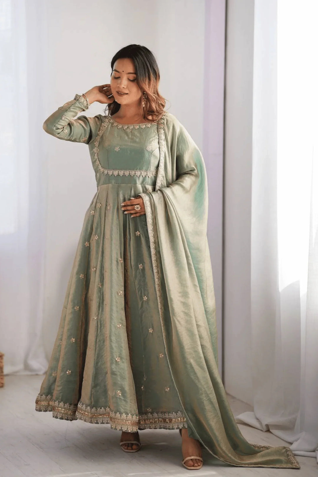 Adorn yourself in elegance with the Glamwiz Silken Whispers Anarkali Gown.