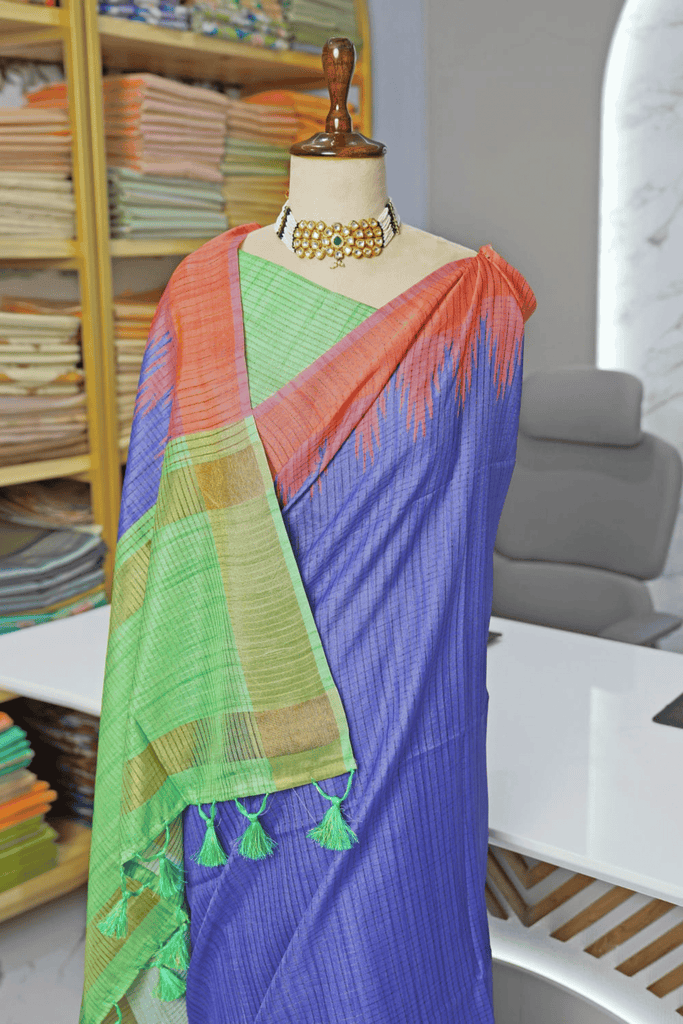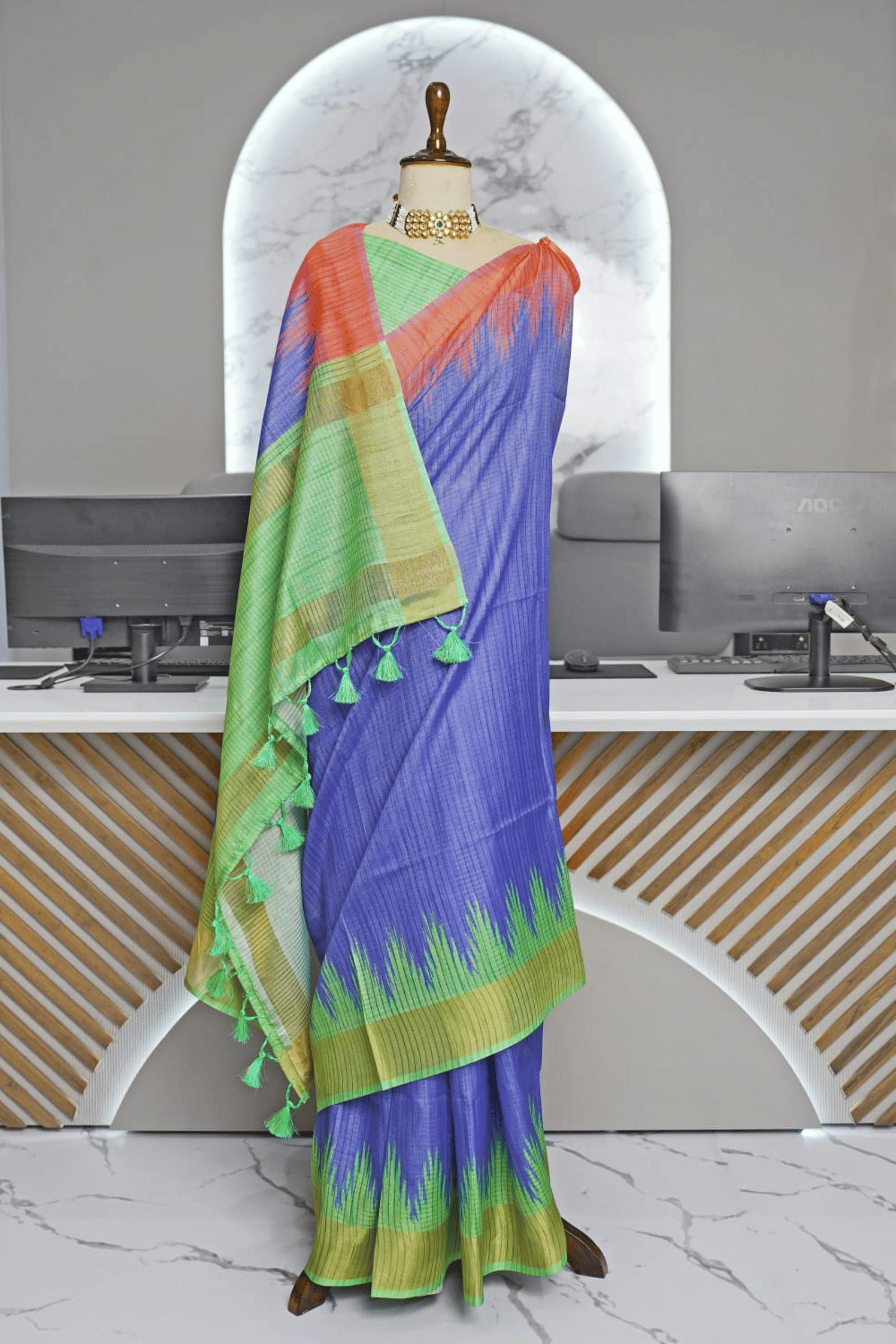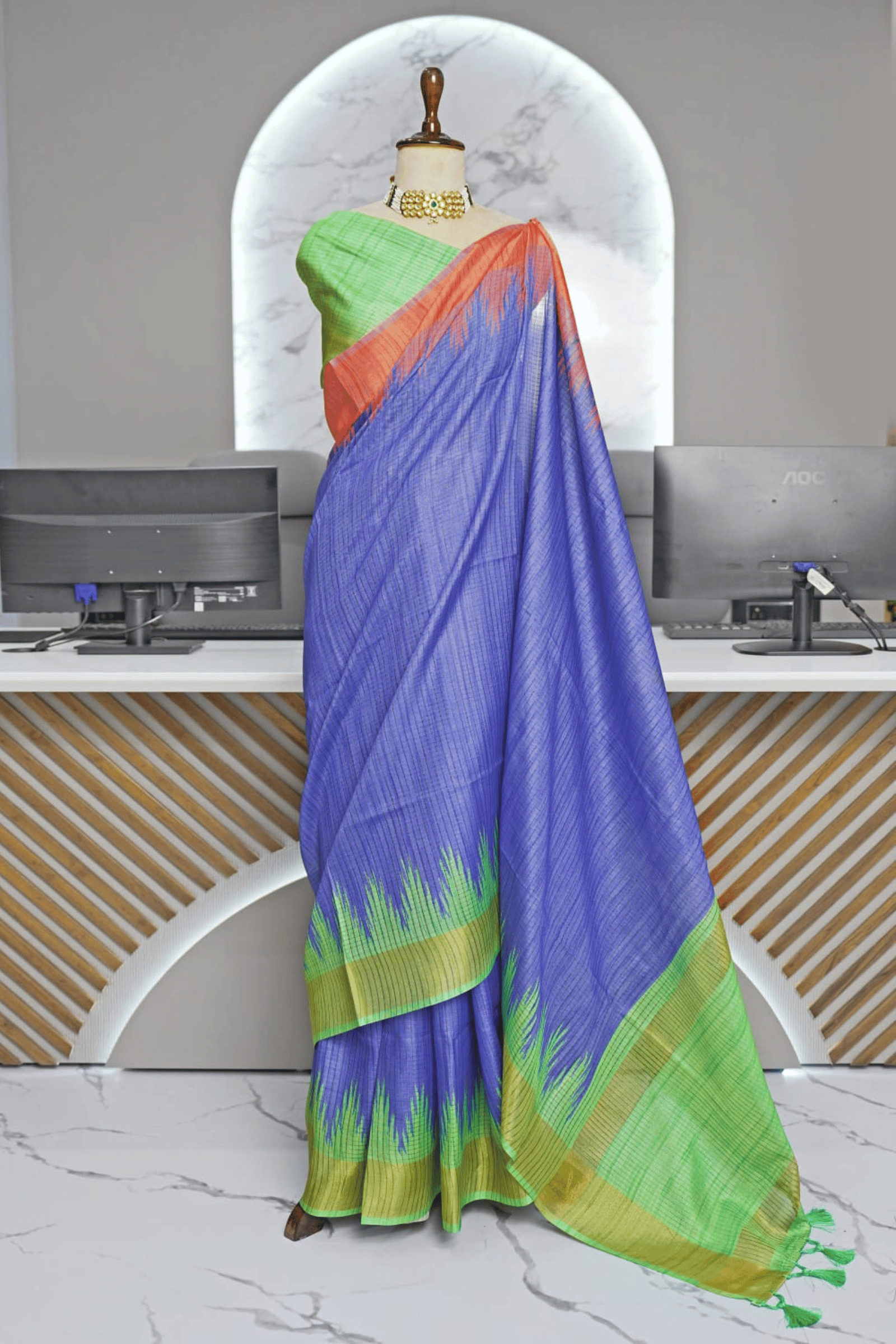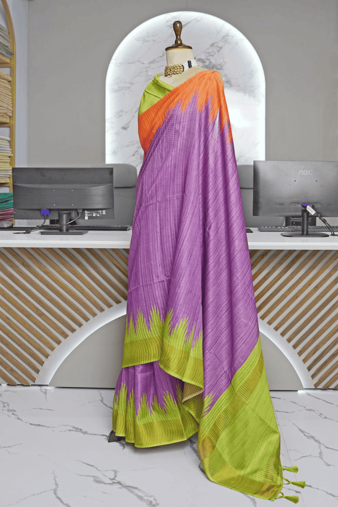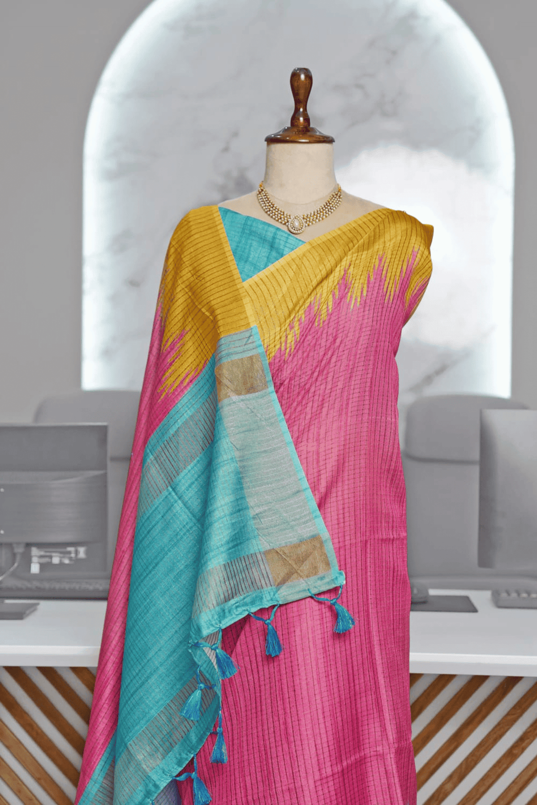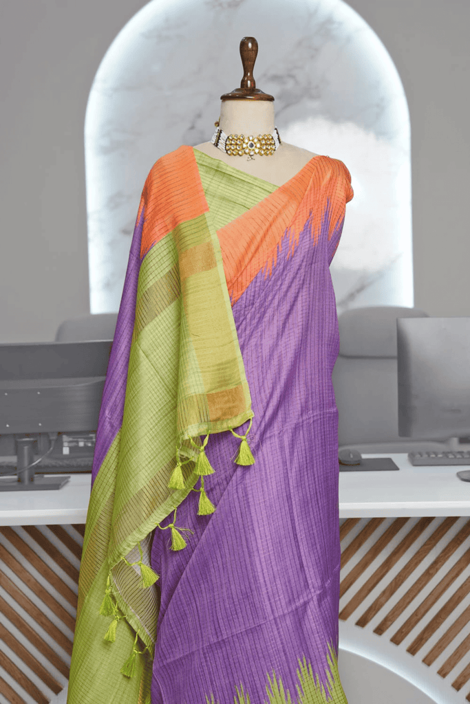 Finished with graceful tassels on the pallu, this saree brings a new style and a modern twist to classic Tussar silk.