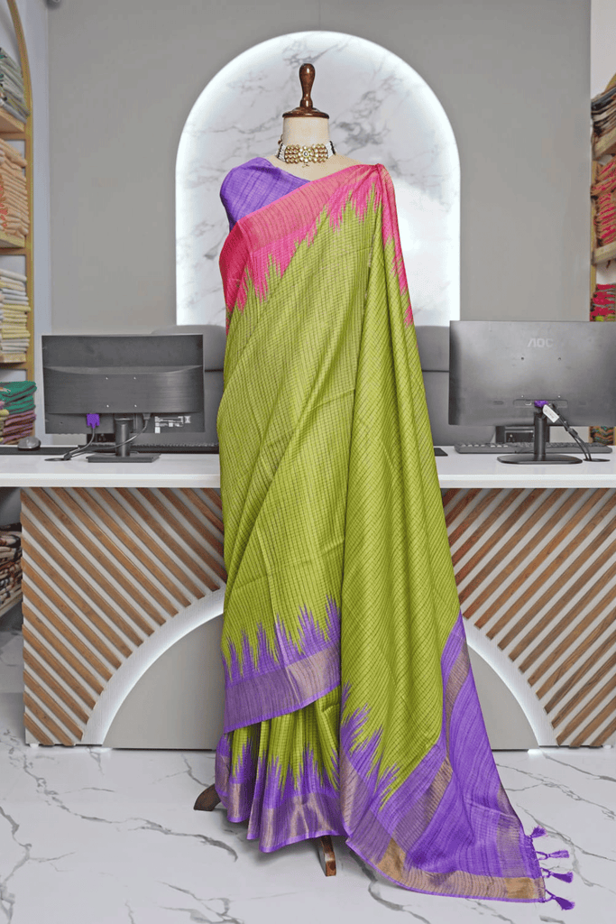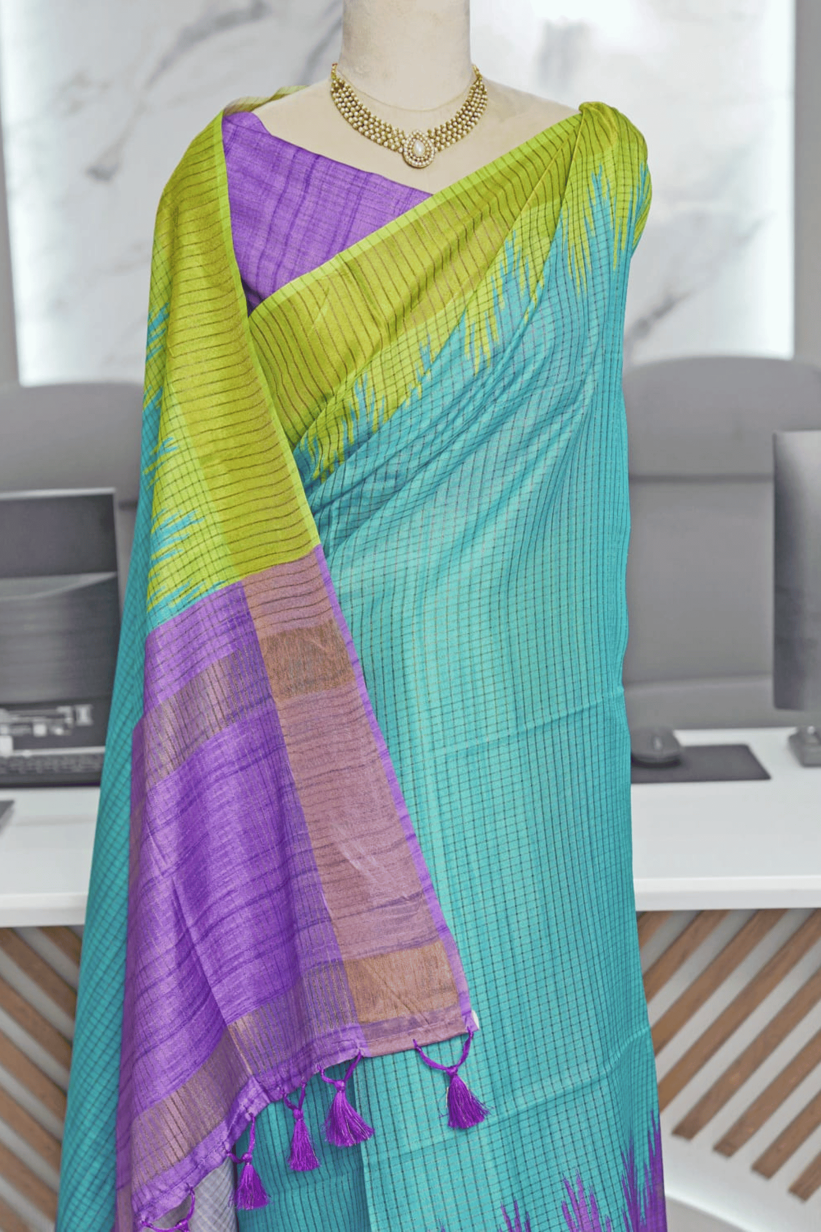 The Saree features an attractive checks design, giving it a fresh and stylish appeal, while the printed blouse complements the look perfectly.