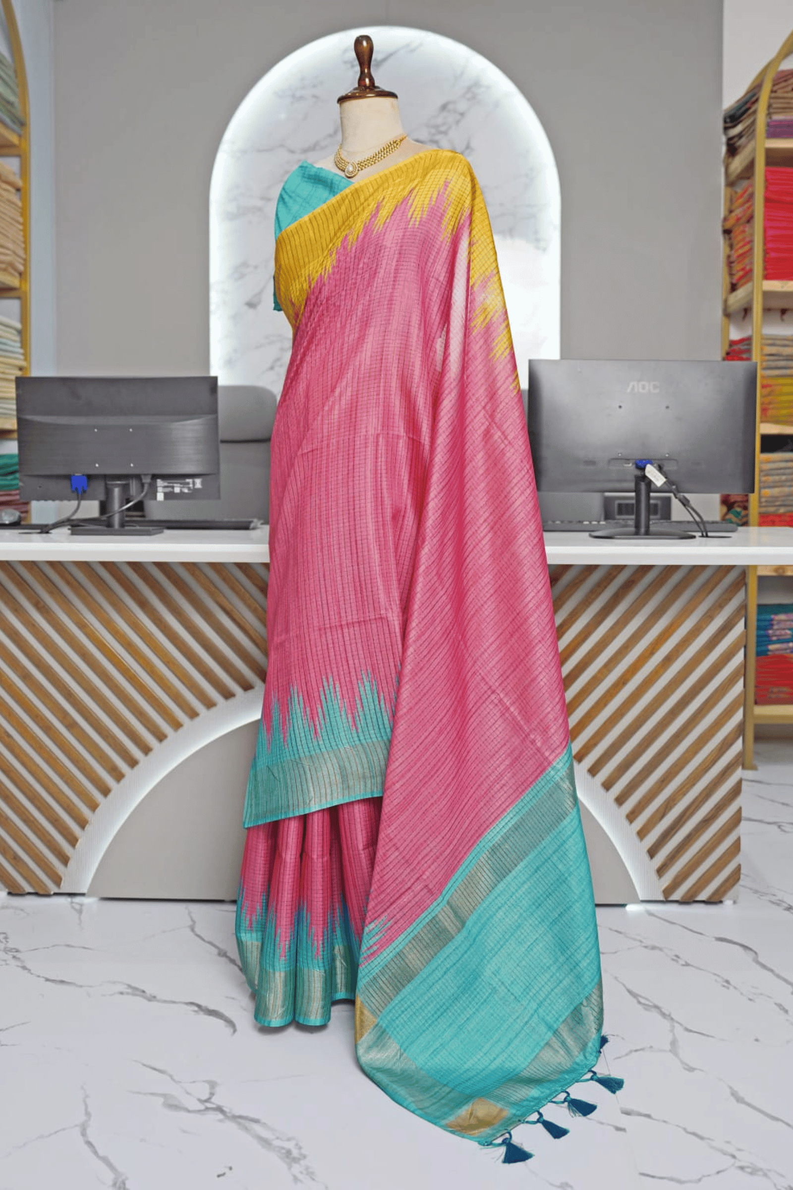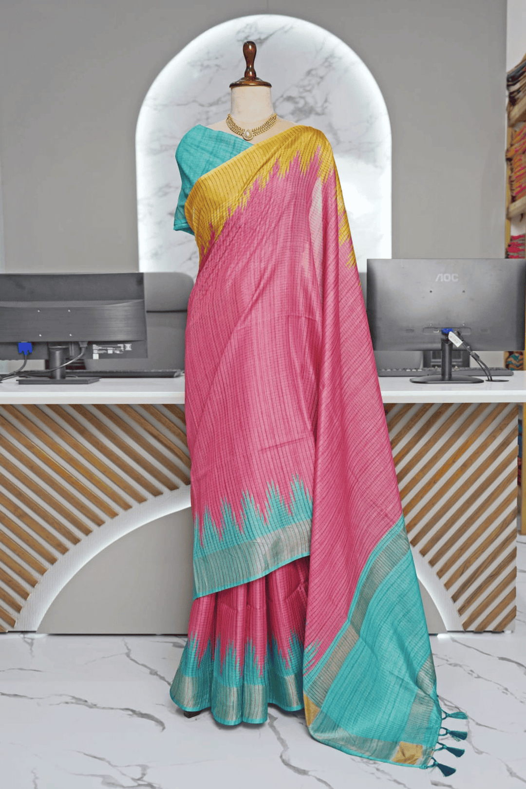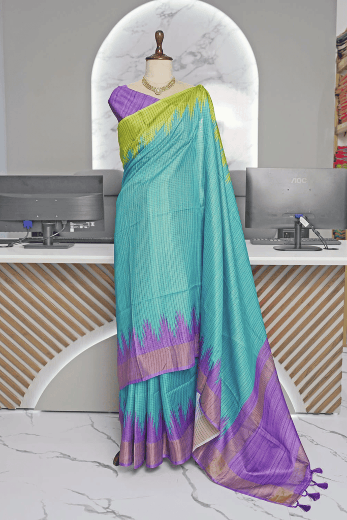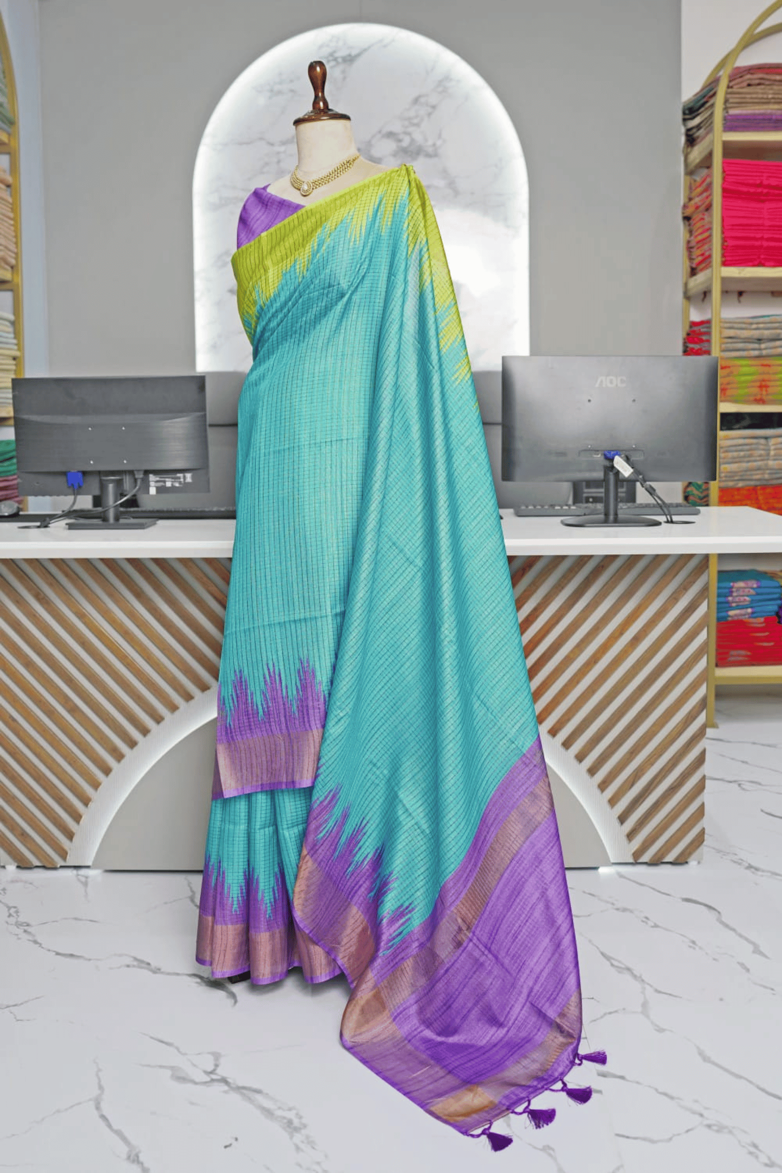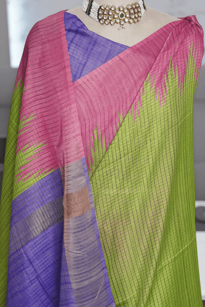 Discover elegance with our Classic Checks Tussar Saree, crafted in soft Tussar silk and beautifully adorned with charming prints that add a touch of sophistication.