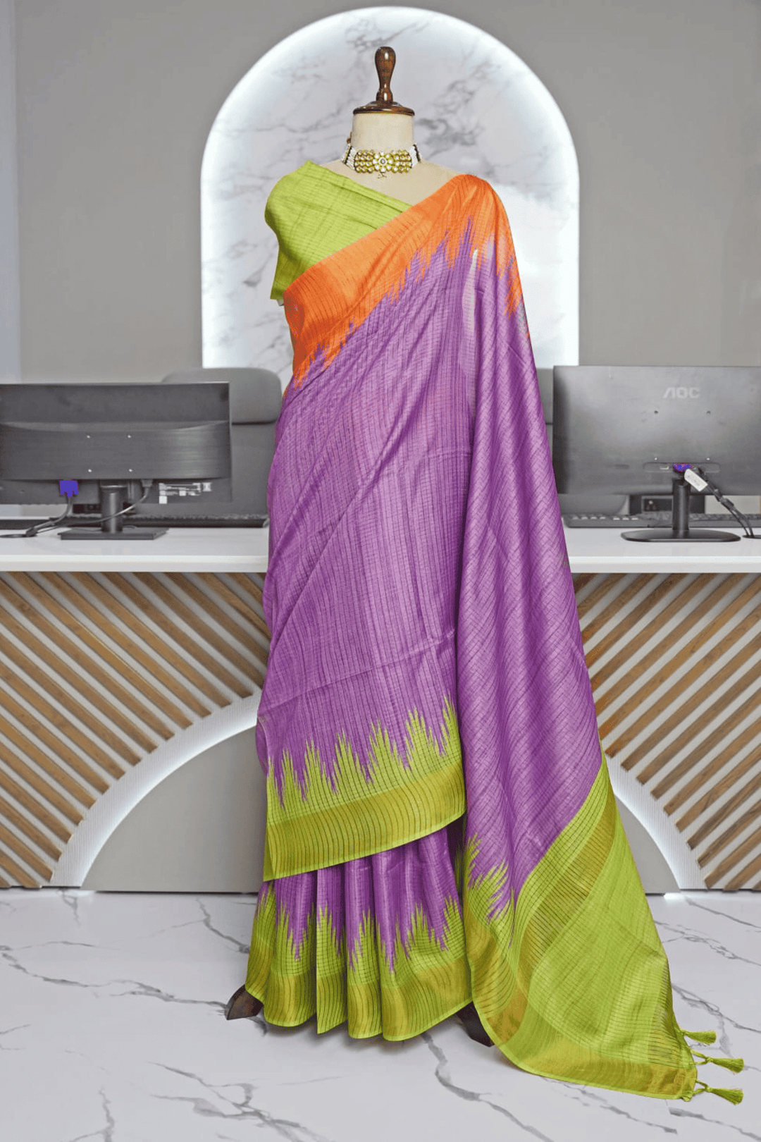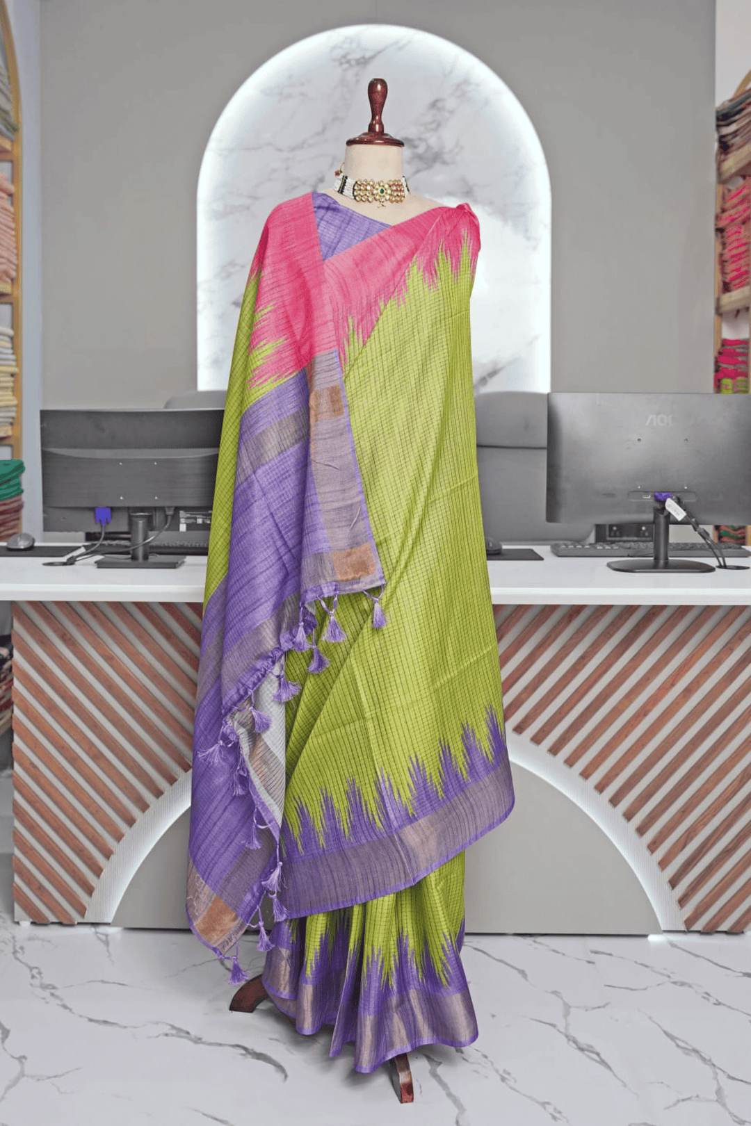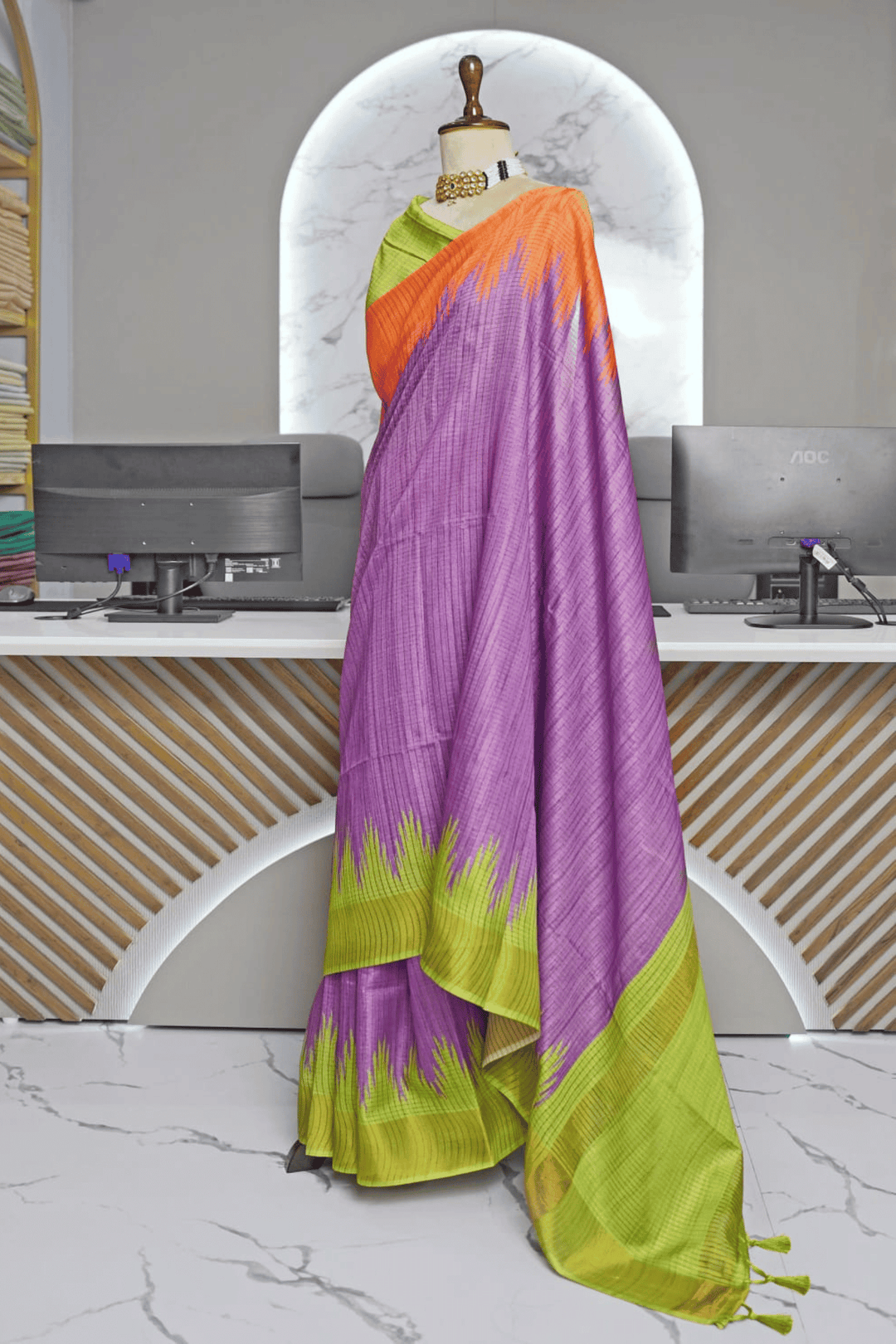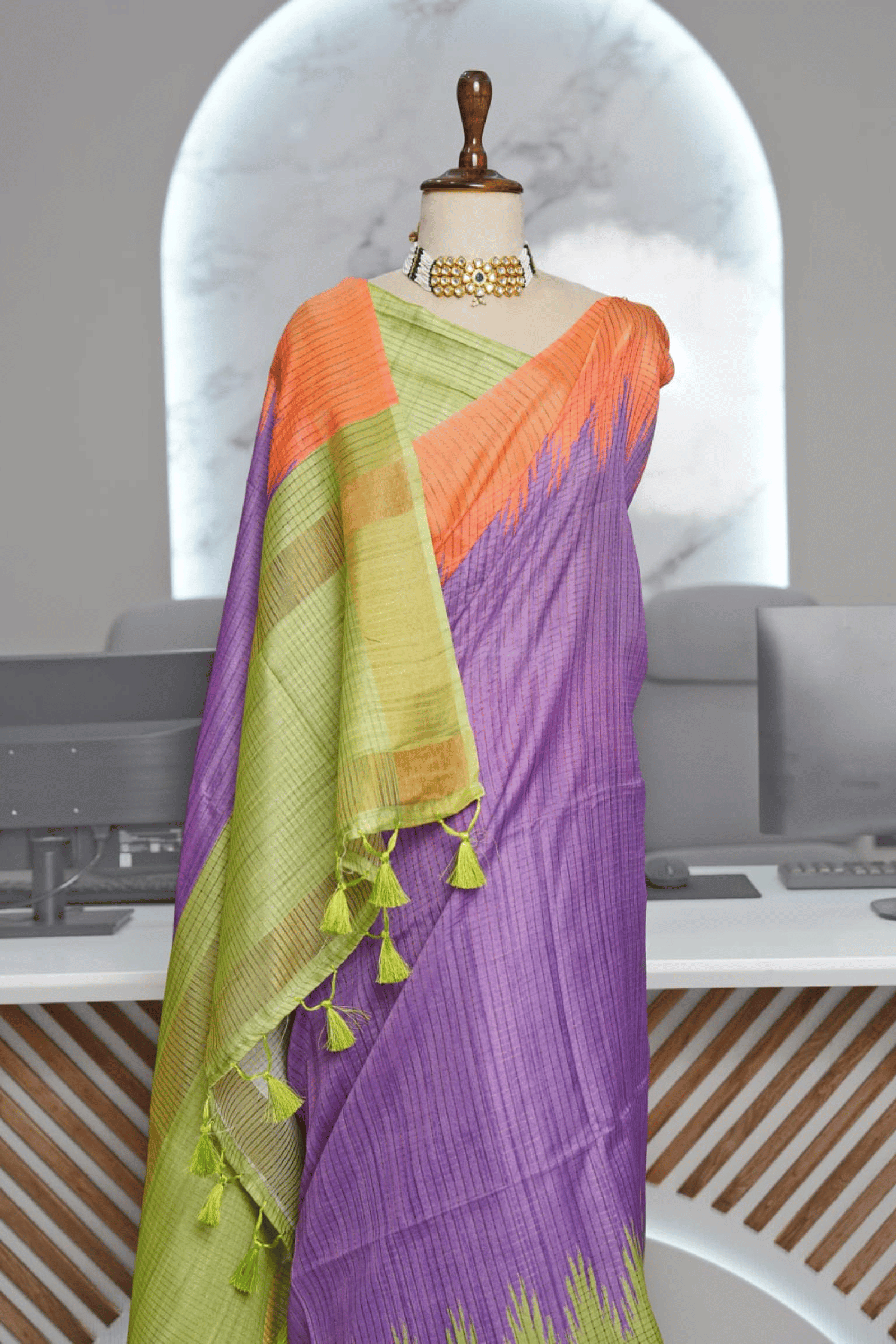 Discover elegance with our Classic Checks Tussar Saree, crafted in soft Tussar silk and beautifully adorned with charming prints that add a touch of sophistication.