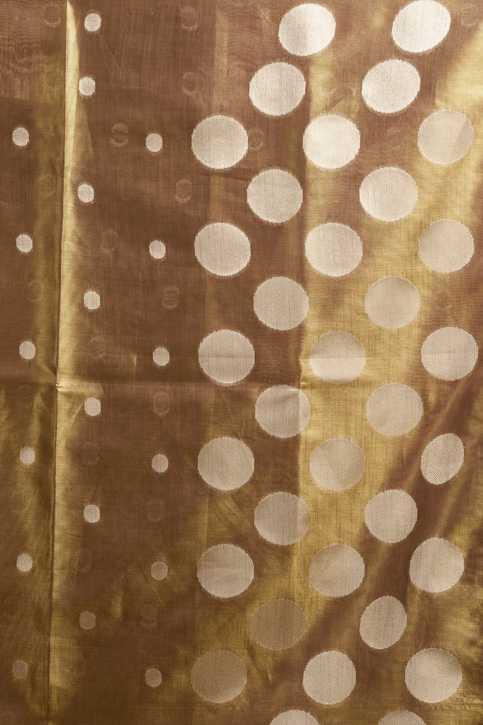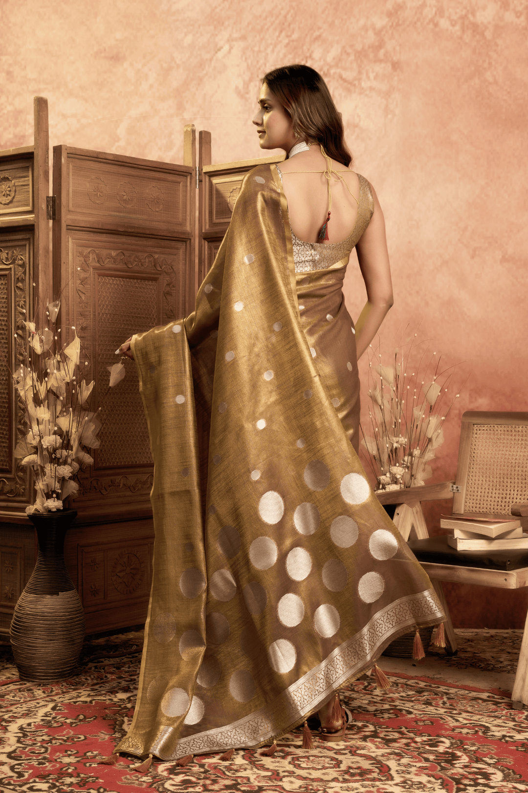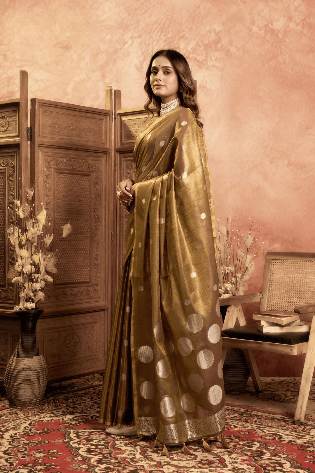 Experience heritage woven in every thread with this exquisite Cocoa Dusk Tissue Saree. Featuring an all-over pola weave that lends a subtle sheen, the saree is beautifully accentuated by a finely woven border and an ornate pallu. This pre-stitched tissue saree ensemble embodies classic grace and refined luxury.