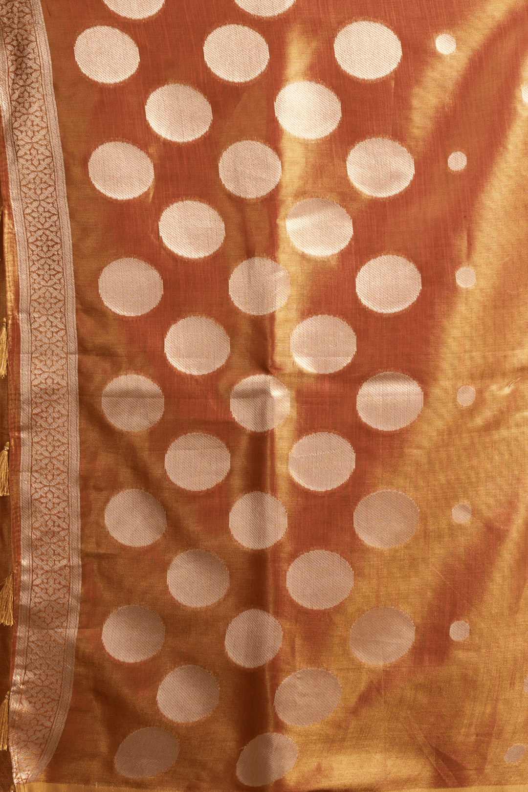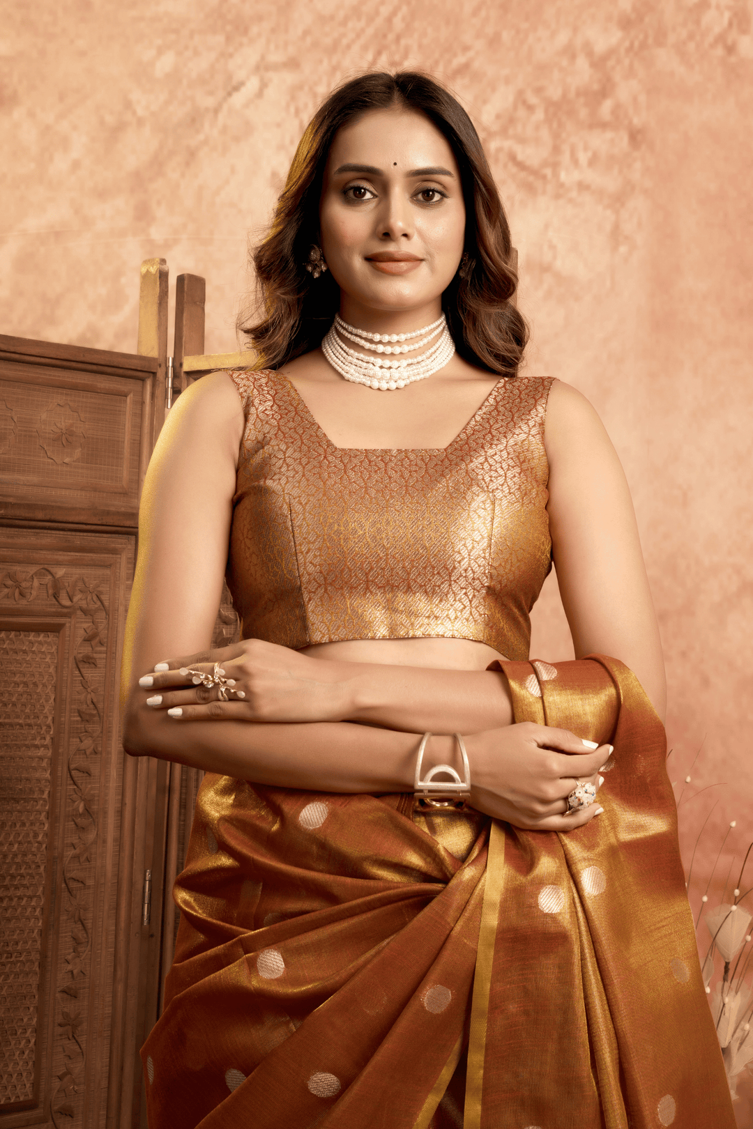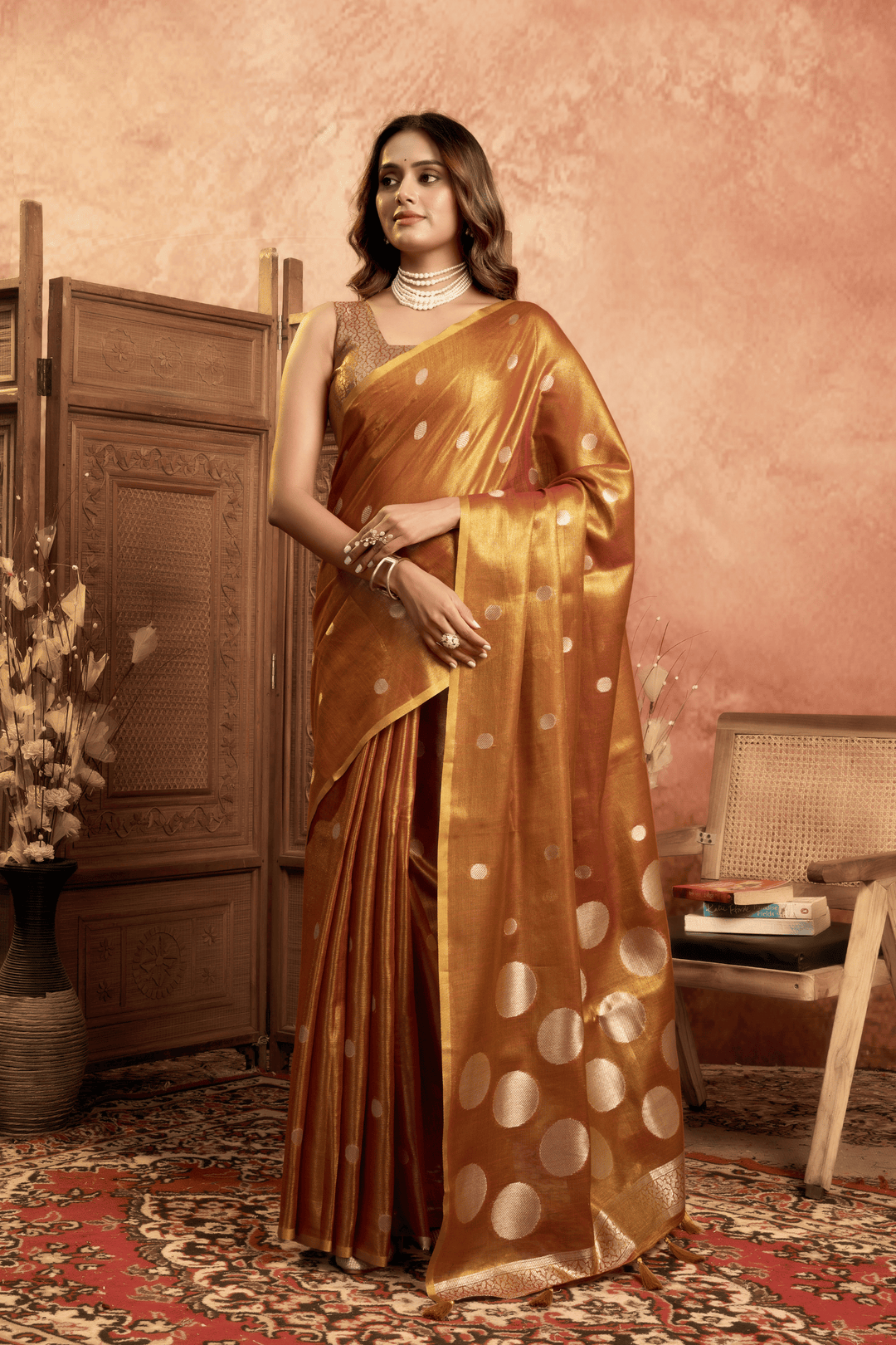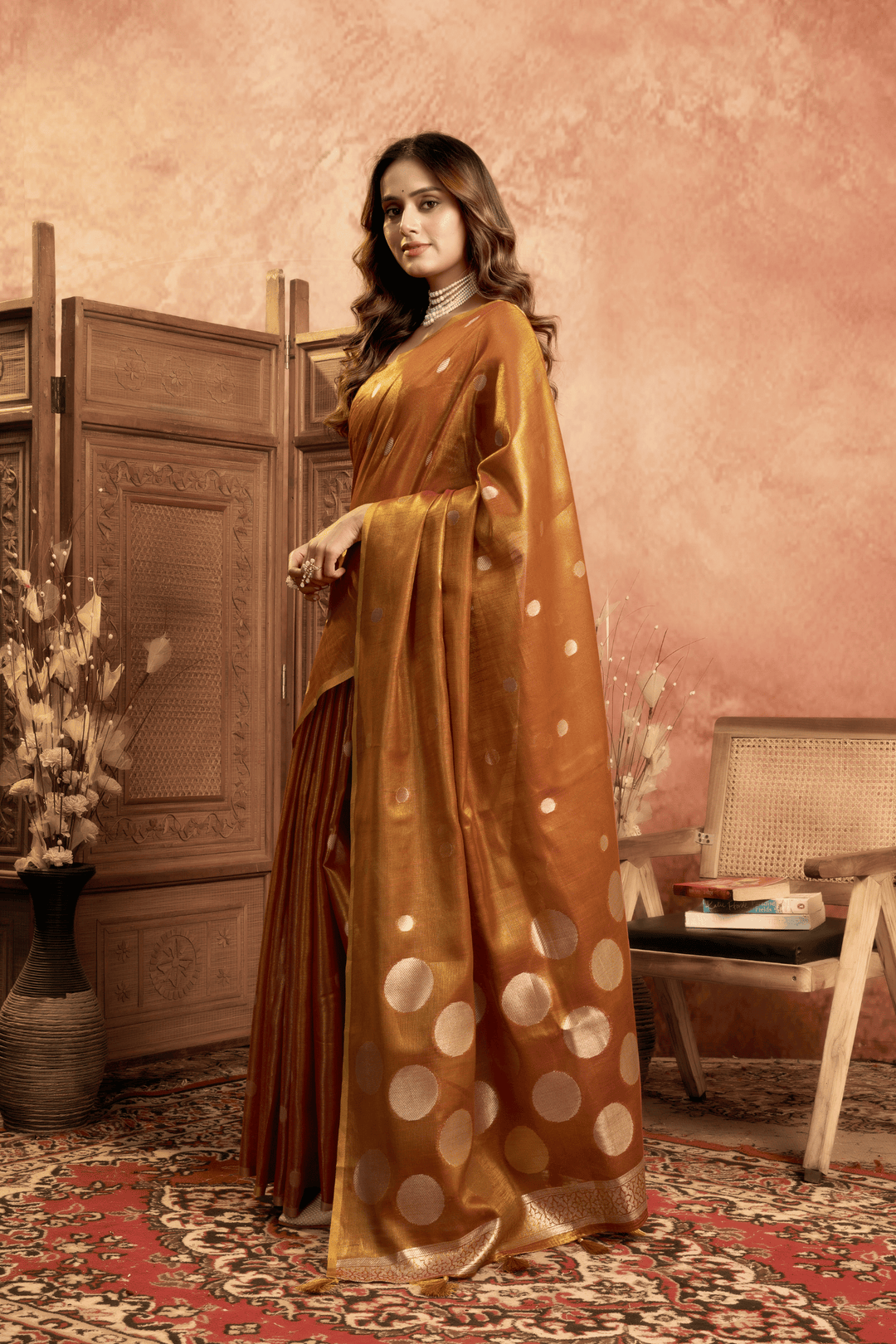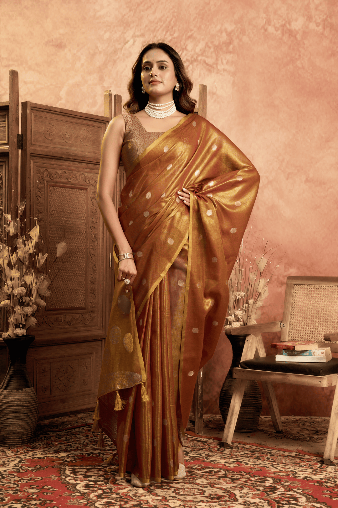 Experience heritage woven in every thread with this exquisite Copper Dusk Tissue Saree. Featuring an all-over pola weave that lends a subtle sheen, the saree is beautifully accentuated by a finely woven border and an ornate pallu. This pre-stitched tissue saree ensemble embodies classic grace and refined luxury.