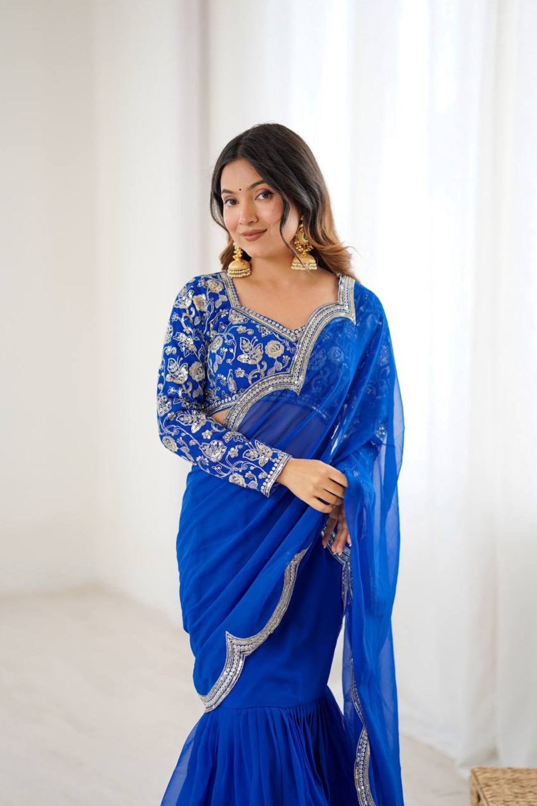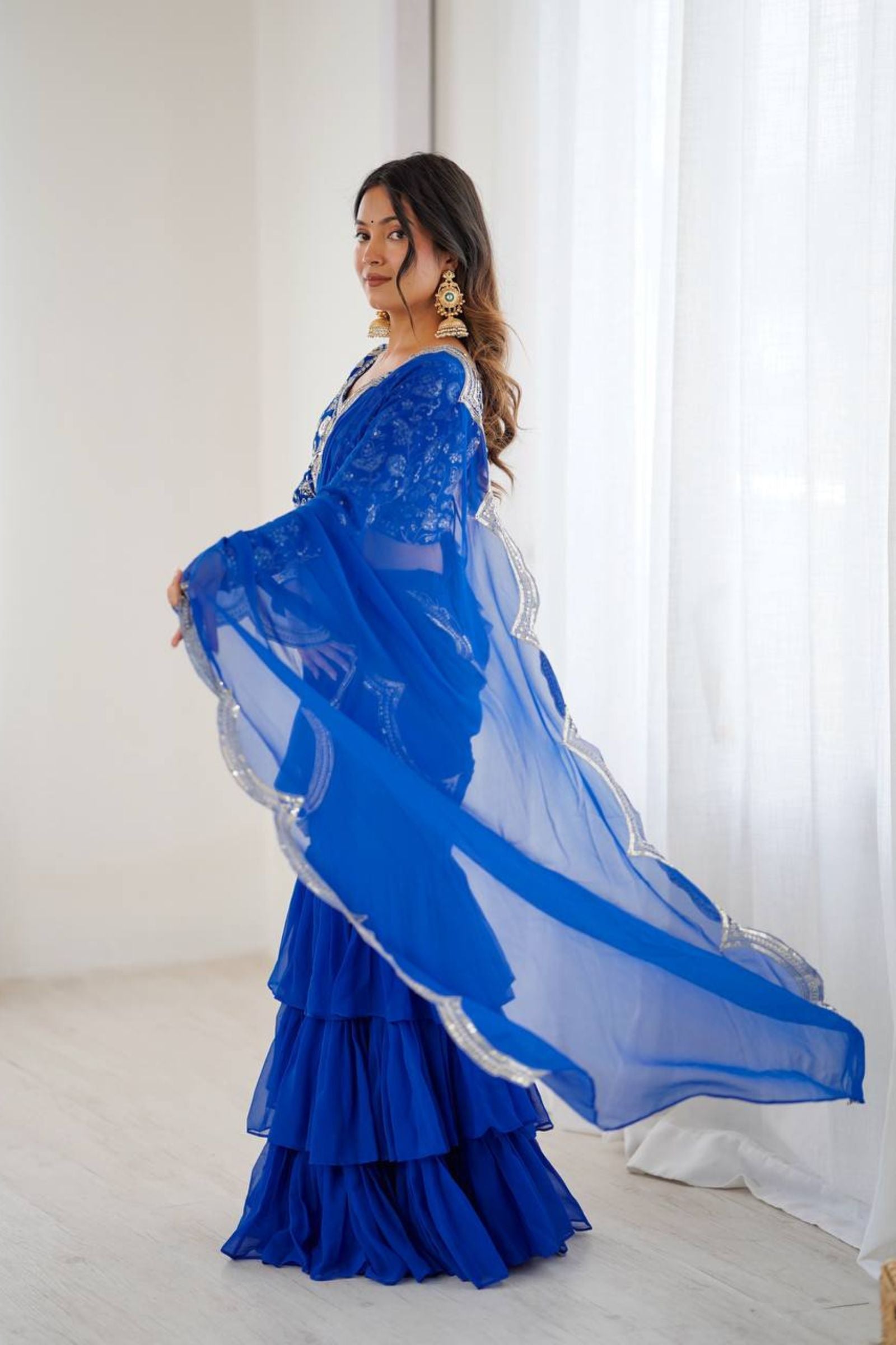 - One "Electric blue" 1-Minute Ruffle Georgette Saree.