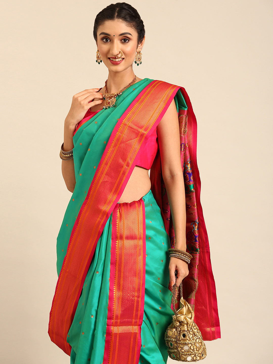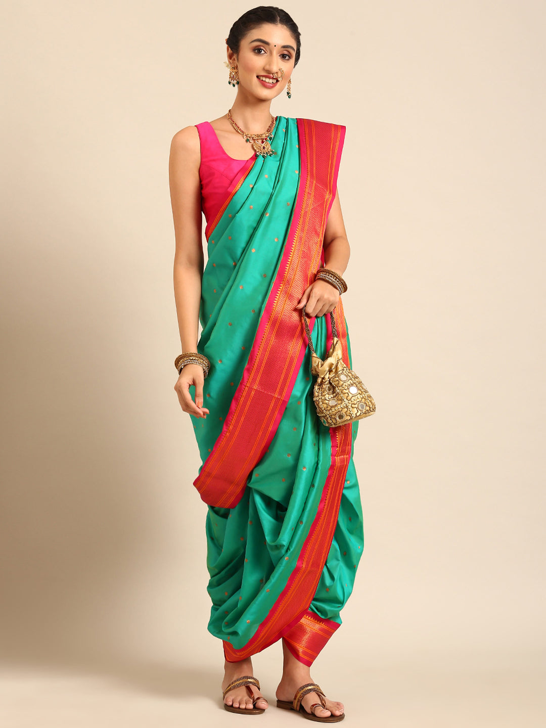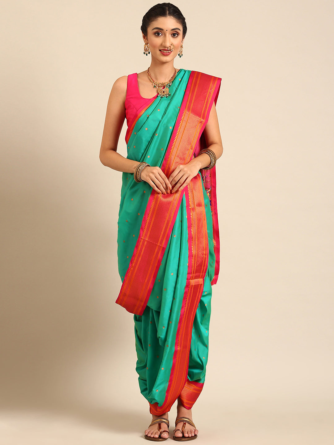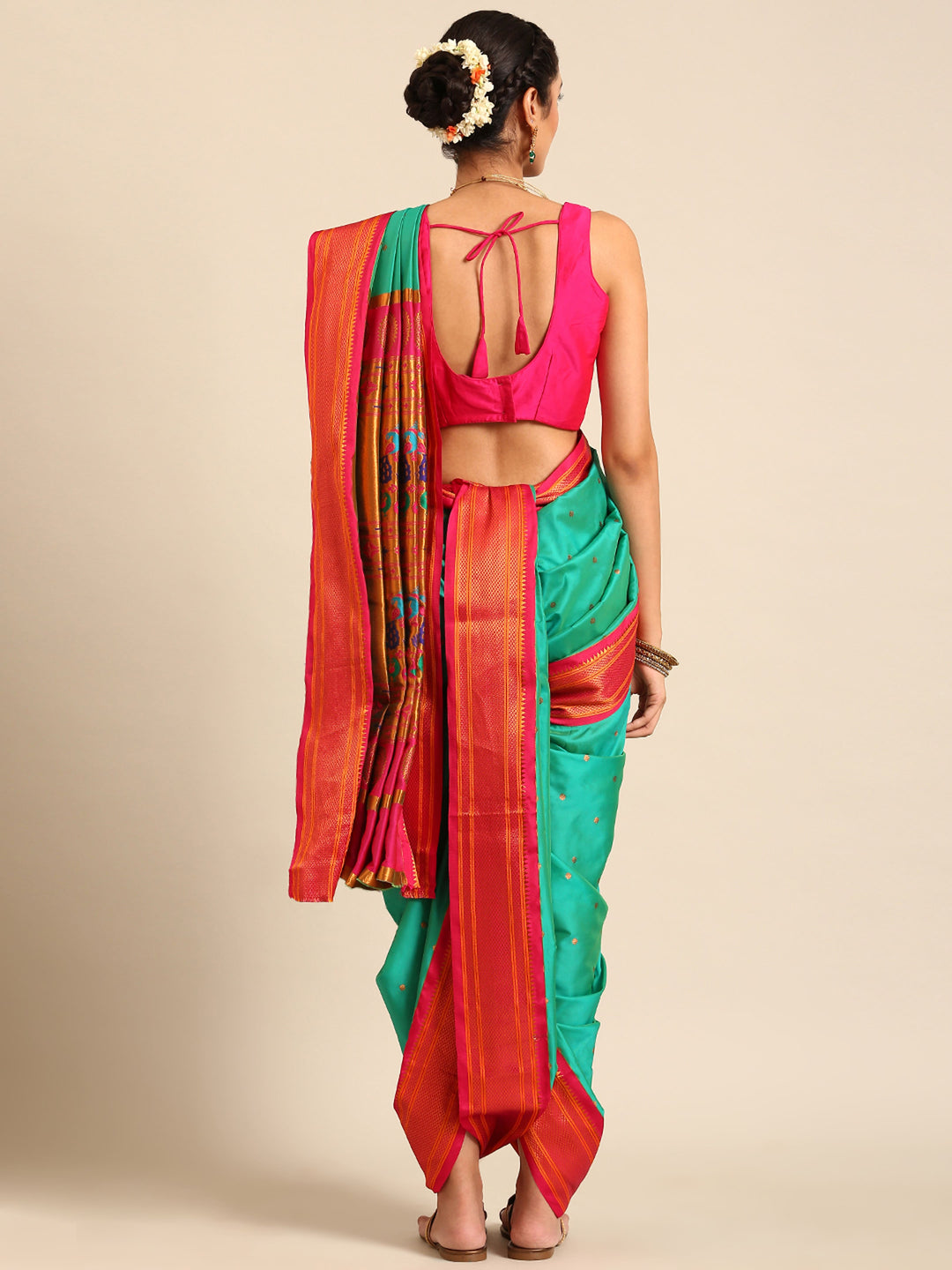 Glamwiz Sea Green & Pink Maharani Nauvari Paithani Saree
