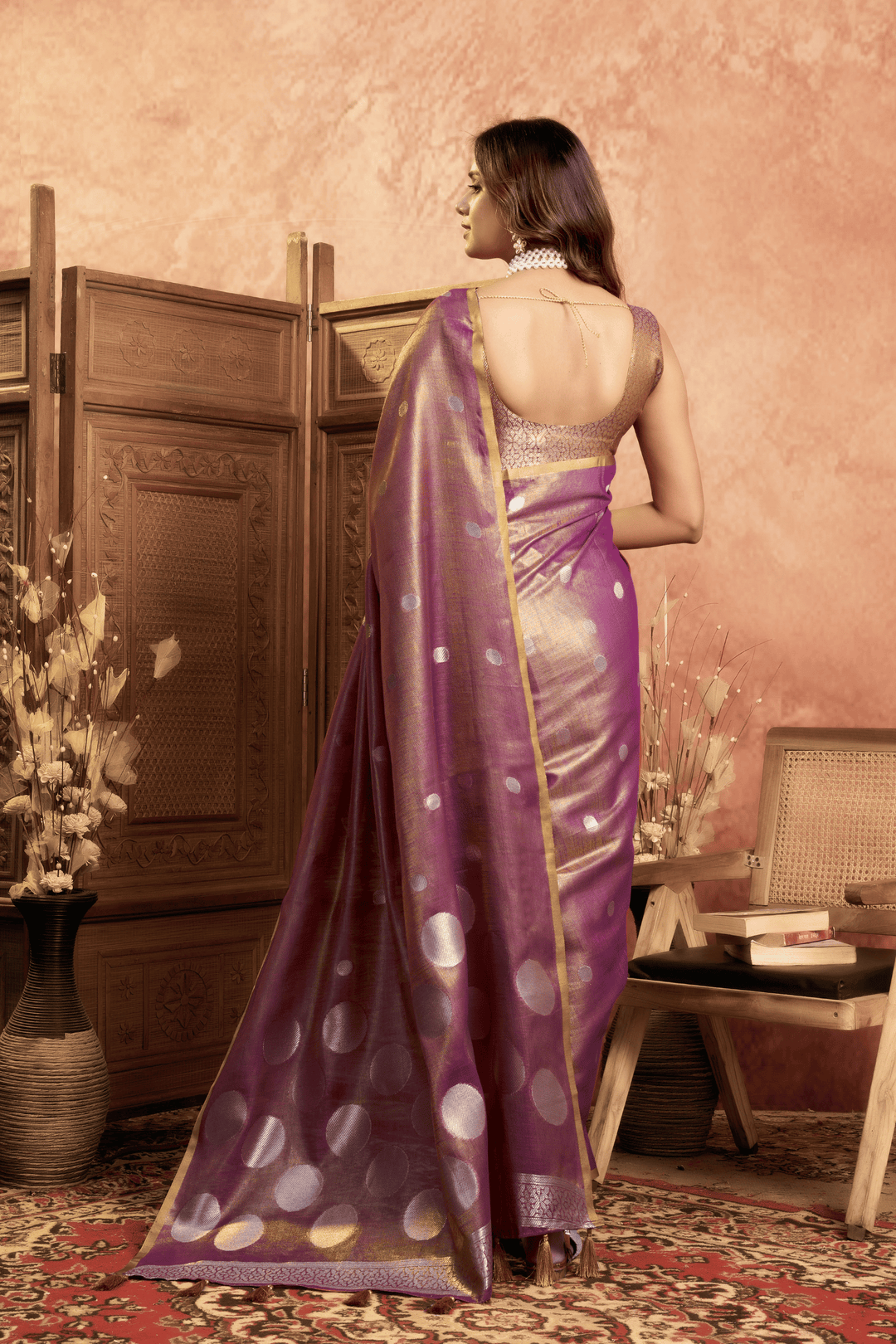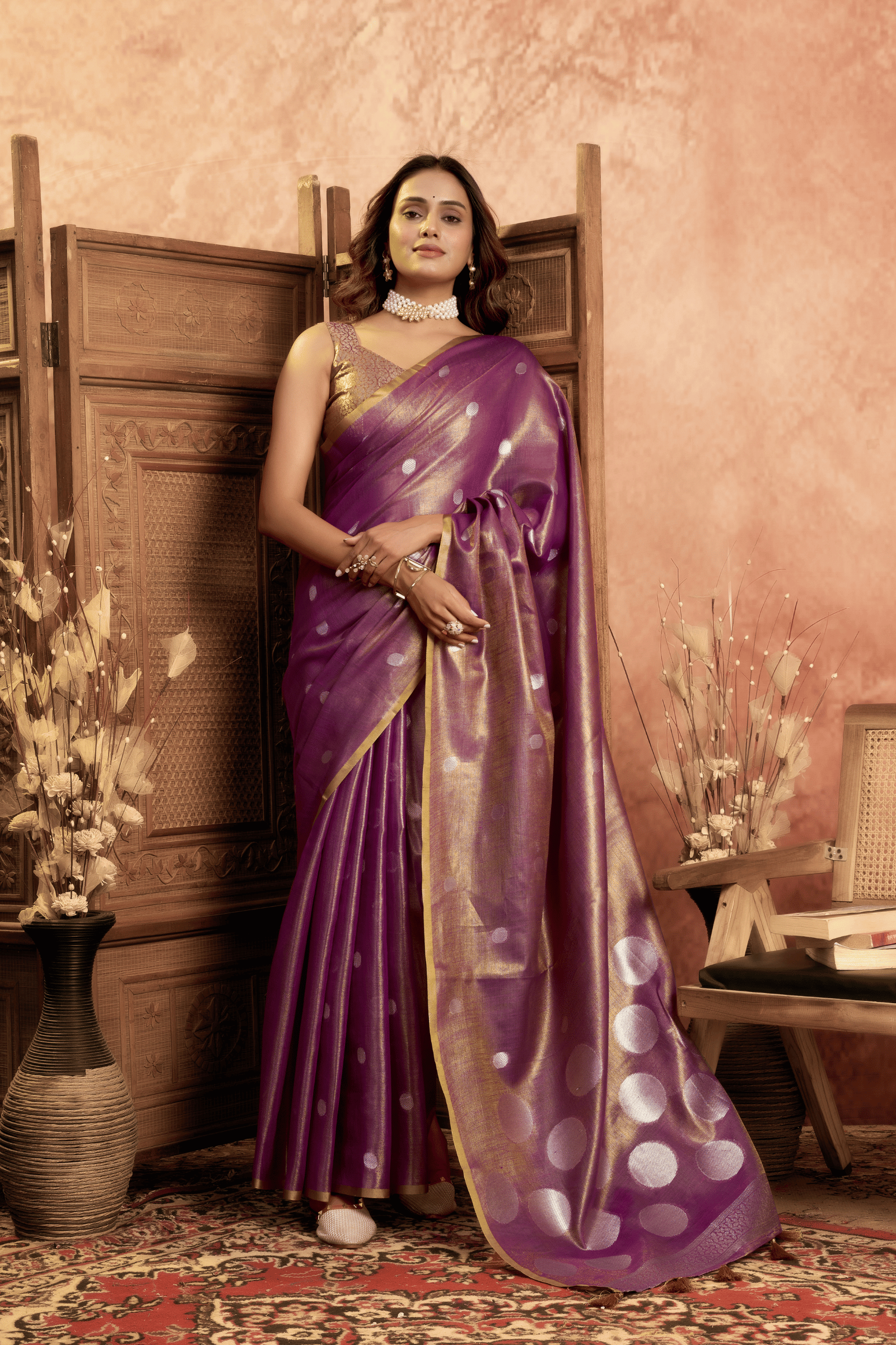 Experience heritage woven in every thread with this exquisite Shallot Pink Tissue Saree. Featuring an all-over pola weave that lends a subtle sheen, the saree is beautifully accentuated by a finely woven border and an ornate pallu. This pre-stitched tissue saree ensemble embodies classic grace and refined luxury.
