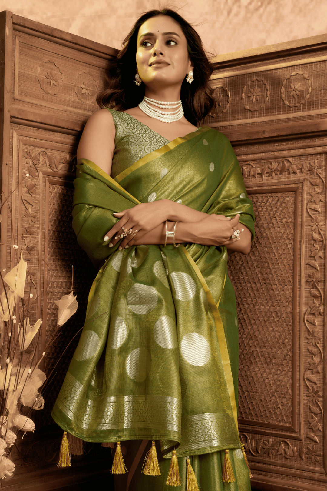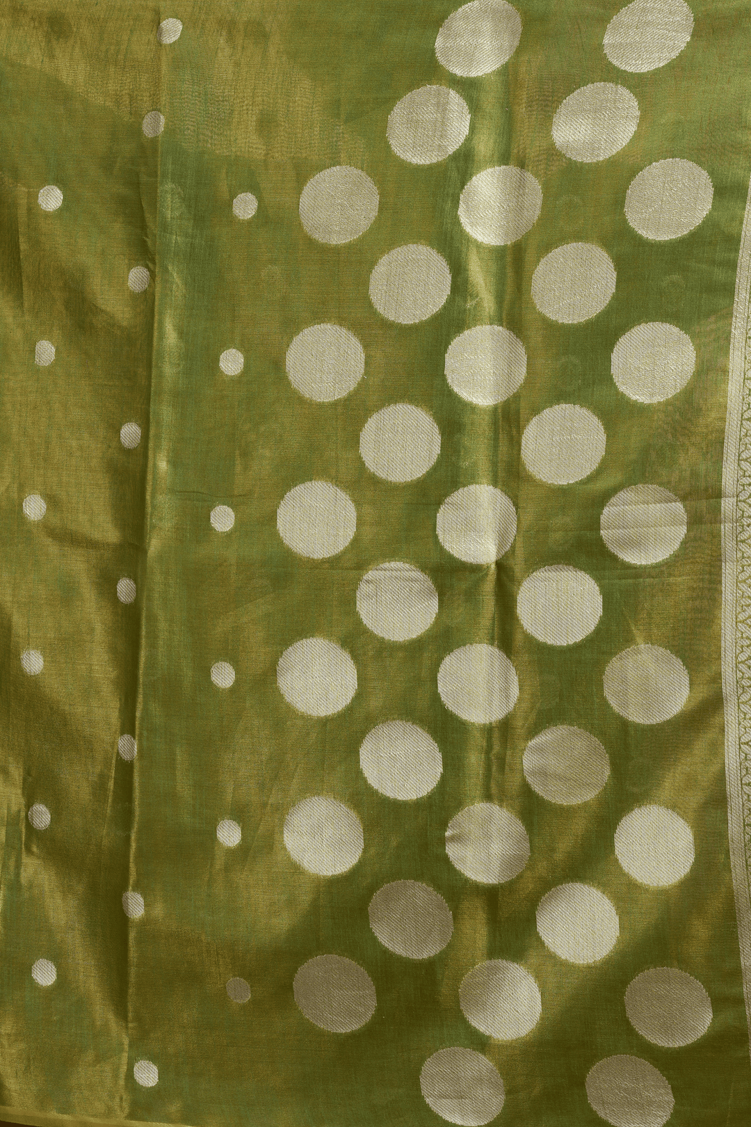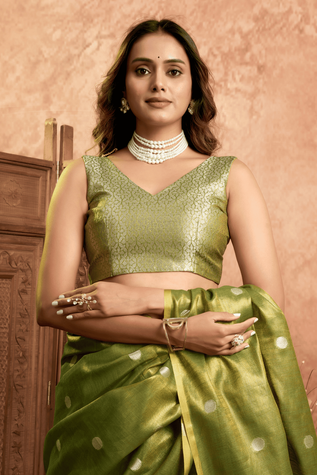 Experience heritage woven in every thread with this exquisite Spring Green Tissue Saree. Featuring an all-over pola weave that lends a subtle sheen, the saree is beautifully accentuated by a finely woven border and an ornate pallu. This pre-stitched tissue saree ensemble embodies classic grace and refined luxury.