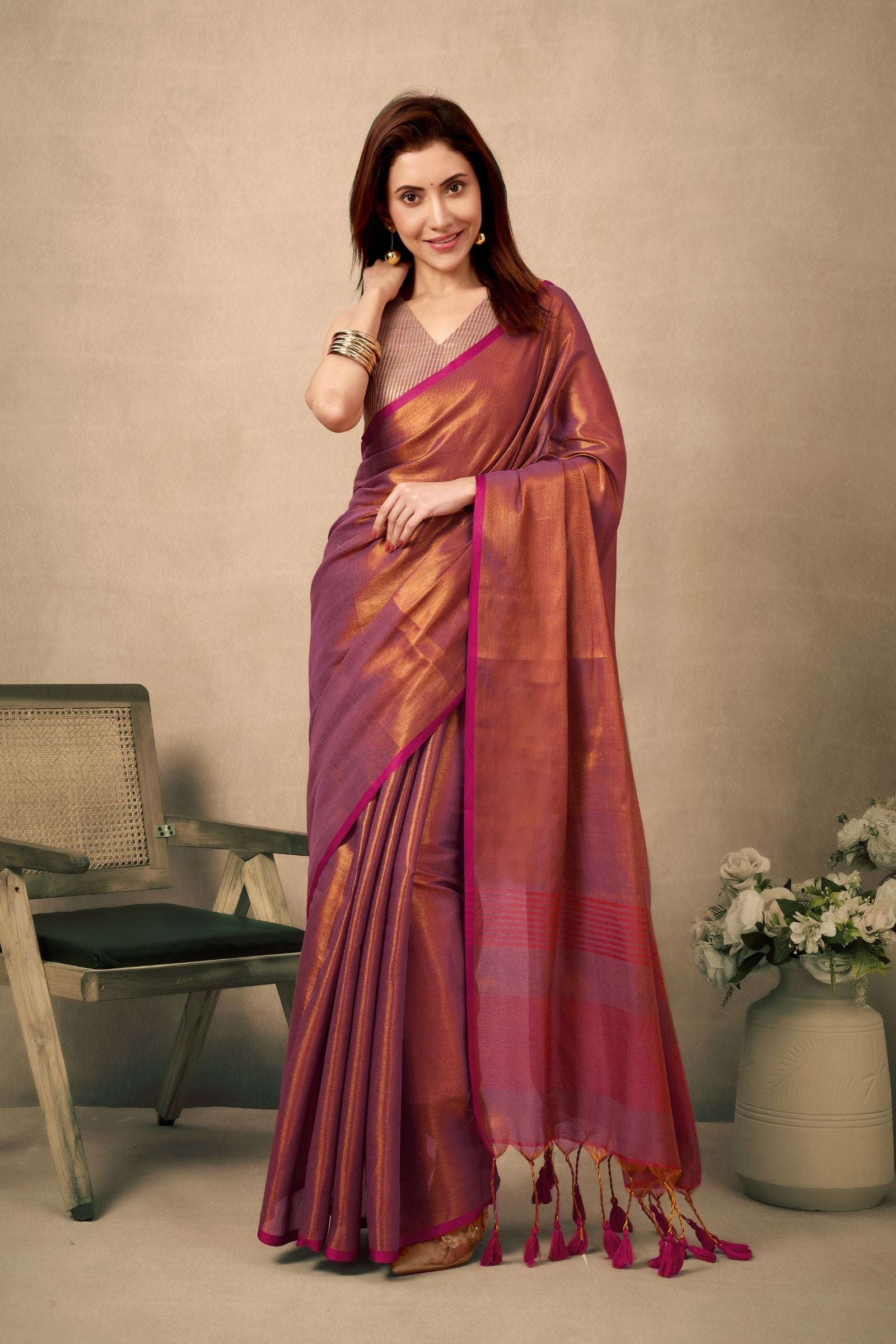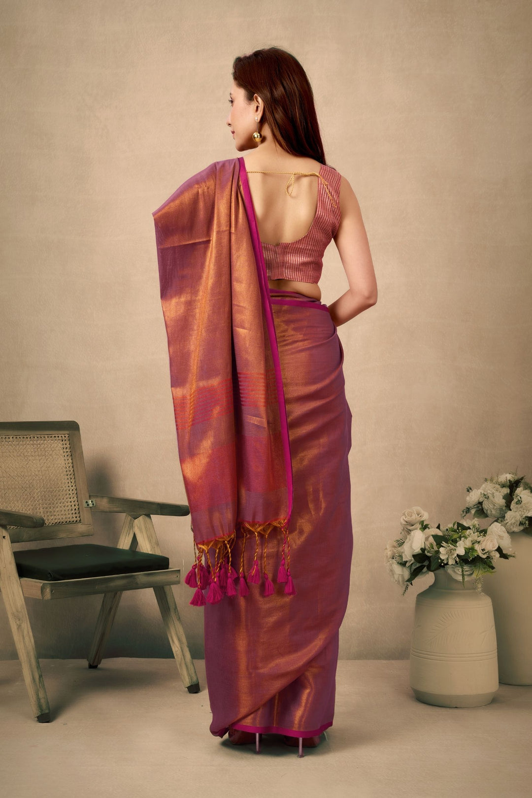Gracefully woven for timeless elegance, this Ready to Wear Soft Rose Gold Mul Tissue Silk Saree is a celebration of subtle shimmer and refined craftsmanship. Perfect for weddings, festive gatherings, poojas, and elegant evening occasions, this saree strikes the perfect balance between tradition and contemporary style.