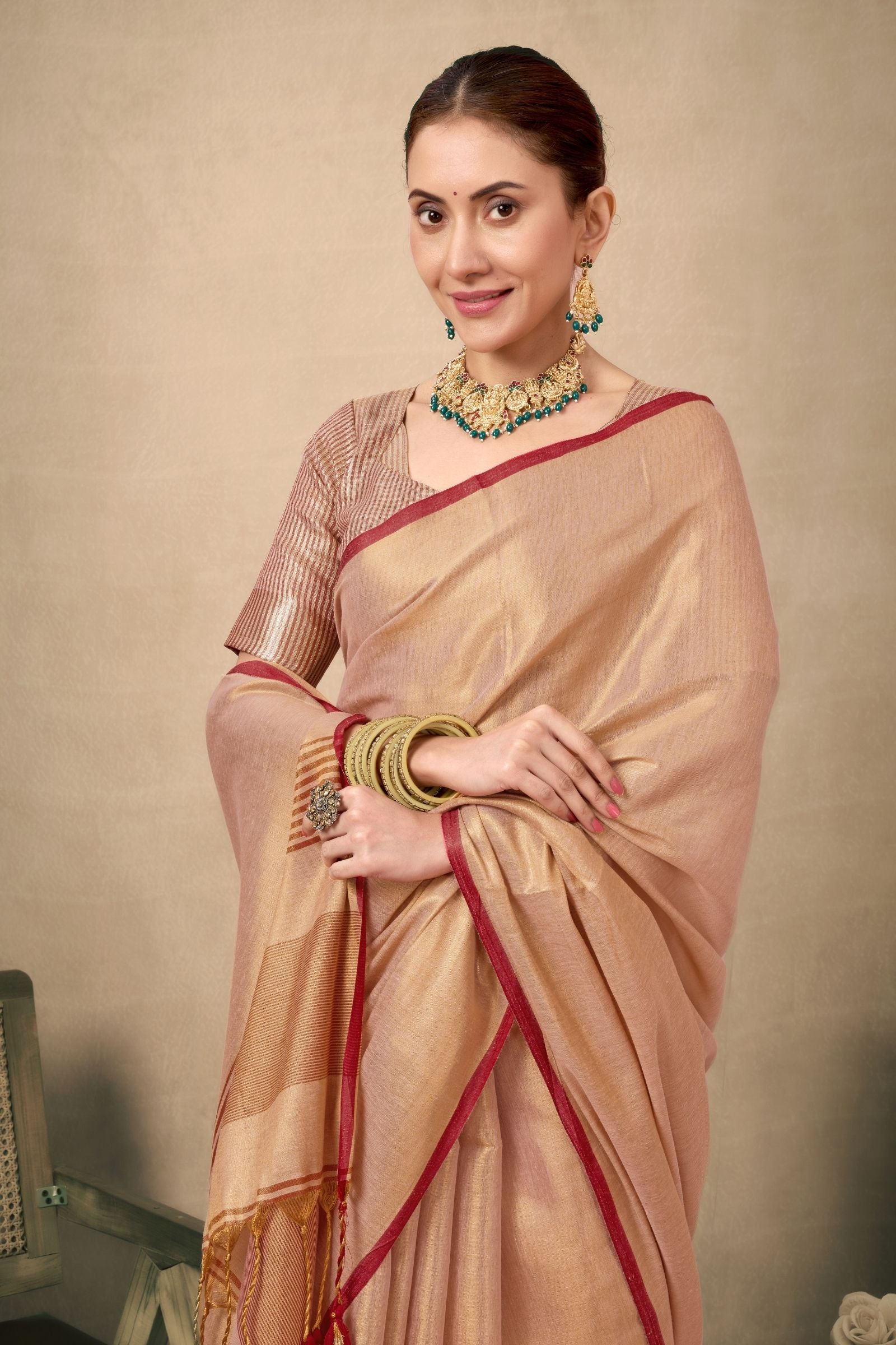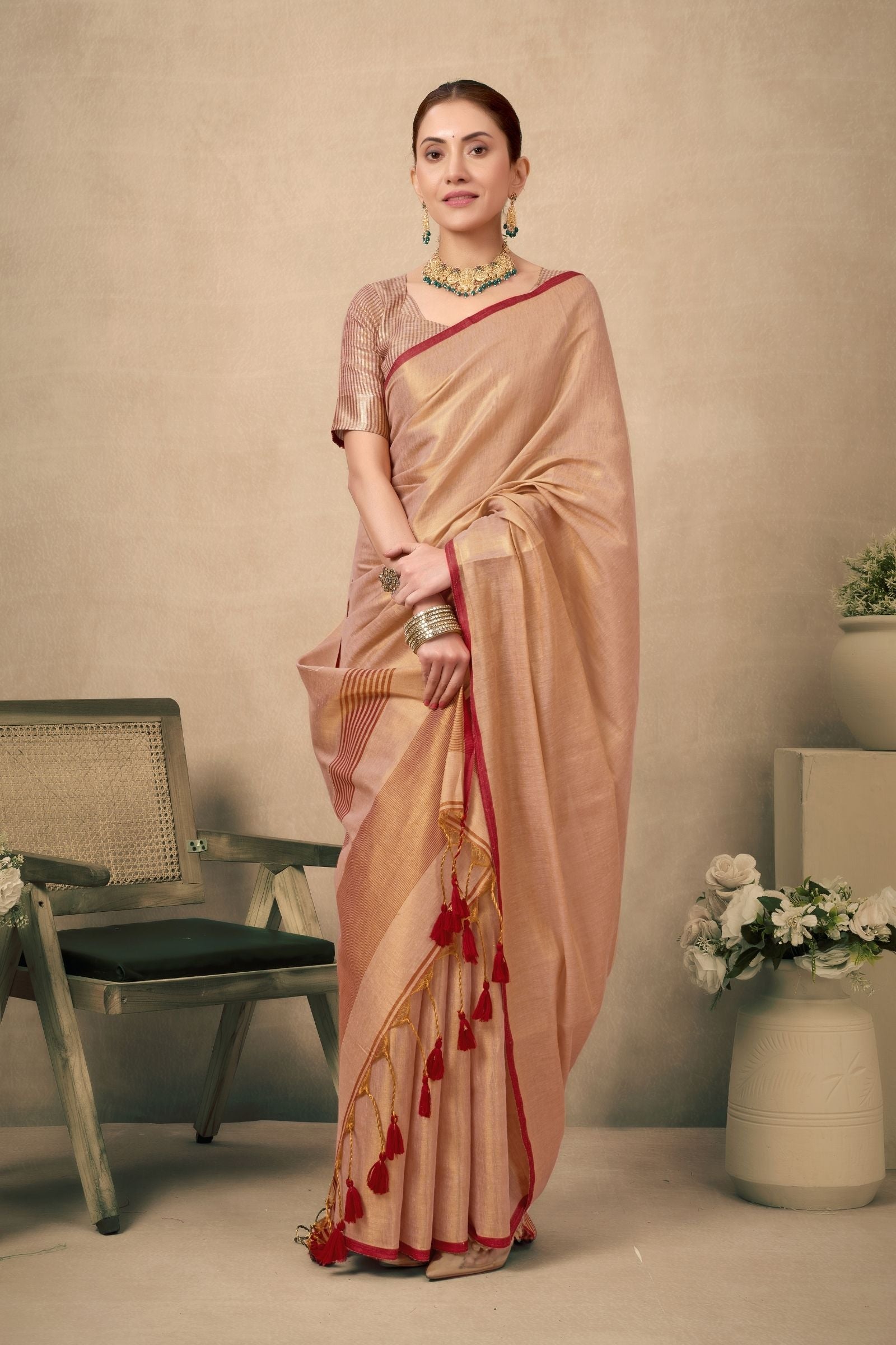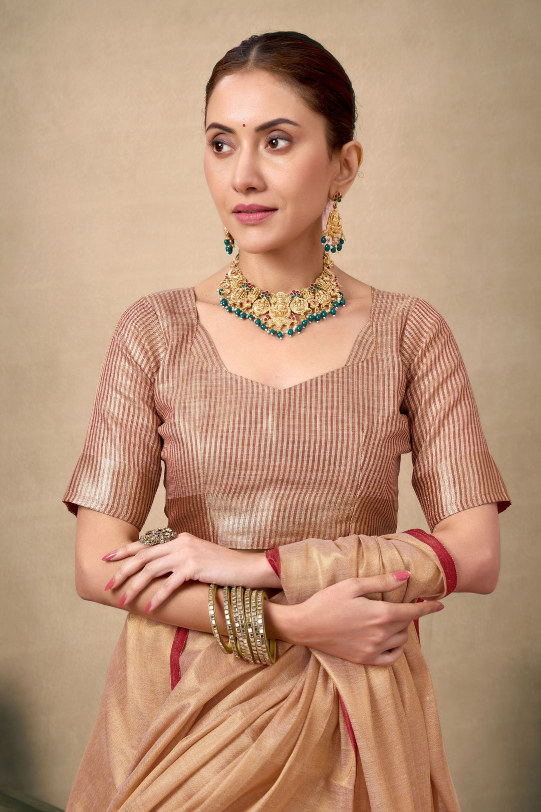 Gracefully woven for timeless elegance, this Ready to Wear Soft Beige Mul Tissue Silk Saree is a celebration of subtle shimmer and refined craftsmanship. Perfect for weddings, festive gatherings, poojas, and elegant evening occasions, this saree strikes the perfect balance between tradition and contemporary style.