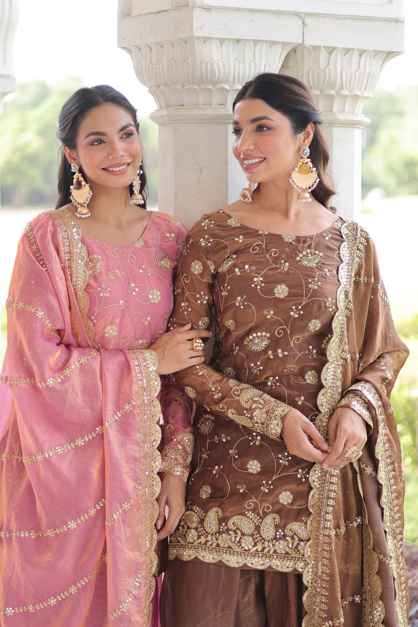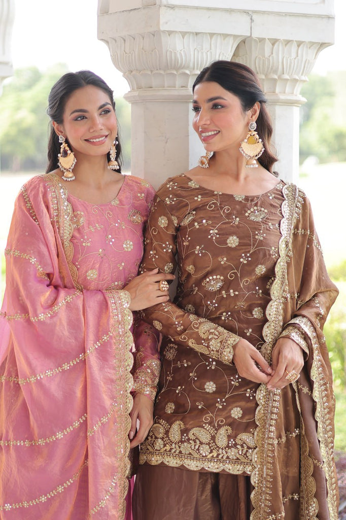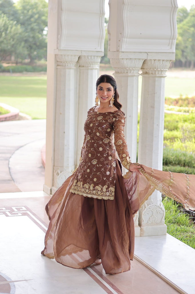 The Blush & Brew Sharara Ensemble blends sophistication with comfort. Crafted in rich Fendy fabric, the fully lined top features intricate sequin embroidery, while the flared sharara offers effortless elegance. Paired with a delicately embroidered dupatta, this ready-to-wear set captures modern ethnic charm, perfect for grand celebrations and stylish parties.