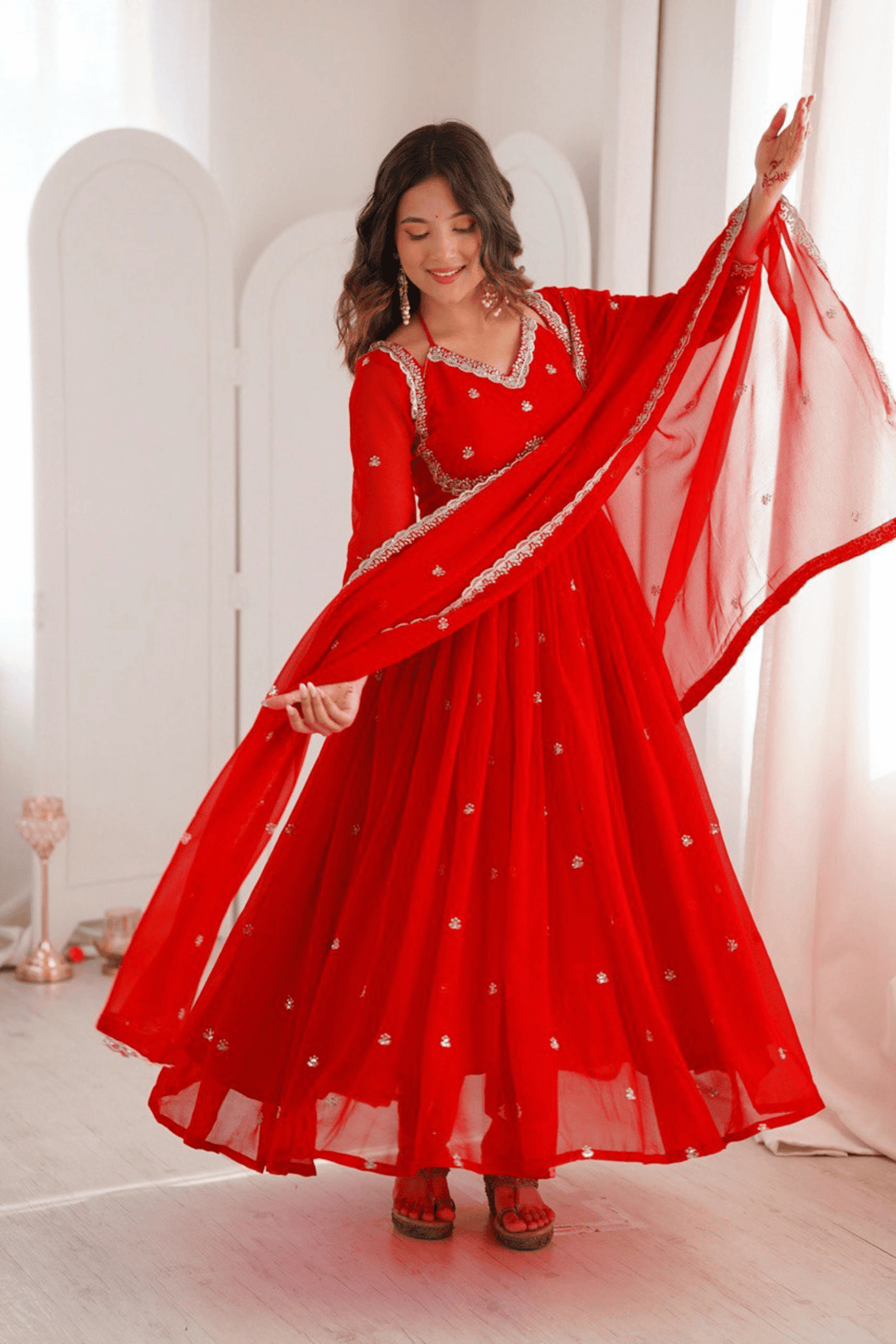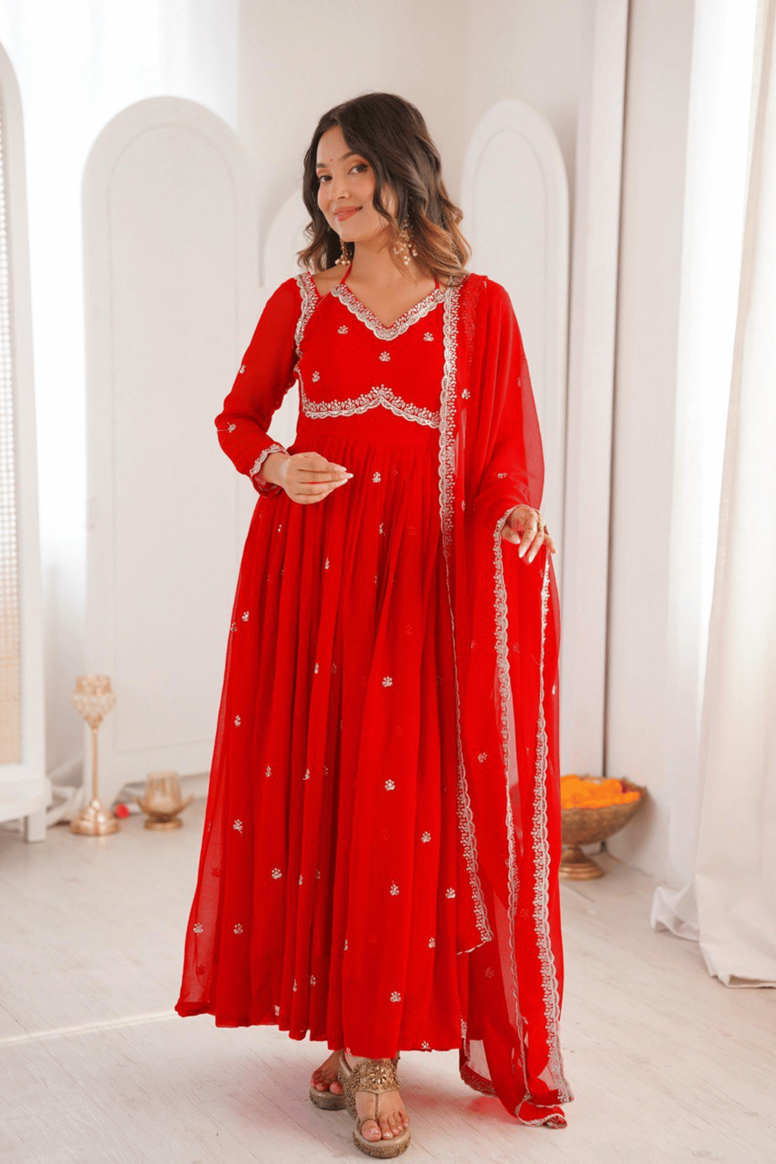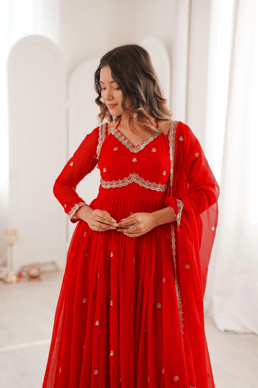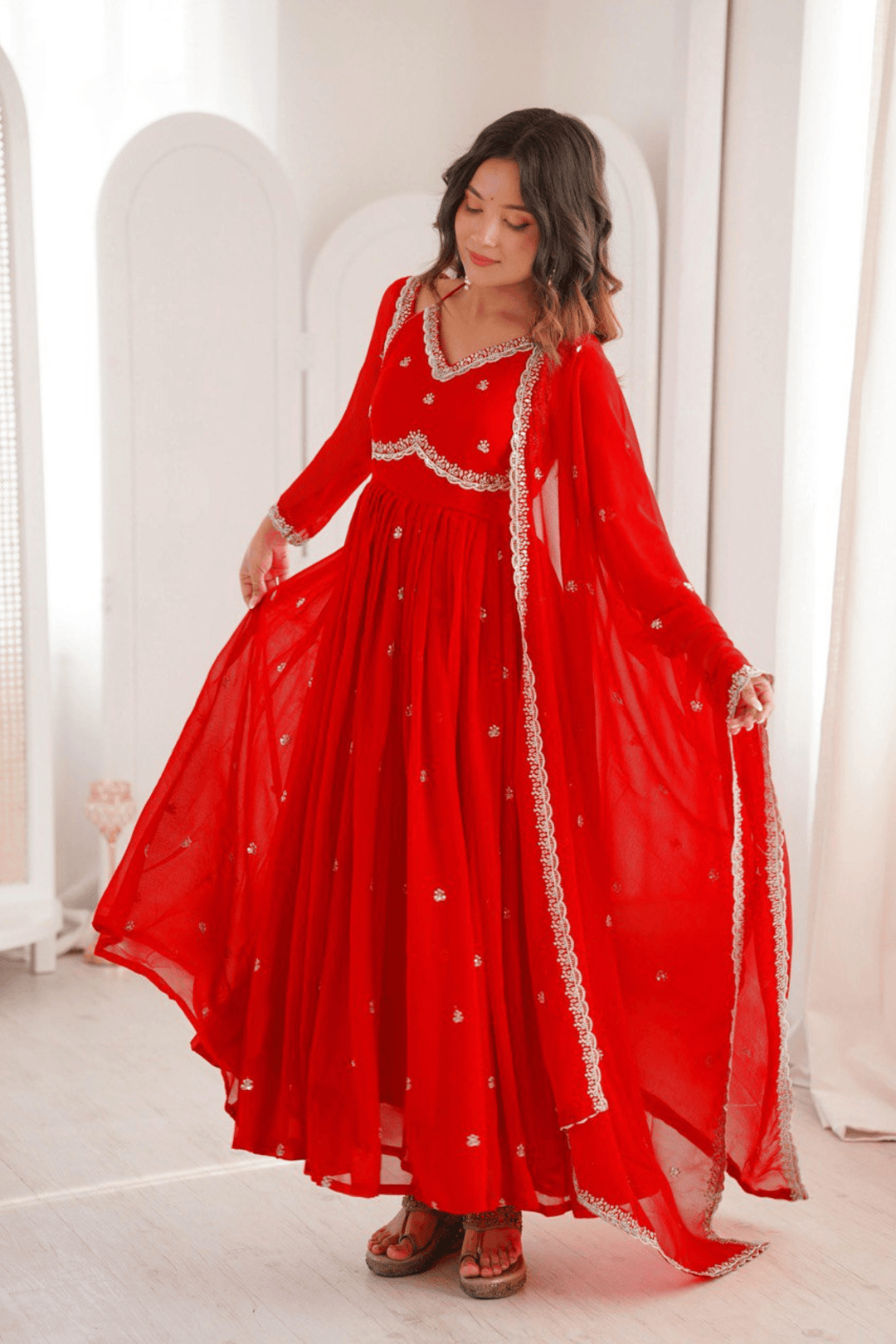 Radiate contemporary charm in the Majestic Ruby Flares Anarkali Suit, a premium ensemble tailored in rich georgette and adorned with intricate thread and sequin work. The soft micro inner ensures smooth comfort, while the elegant pant and finely crafted dupatta elevate its boutique appeal. This professionally shot, brand-exclusive outfit is perfect for high-end festive occasions, family functions, and party wear.