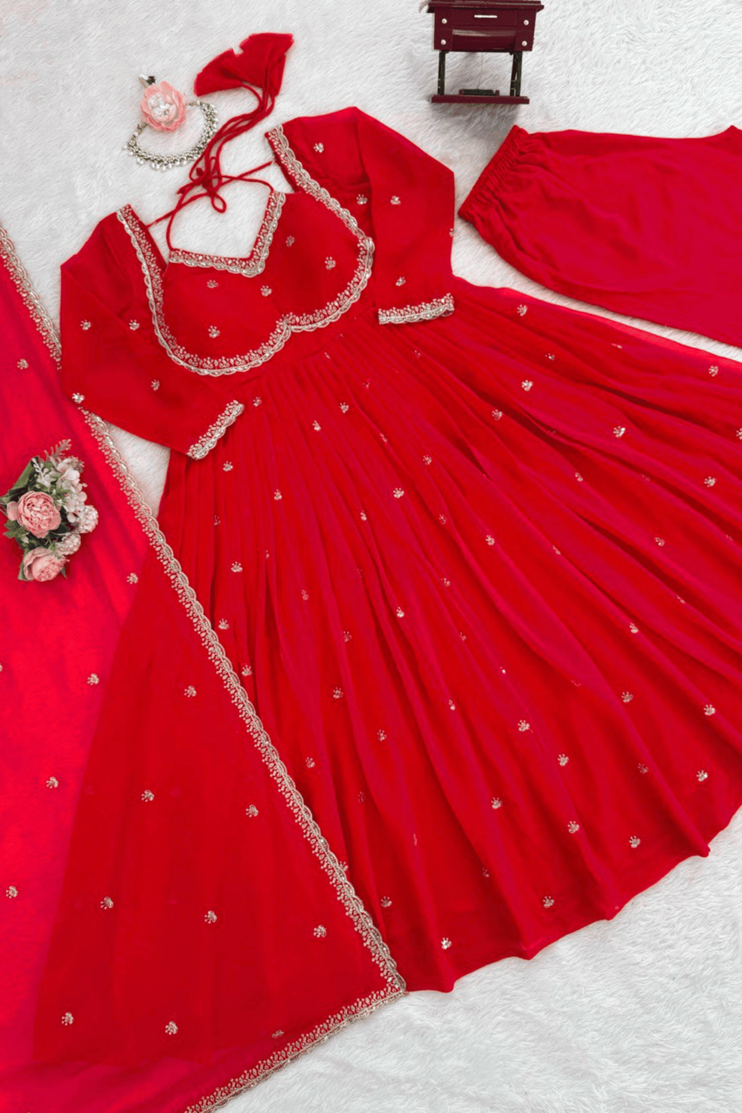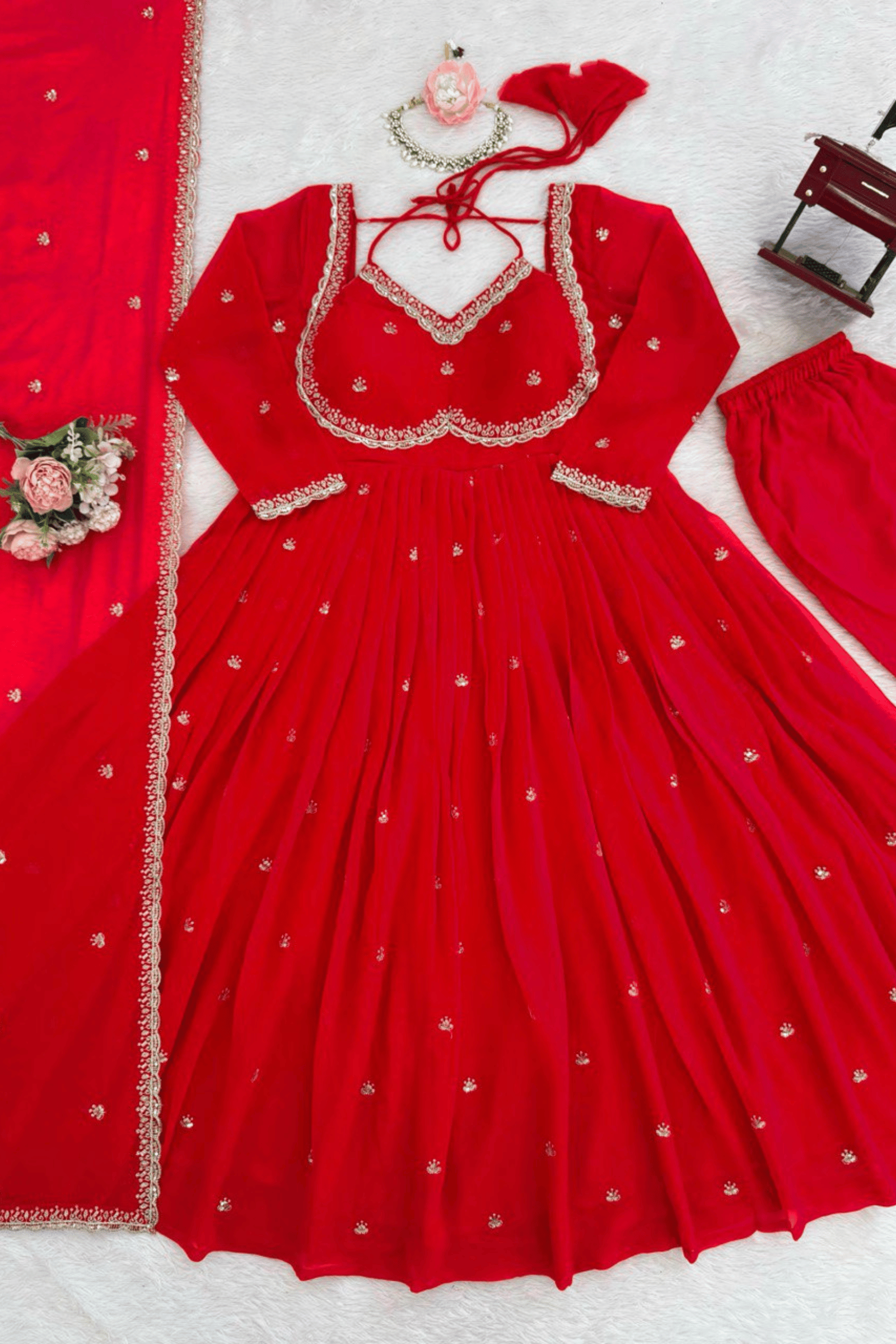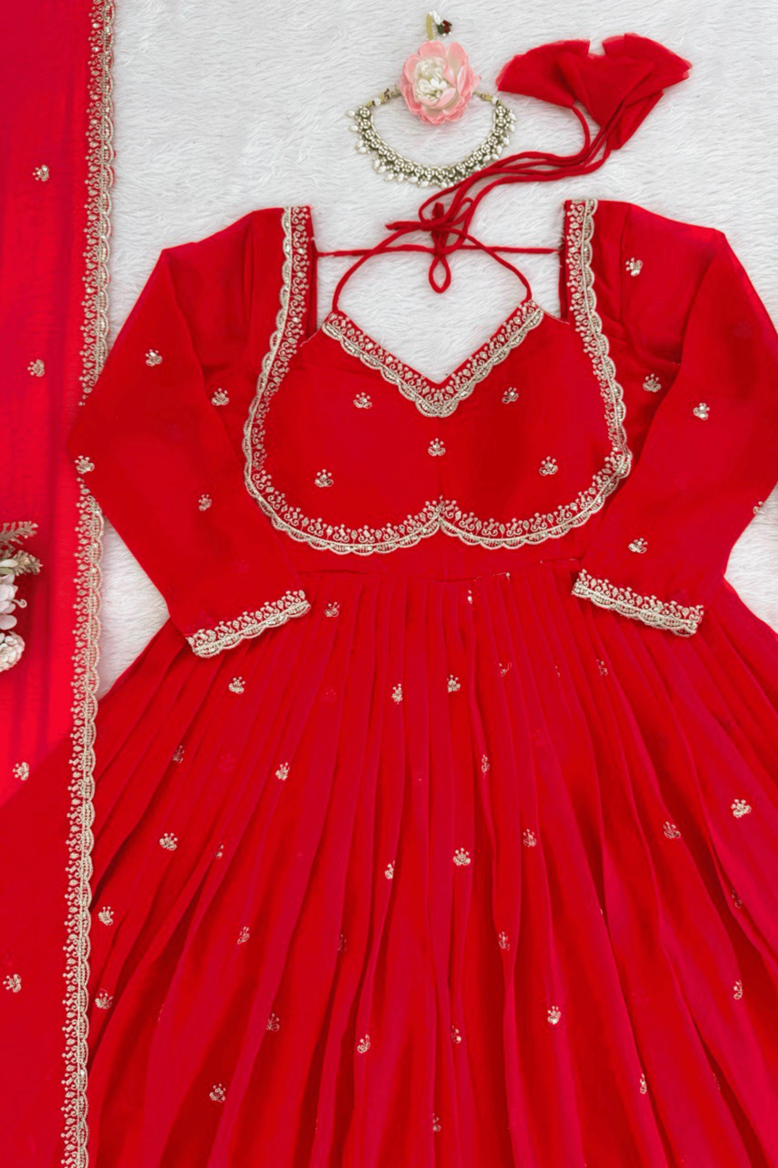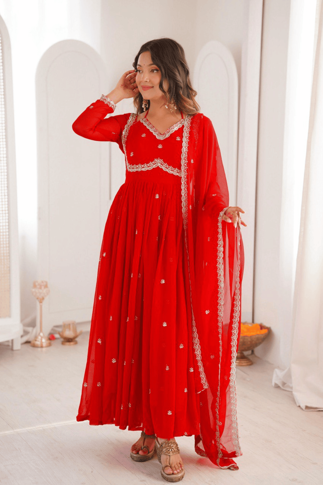 Radiate contemporary charm in the Majestic Ruby Flares Anarkali Suit, a premium ensemble tailored in rich georgette and adorned with intricate thread and sequin work. The soft micro inner ensures smooth comfort, while the elegant pant and finely crafted dupatta elevate its boutique appeal. This professionally shot, brand-exclusive outfit is perfect for high-end festive occasions, family functions, and party wear.