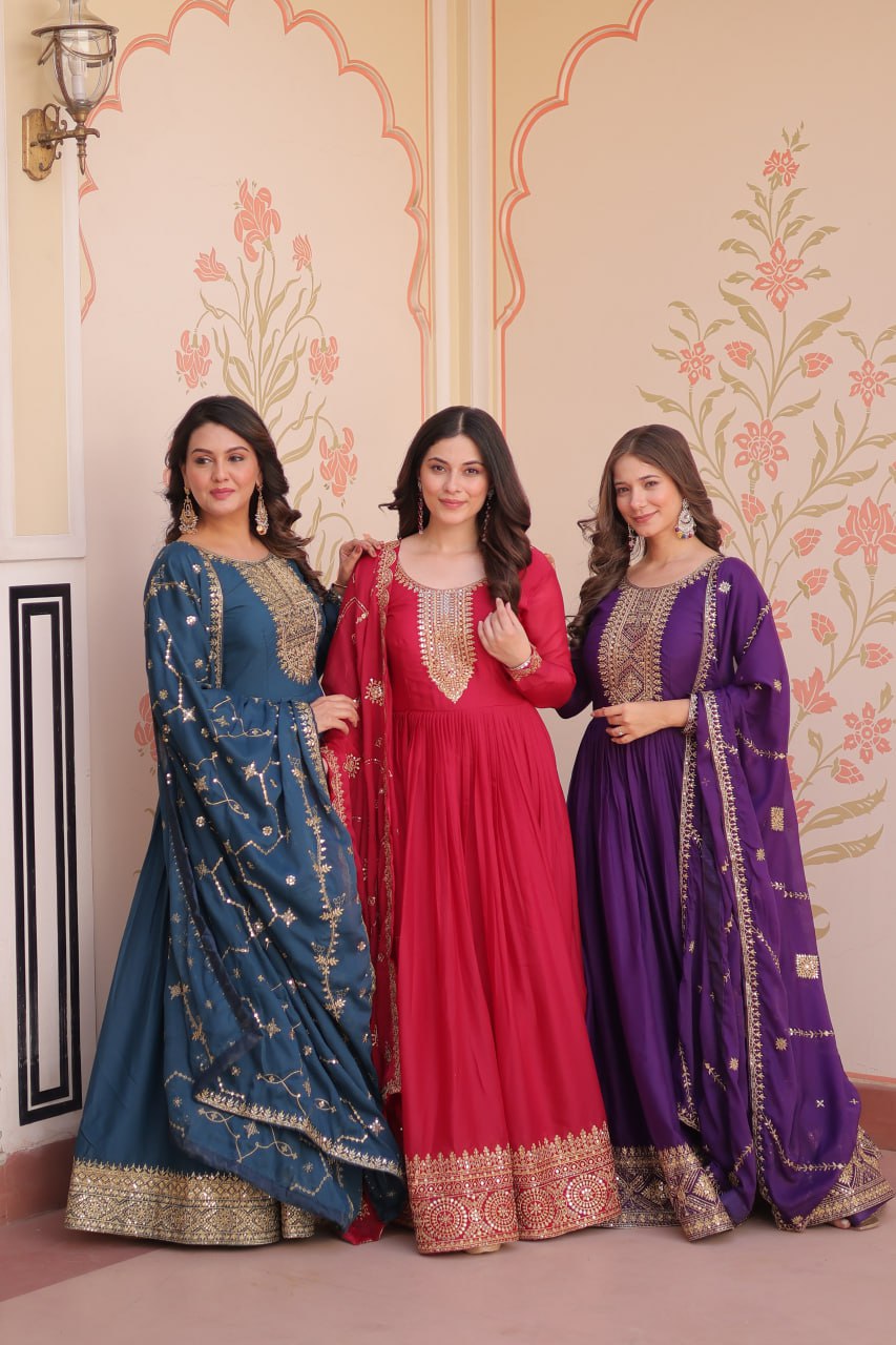 Step into effortless glamour with the Glamwiz Starlit Georgette Anarkali Suit, detailed with luxe Zari and Sequins embroidered artistry.