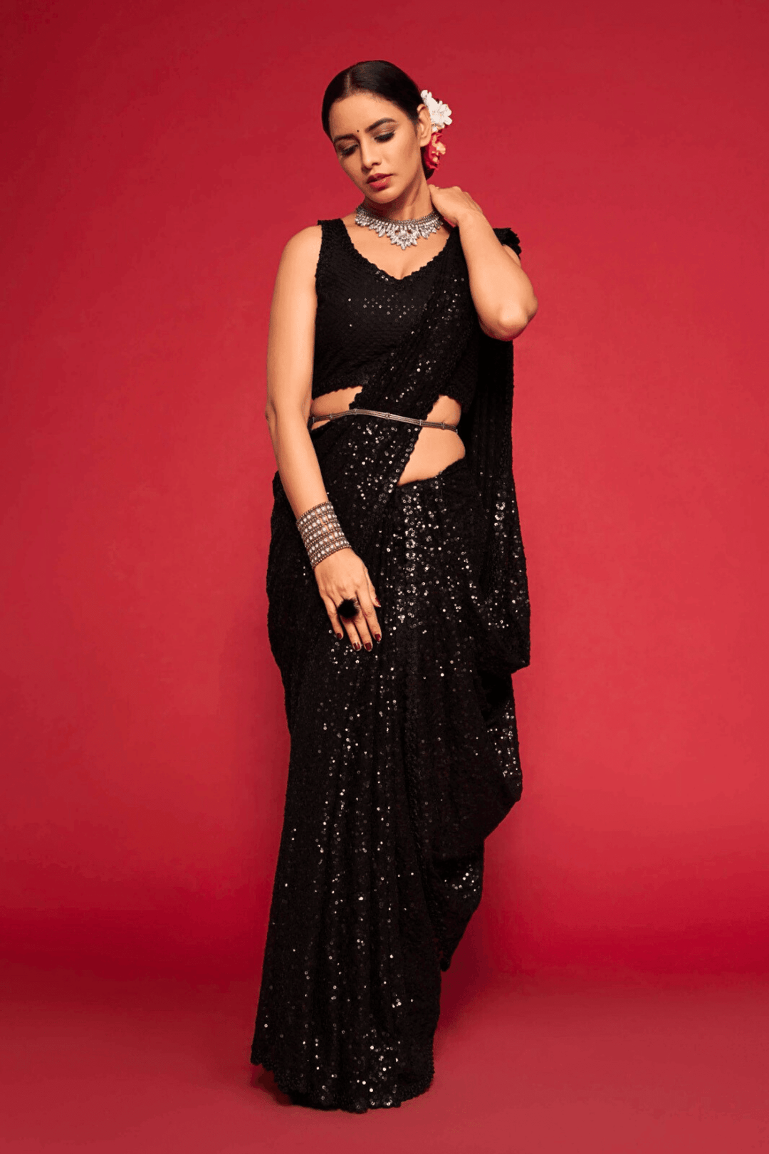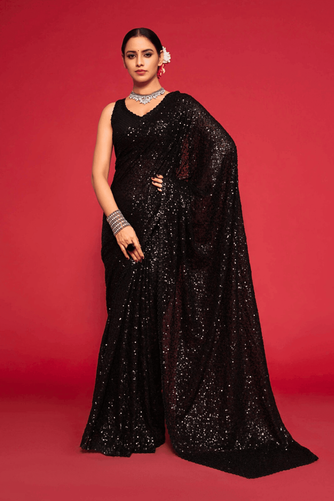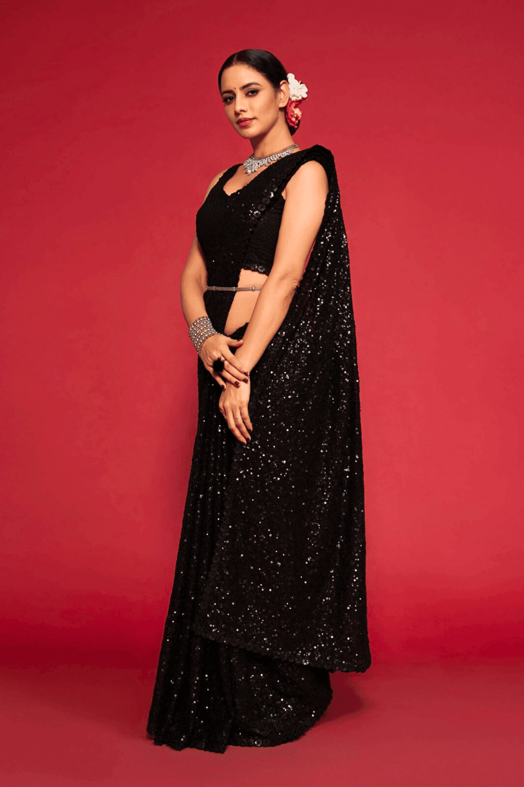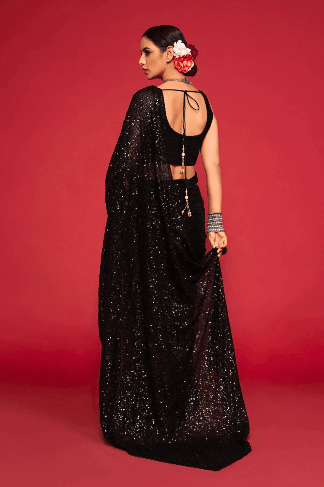Step into a mesmerizing "Midnight Black" with our Ready to wear Black Sequin Saree! This classic black saree, adorned with shimmering sequins, while offering the convenience of a ready-to-wear masterpiece.
