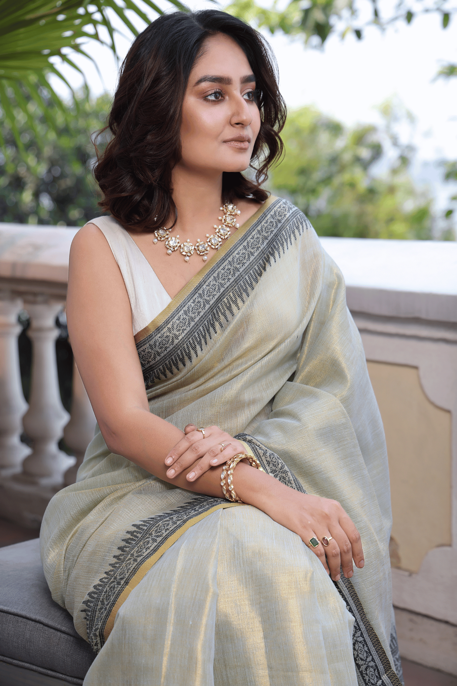 Step into subtle opulence with this Pearl Mist Linen Tissue Silk Saree, crafted for the modern woman who appreciates heritage weaves. Featuring a beautifully woven border and an elegant handloom-inspired pallu, this saree exudes natural sheen and sophistication.
