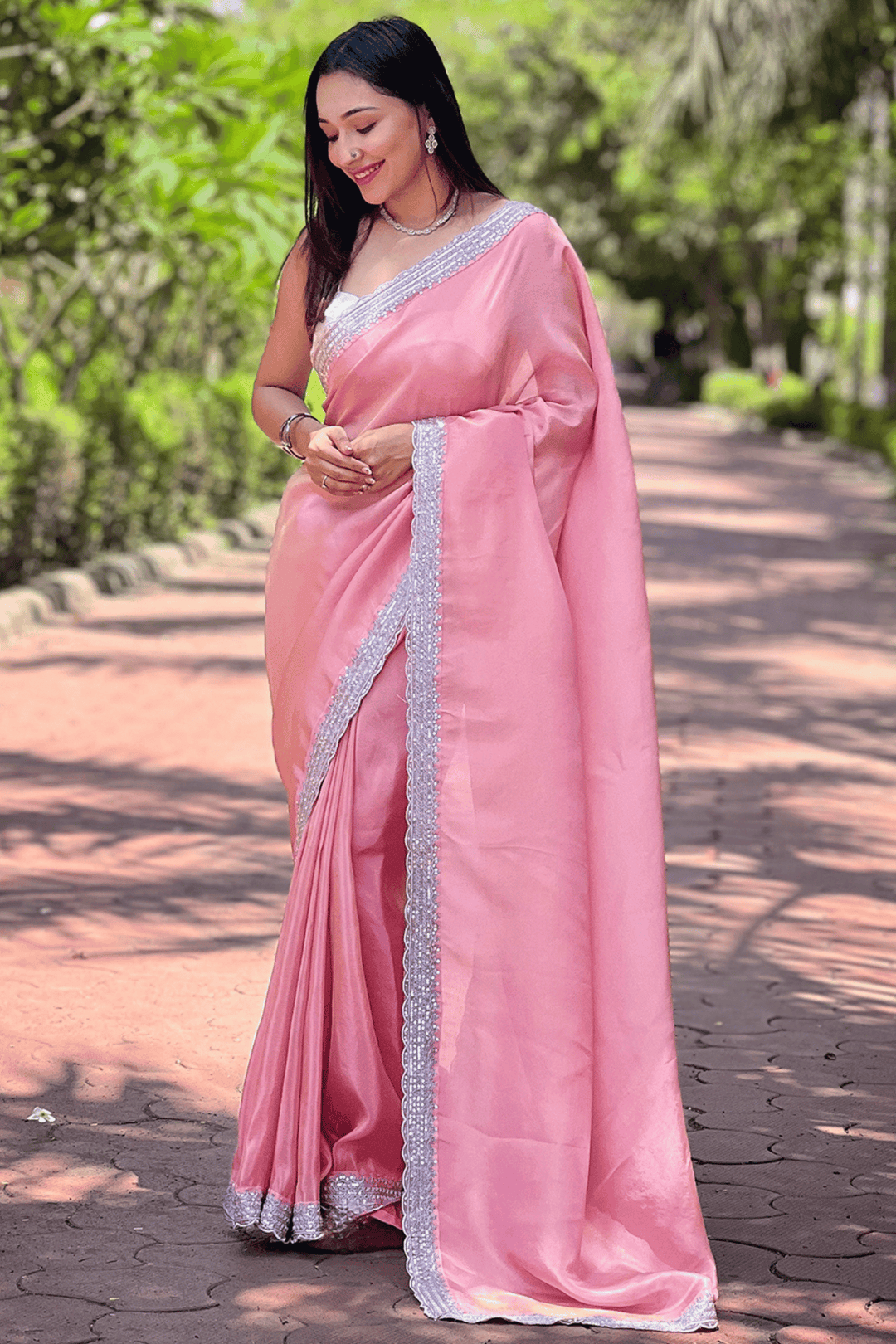 Pink saree in Tissue Fabric.