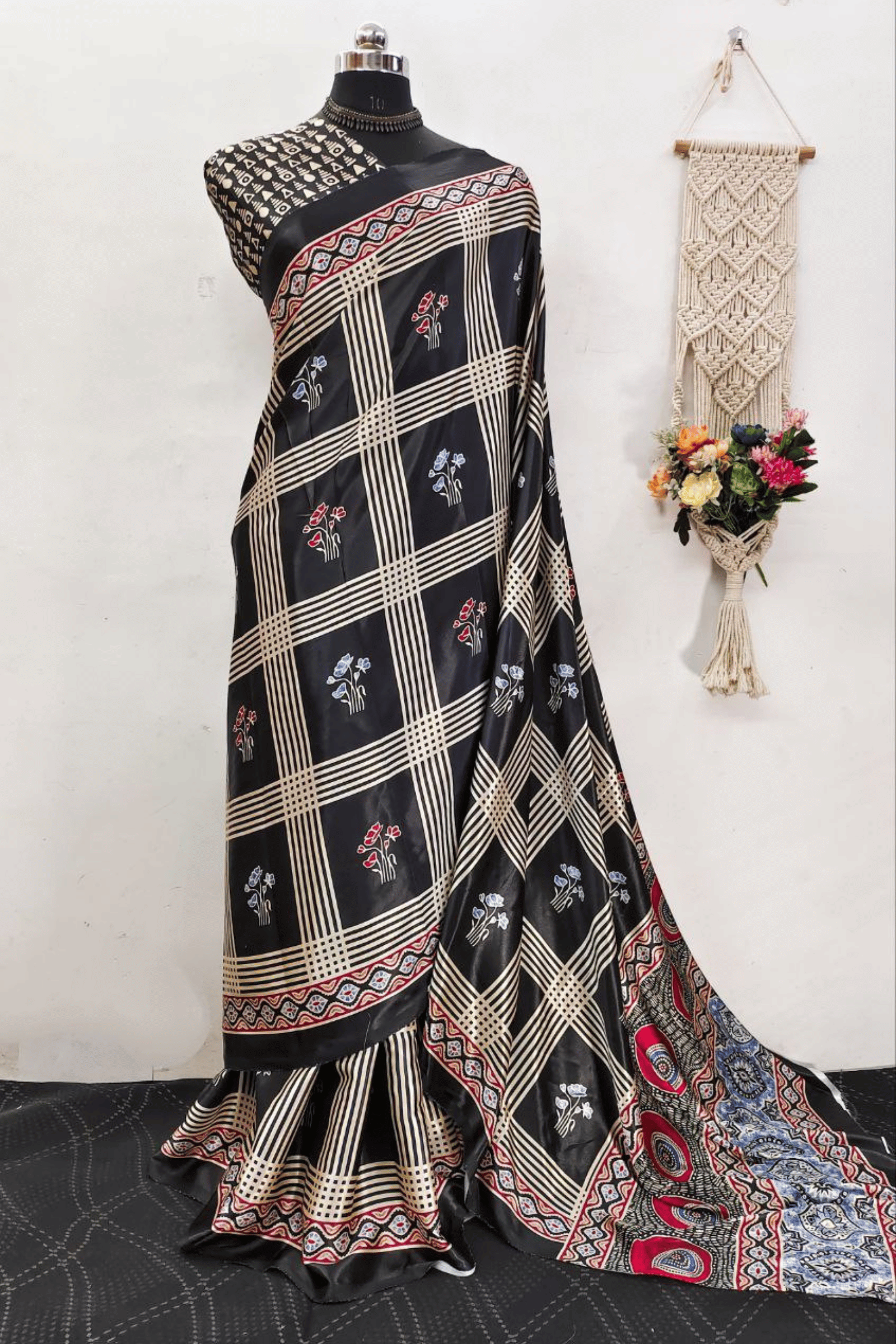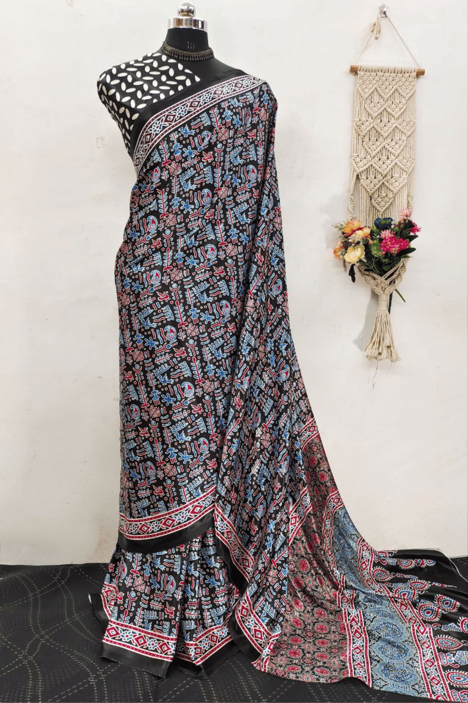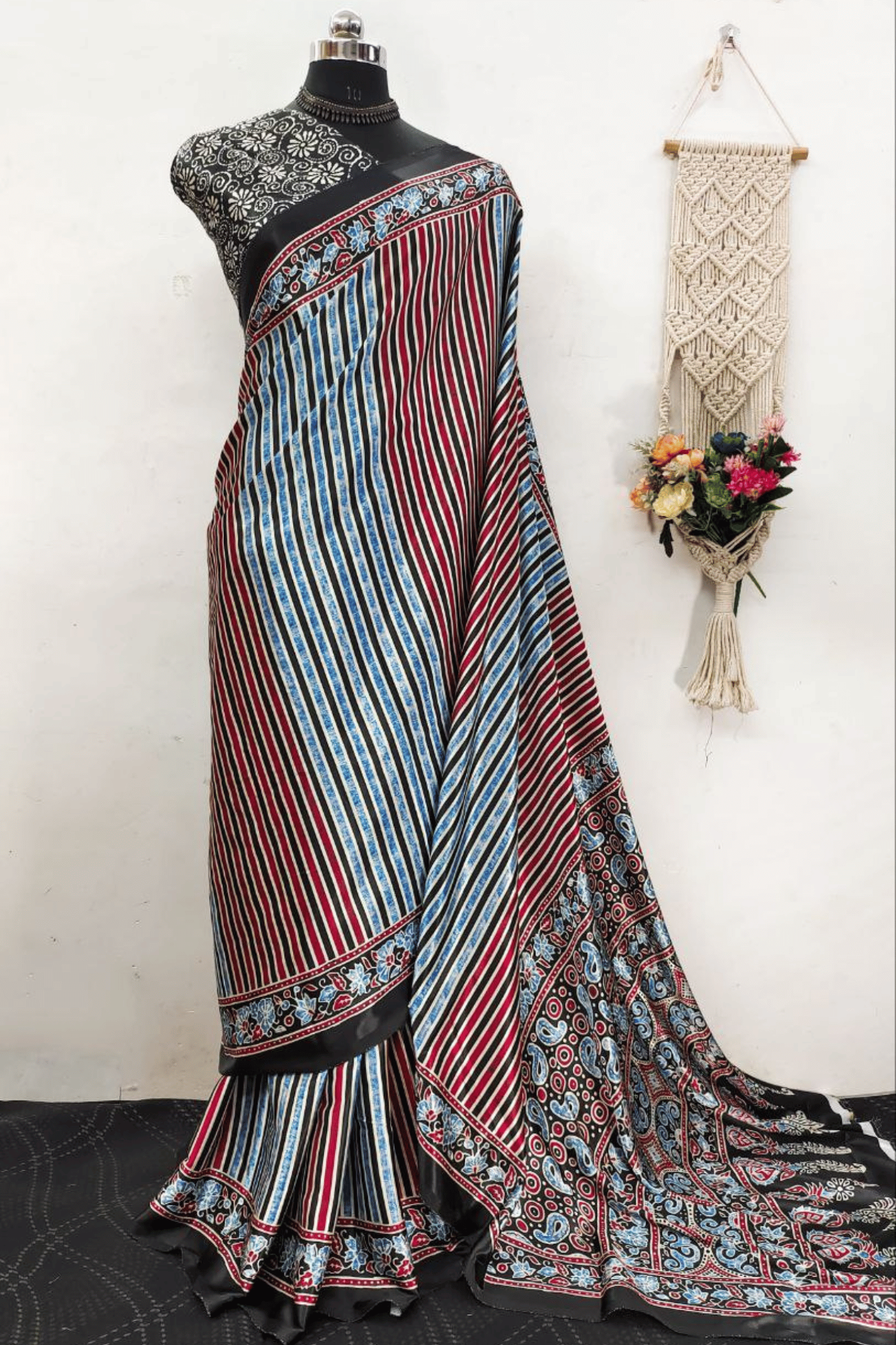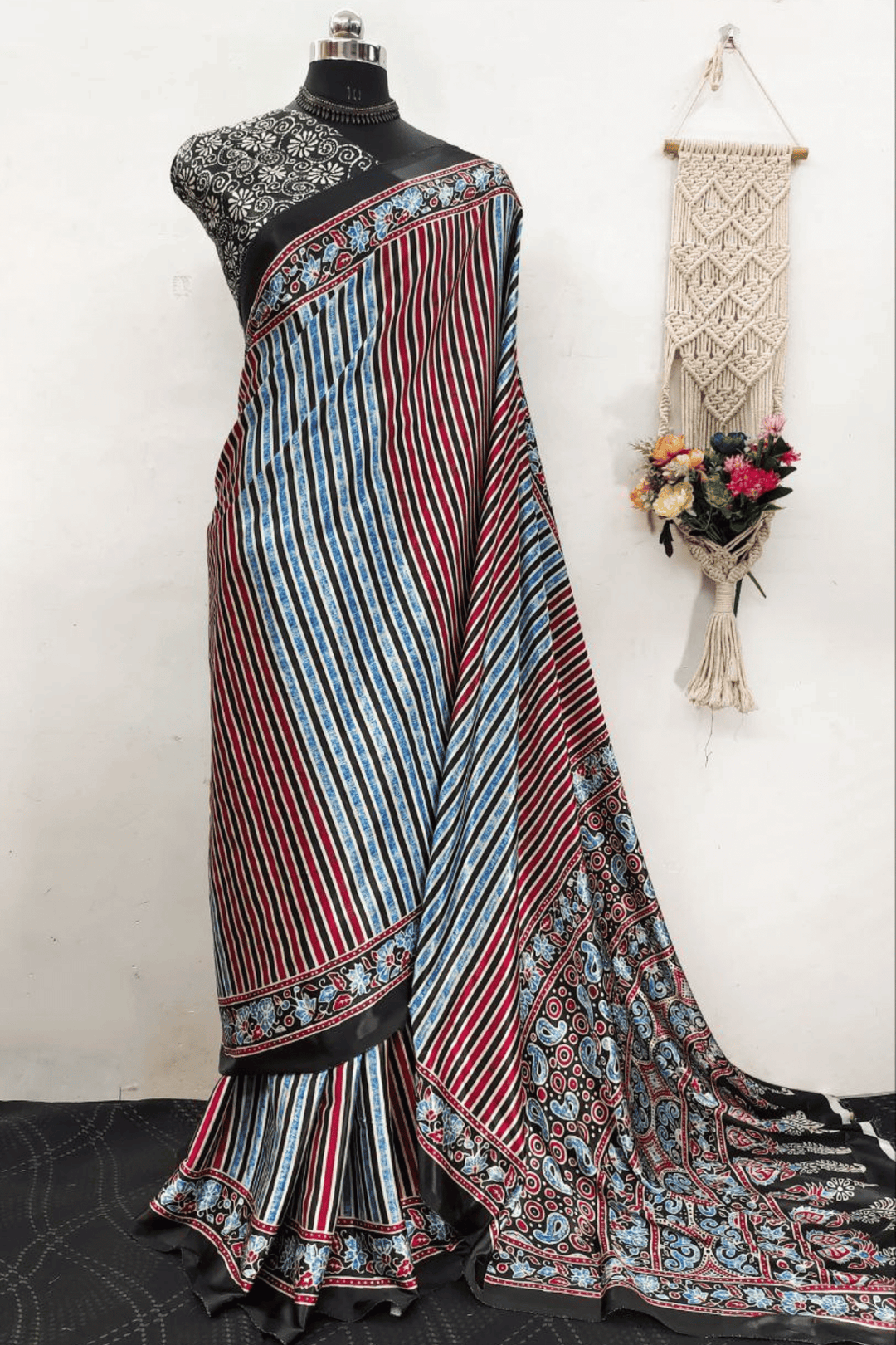 Introducing the Ajrakh Ready To Wear Saree collection. Crafted from elegant Ajarakh-printed satin crepe, these sarees bring together the richness of traditional Ajrakh motifs with the fluid drape of luxe satin.
