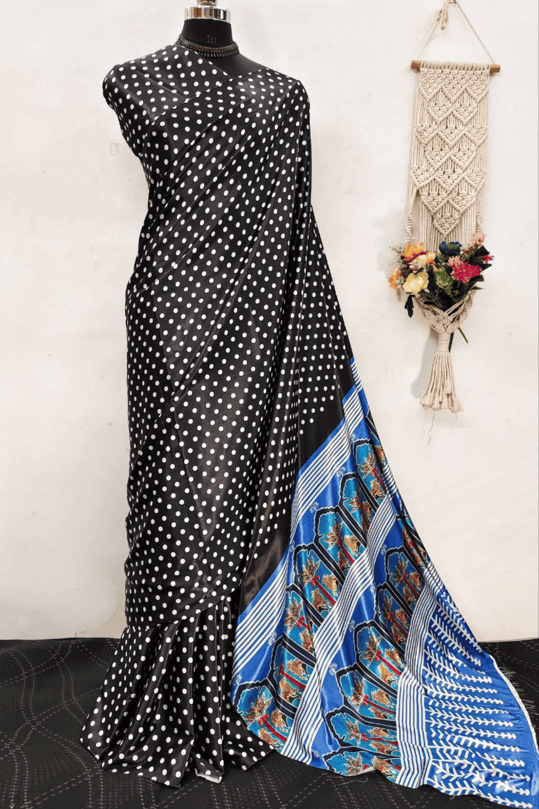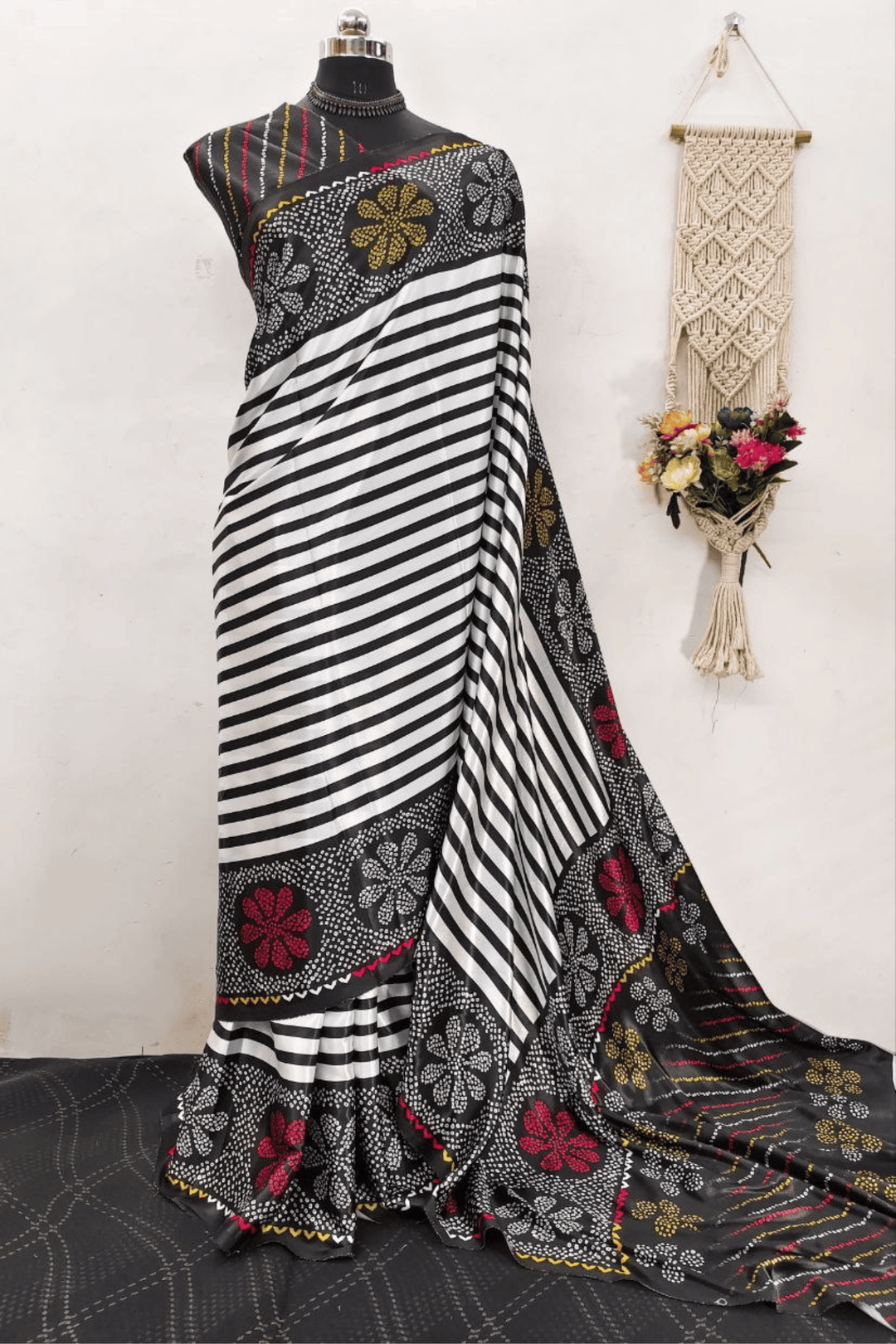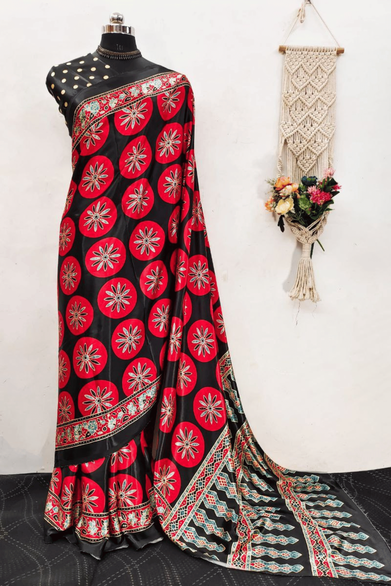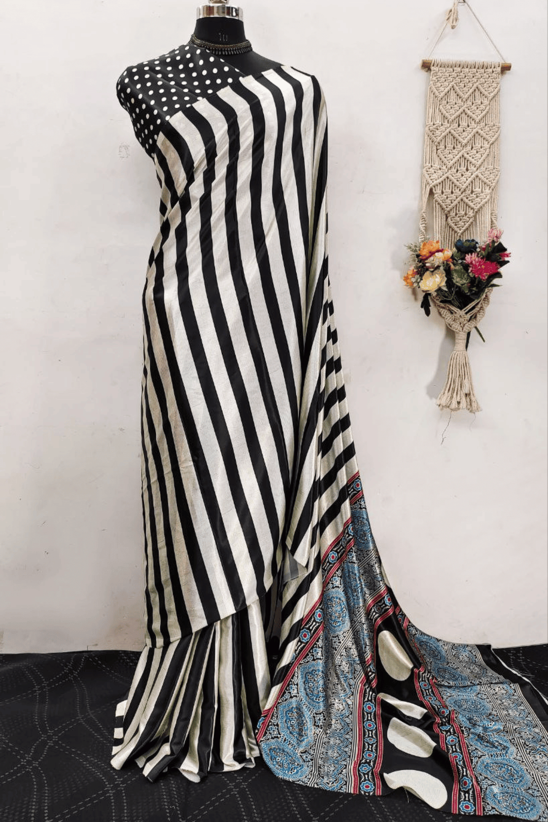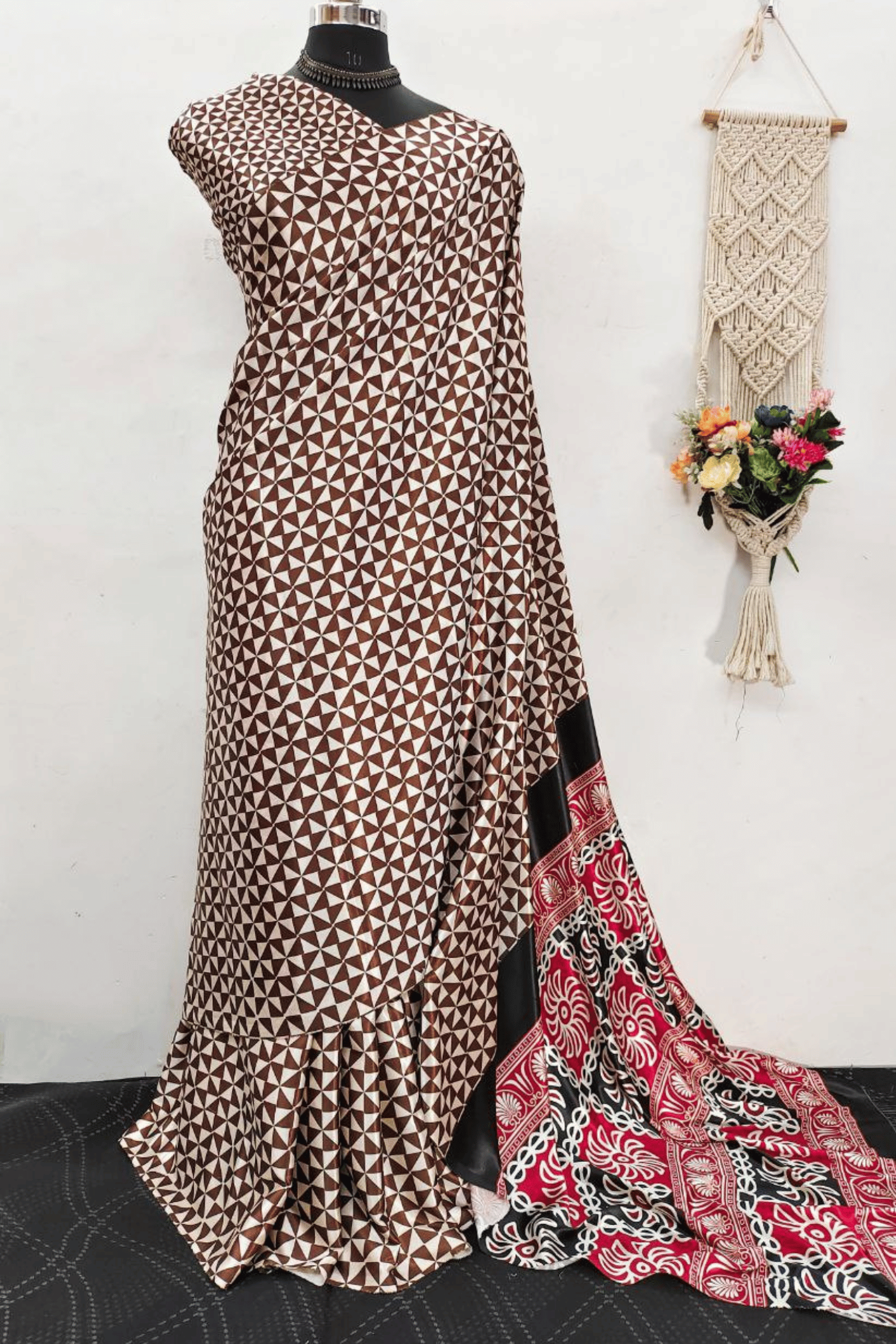 Introducing the Ajrakh Ready To Wear Saree collection. Crafted from elegant Ajarakh-printed satin crepe, these sarees bring together the richness of traditional Ajrakh motifs with the fluid drape of luxe satin.