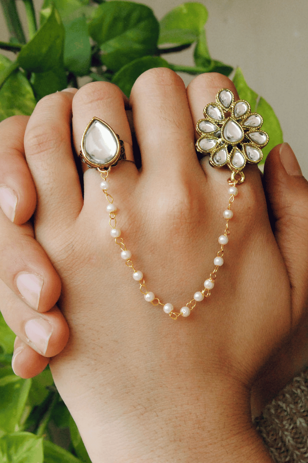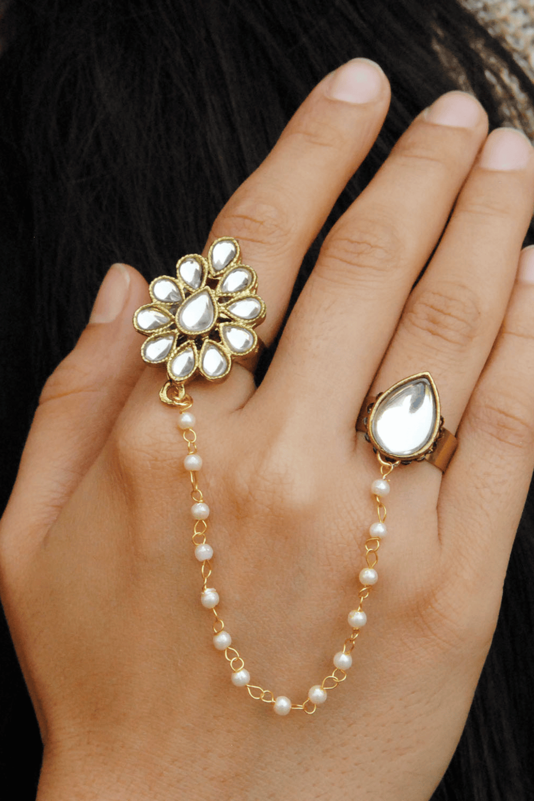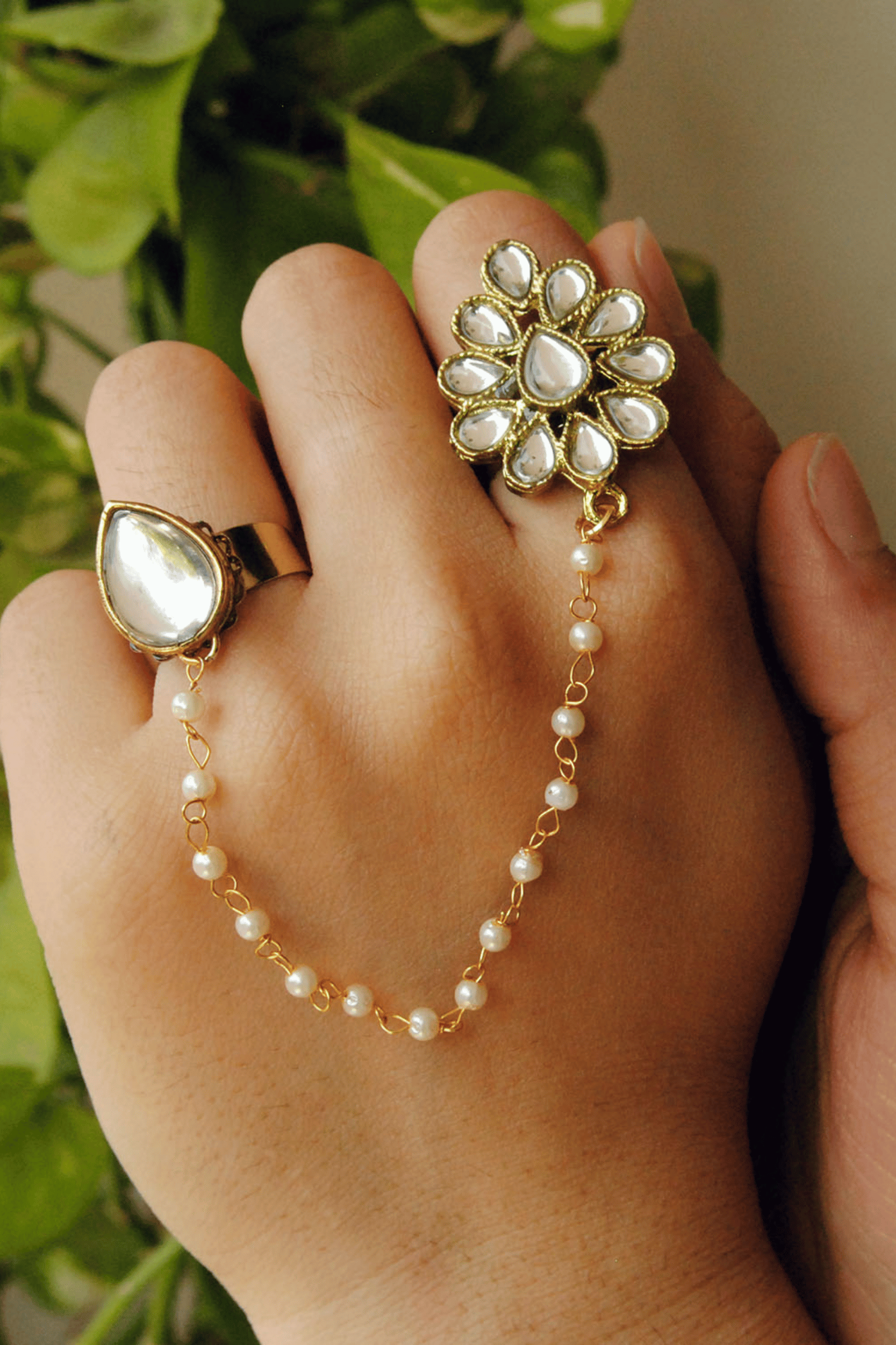 Own this exclusive two finger kundan Ring and take pride in flaunting an ethnic design this season. White flower kundan ring and a white kundan rings are connected by the mesmerizing white cats eye beaded chain.