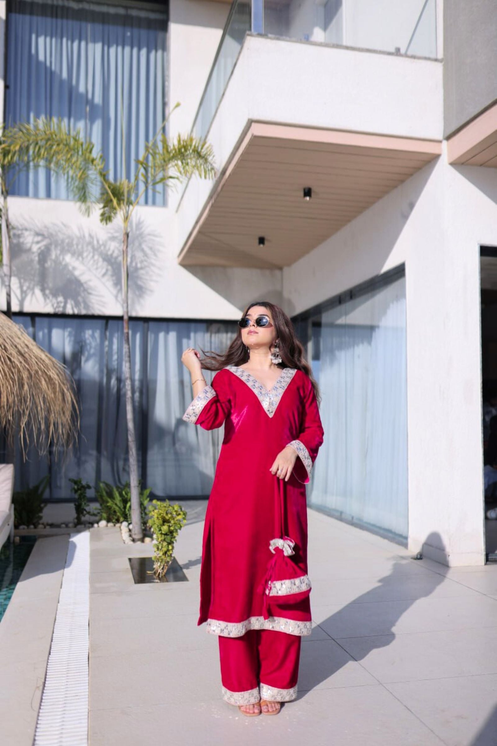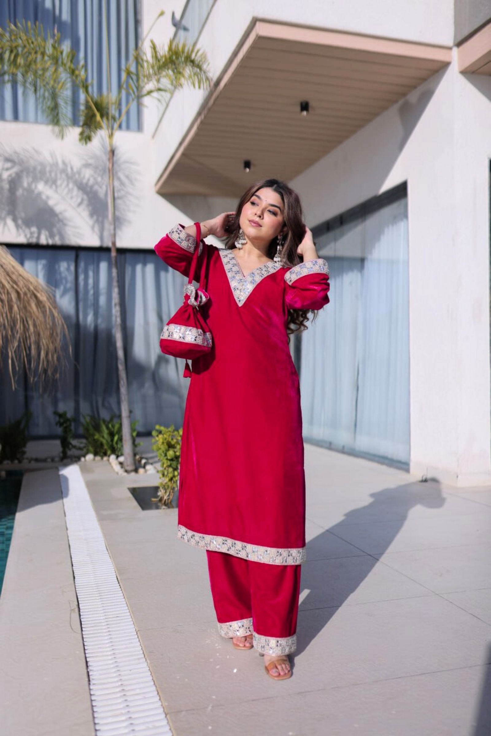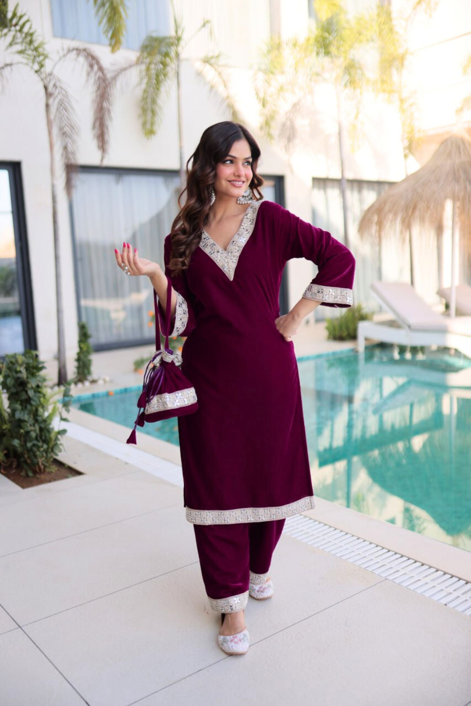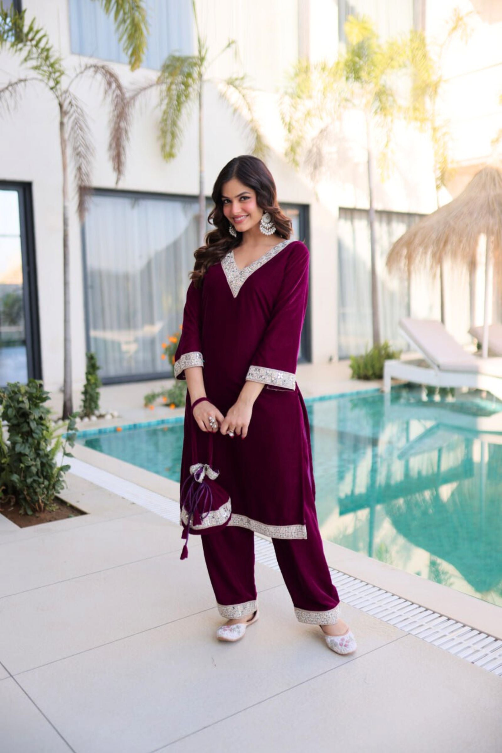 Step into regal elegance with the Crimson & Wine Velvet Coord Set. Its rich velvet fabric, adorned with intricate sequins and zari embroidery, exudes luxury and sophistication. Paired with a matching dupatta and perfectly crafted pants, this ensemble is designed to make you shine at weddings, festive occasions, or grand celebrations.