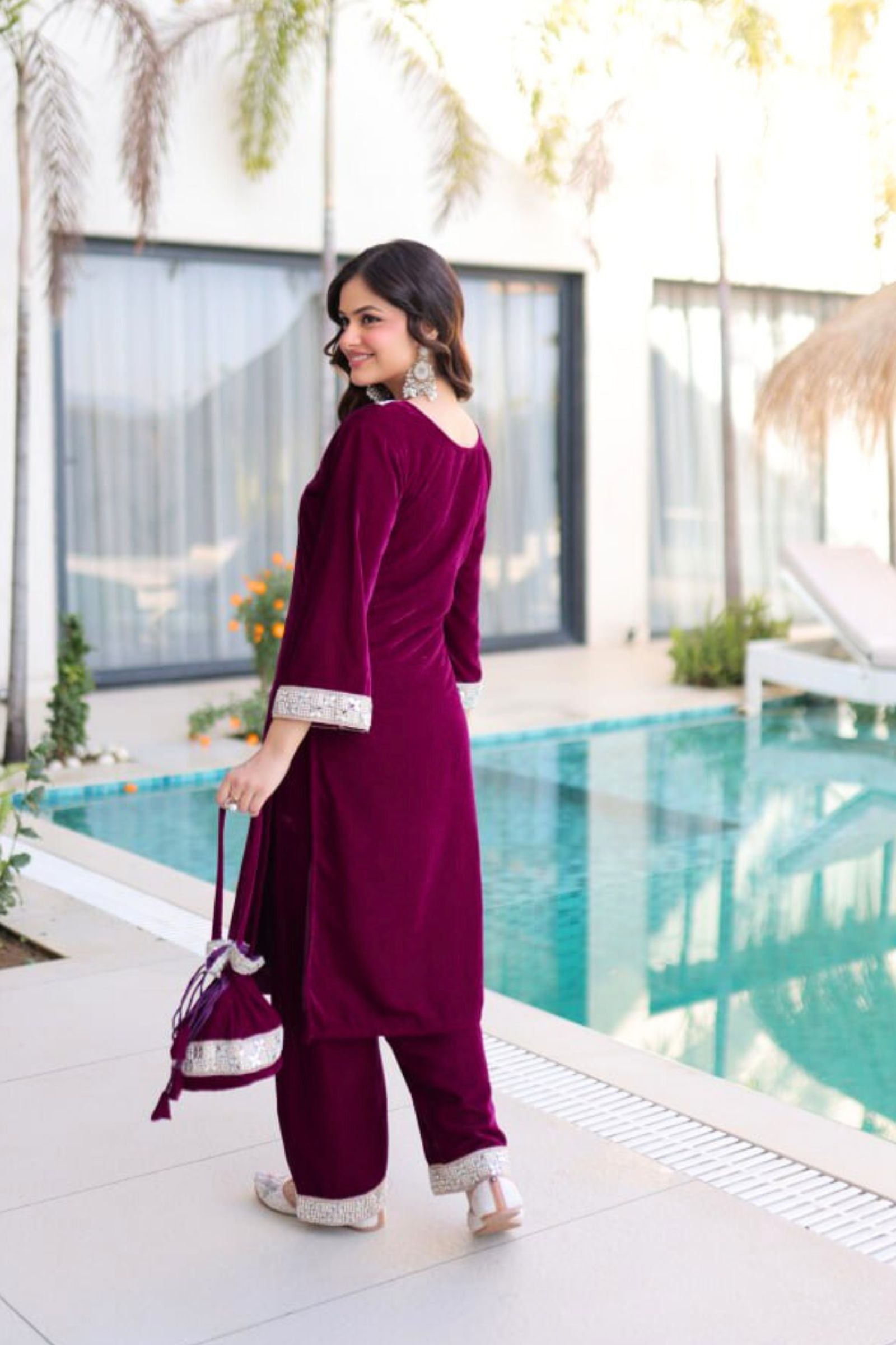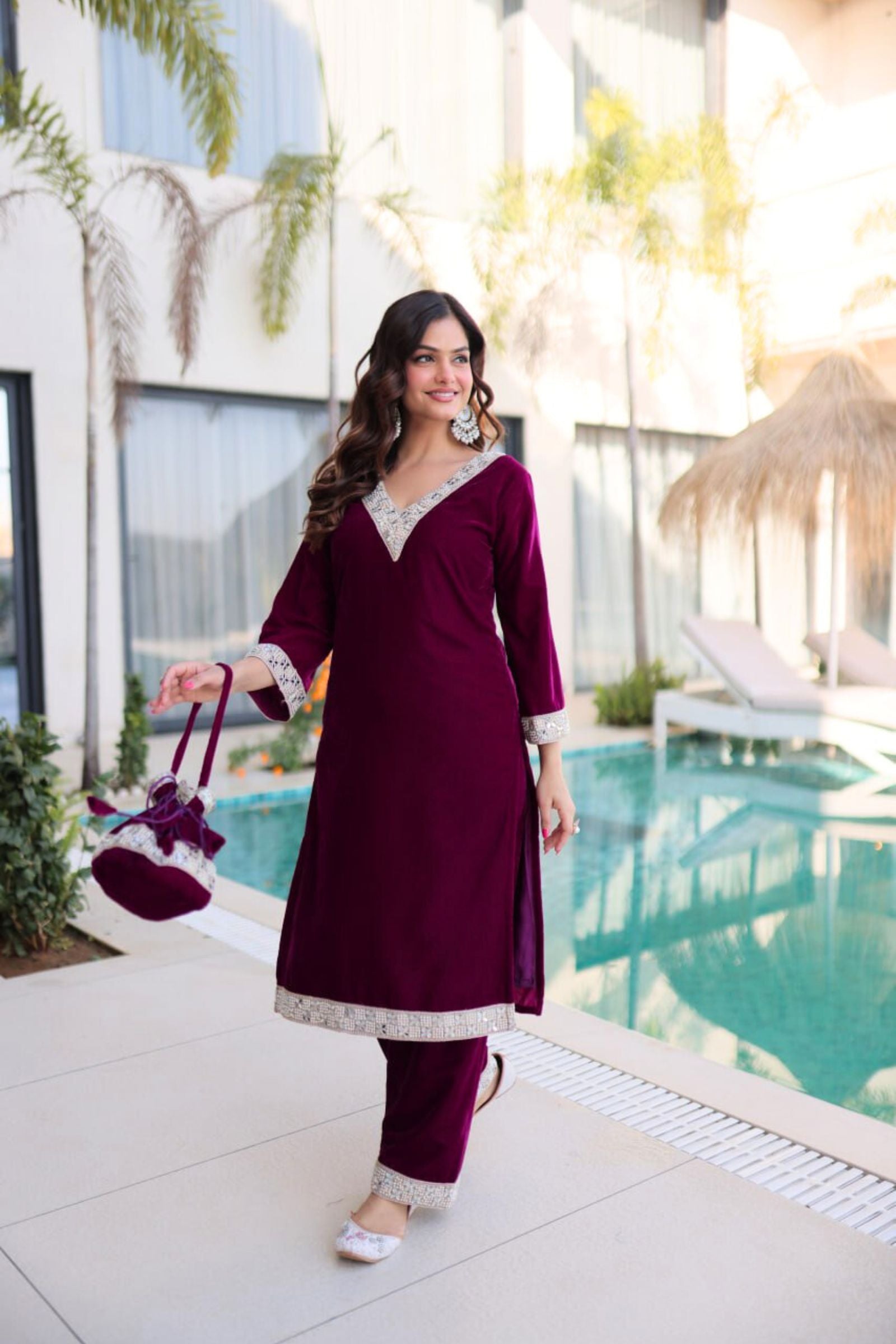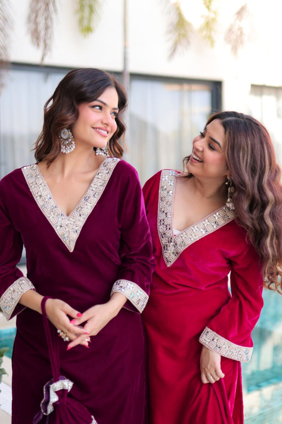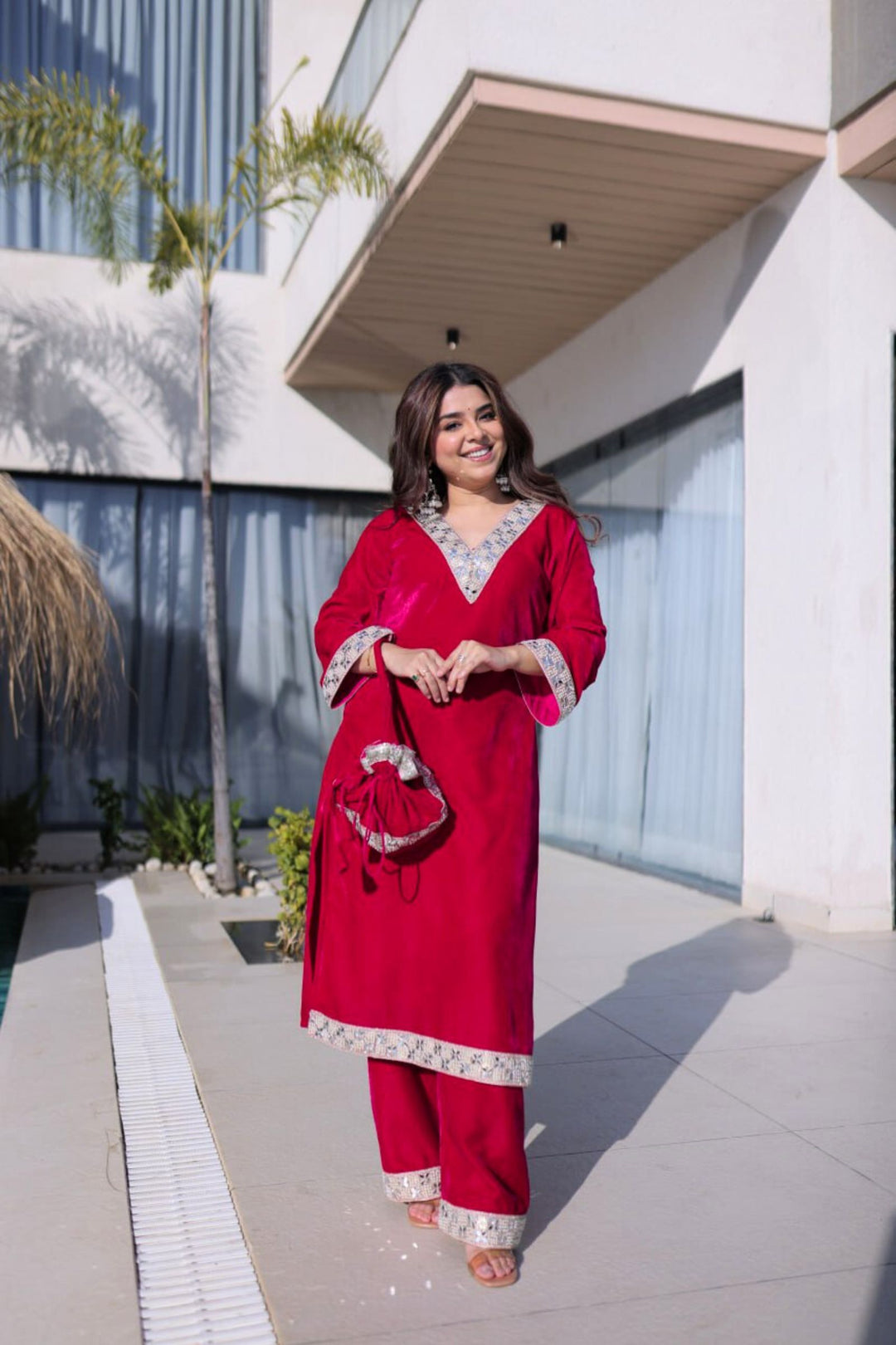 Step into regal elegance with the Crimson & Wine Velvet Coord Set. Its rich velvet fabric, adorned with intricate sequins and zari embroidery, exudes luxury and sophistication. Paired with a matching dupatta and perfectly crafted pants, this ensemble is designed to make you shine at weddings, festive occasions, or grand celebrations.