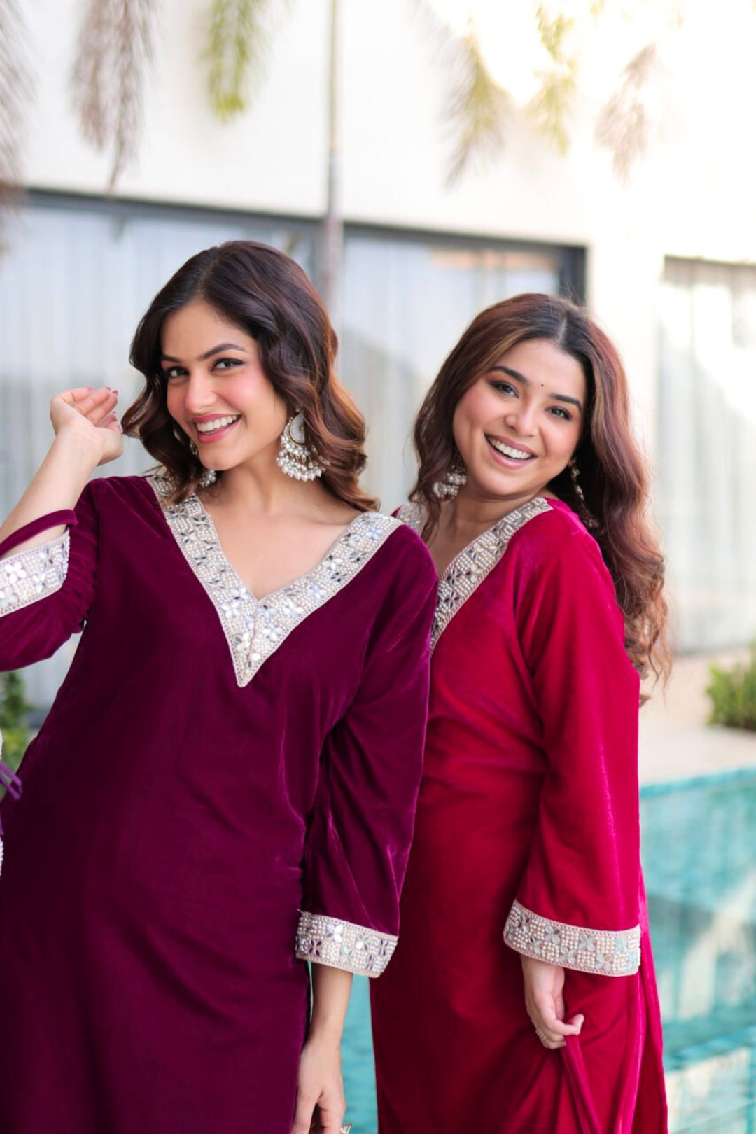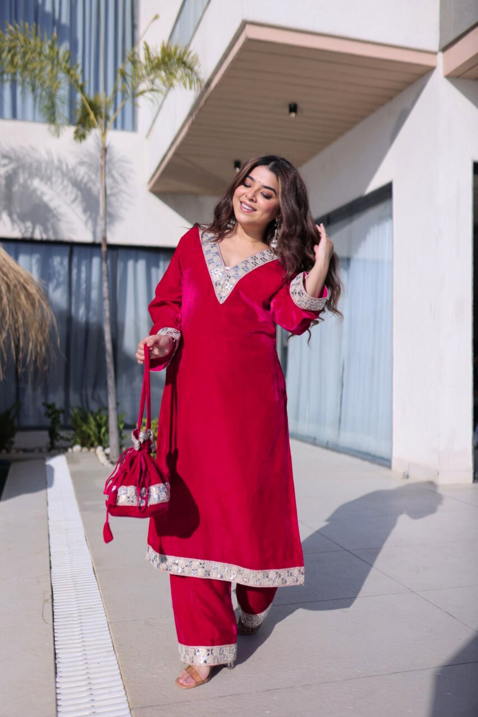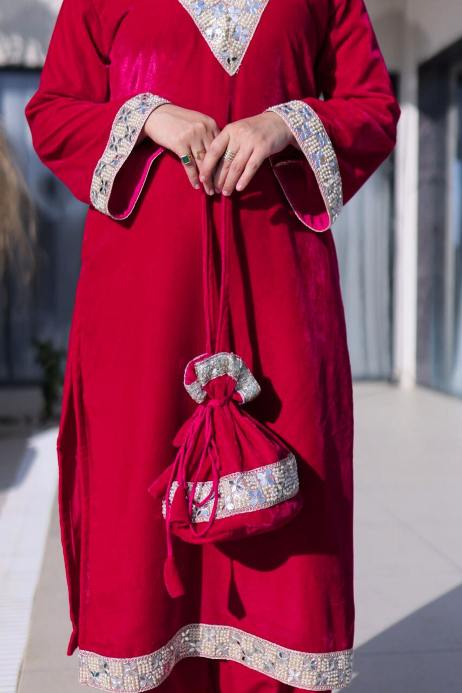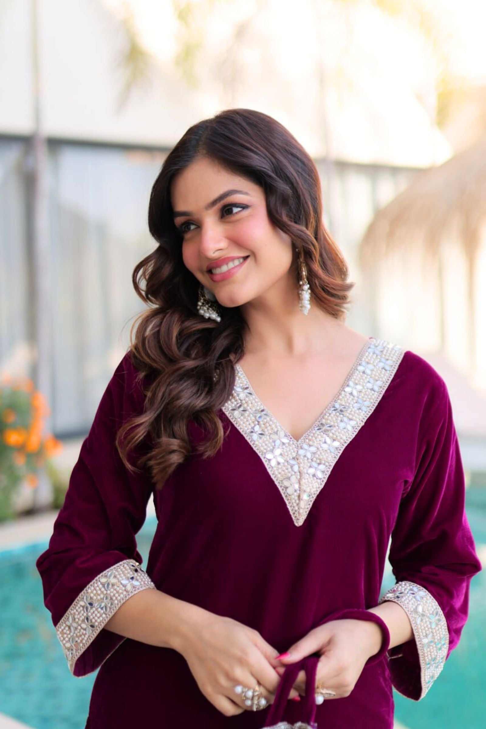 Step into regal elegance with the Crimson & Wine Velvet Coord Set. Its rich velvet fabric, adorned with intricate sequins and zari embroidery, exudes luxury and sophistication. Paired with a matching dupatta and perfectly crafted pants, this ensemble is designed to make you shine at weddings, festive occasions, or grand celebrations.