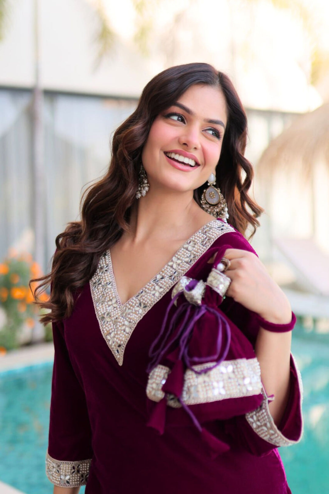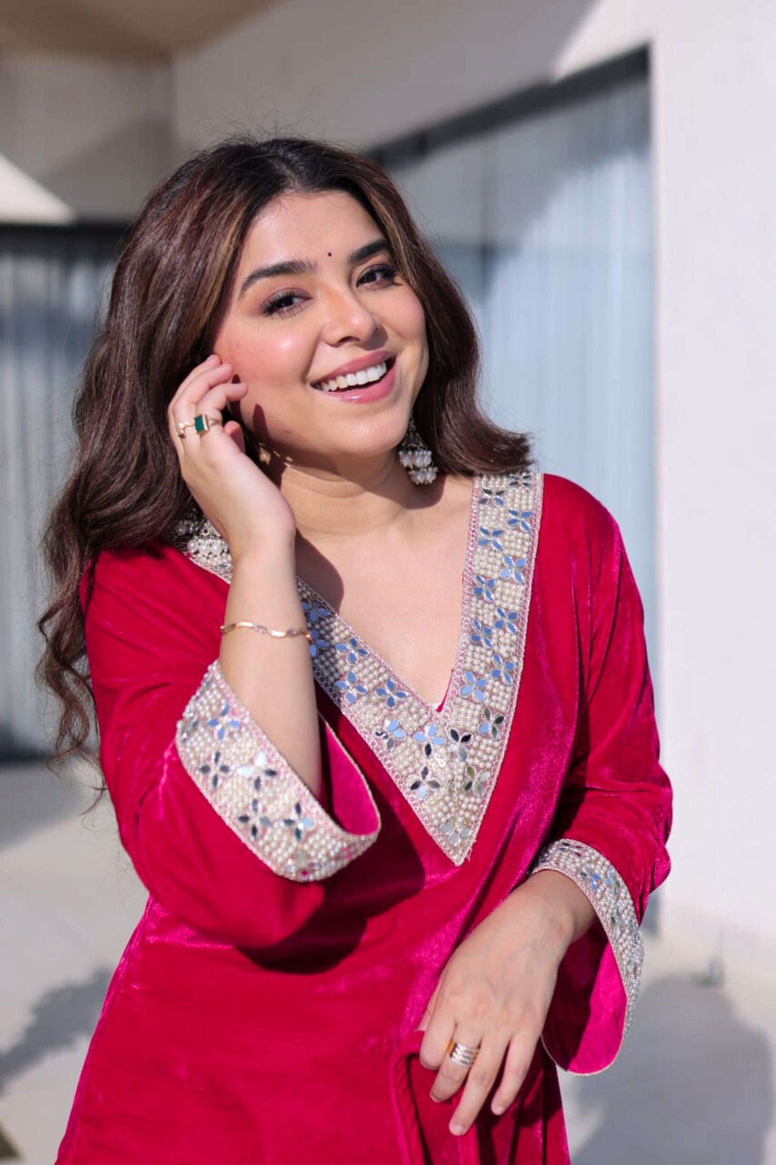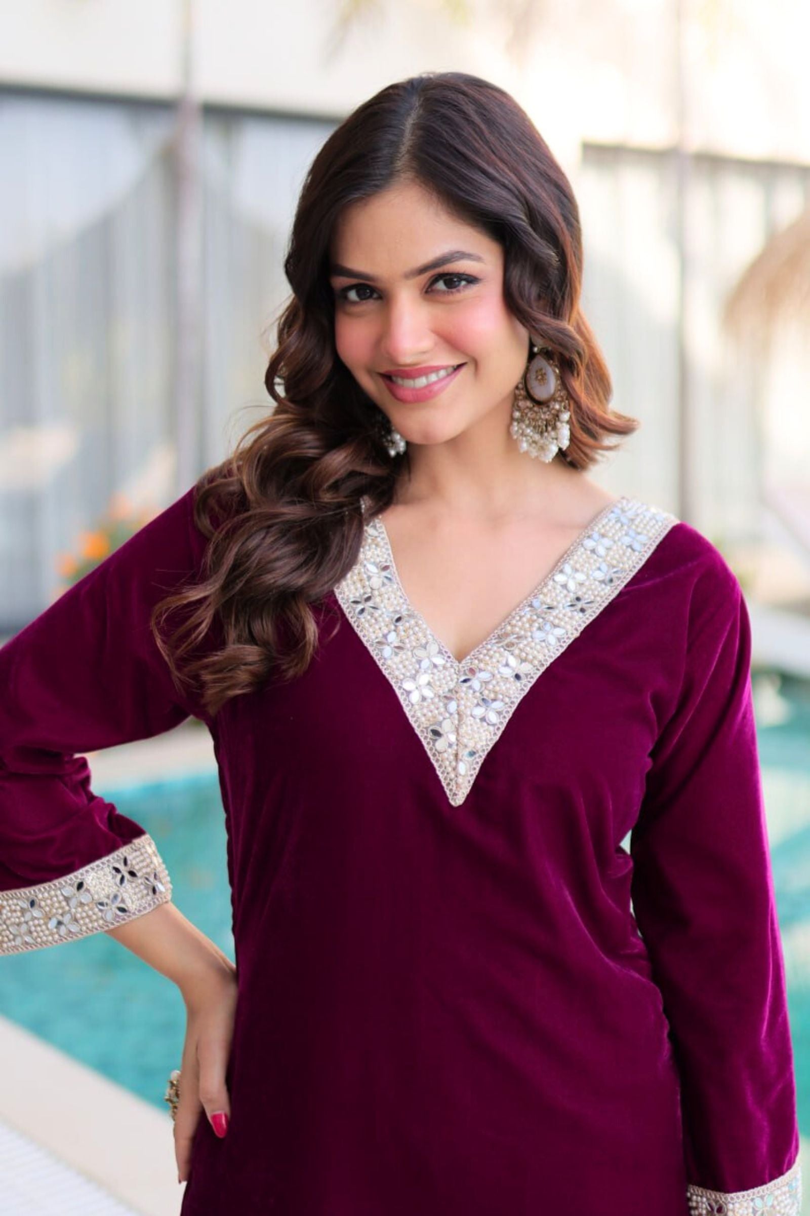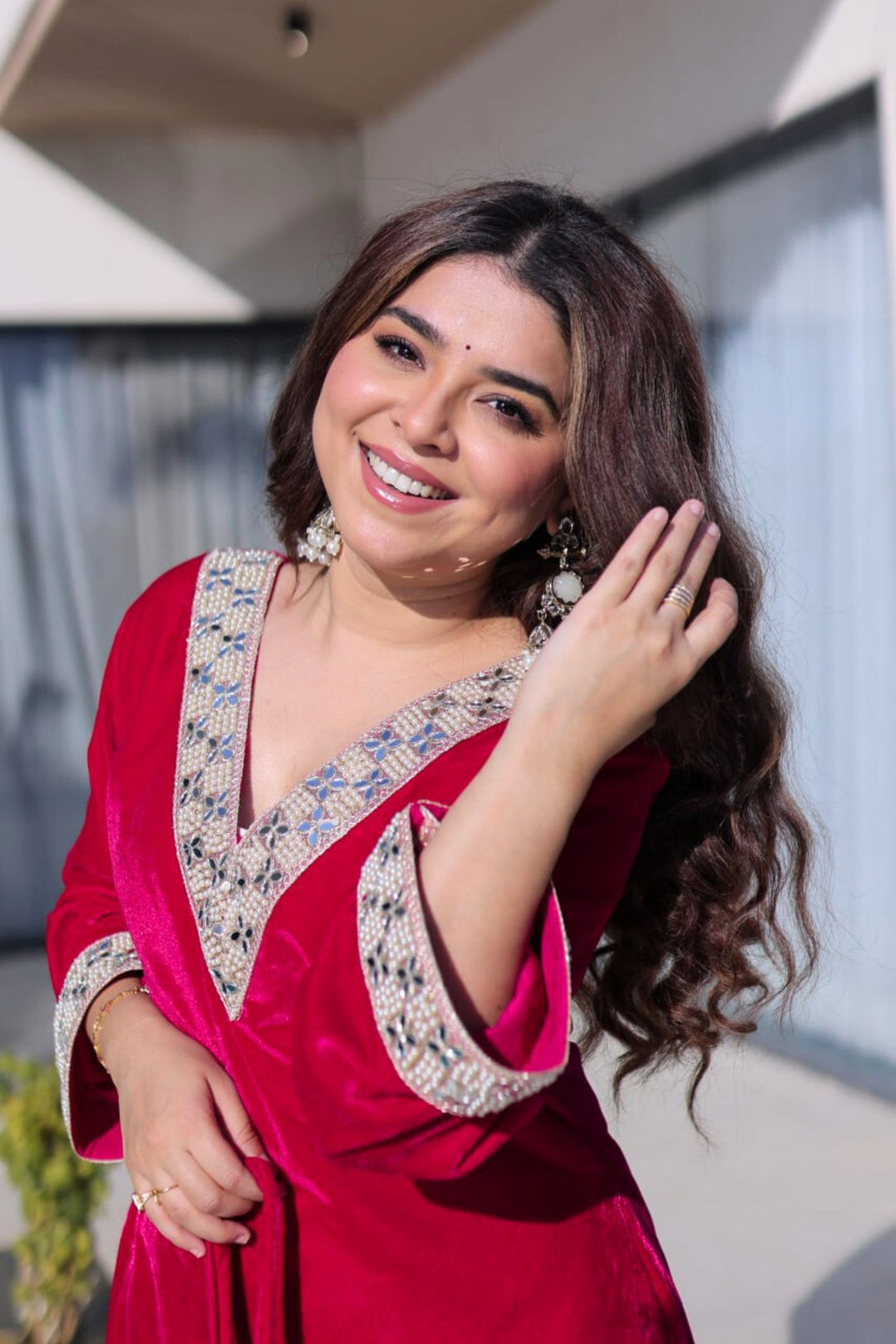 Step into regal elegance with the Crimson & Wine Velvet Coord Set. Its rich velvet fabric, adorned with intricate sequins and zari embroidery, exudes luxury and sophistication. Paired with a matching dupatta and perfectly crafted pants, this ensemble is designed to make you shine at weddings, festive occasions, or grand celebrations.