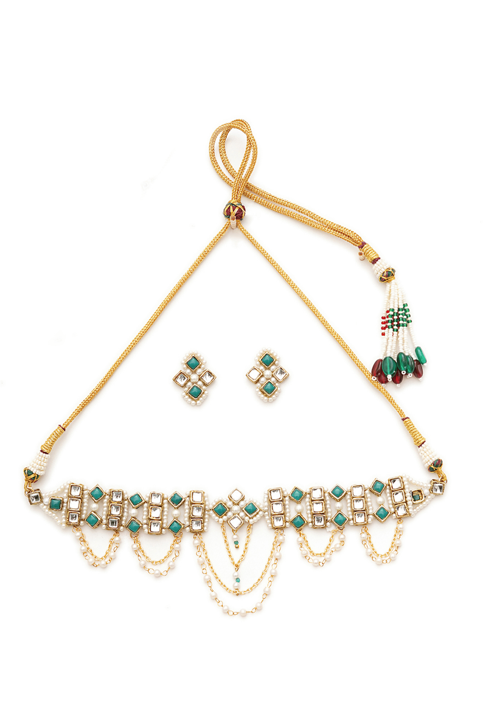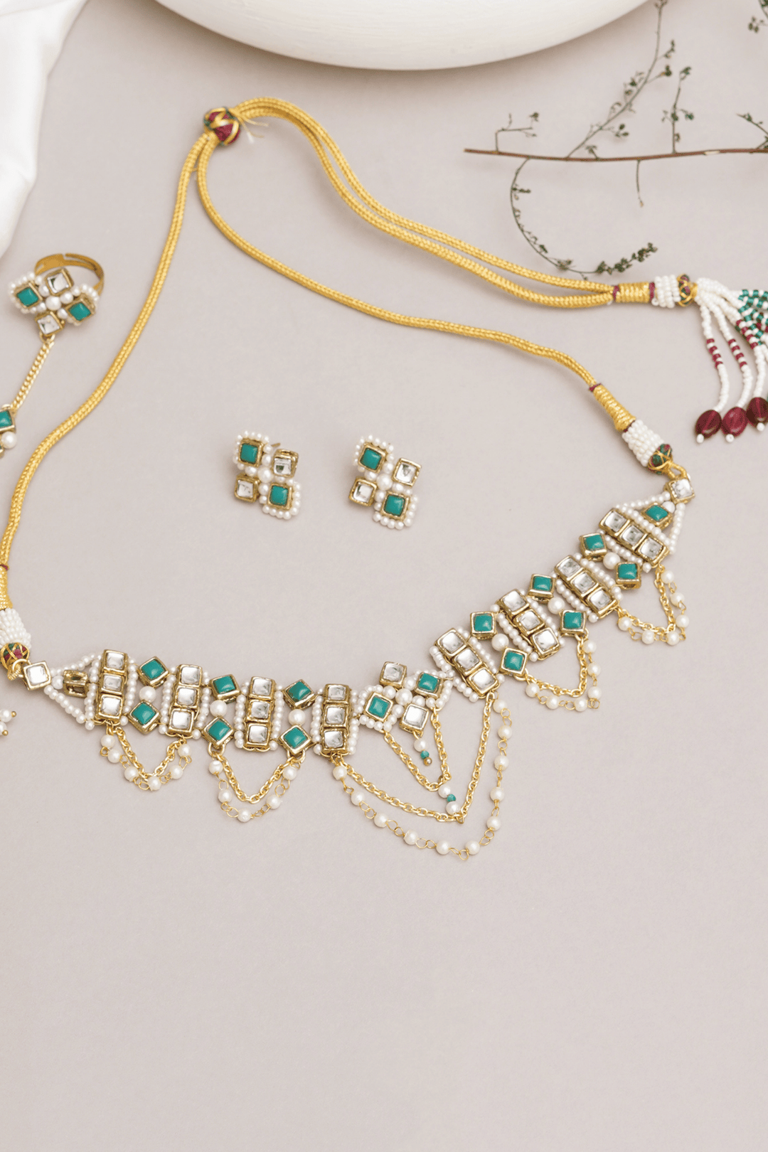Step into royal elegance with the Regal Emerald Majesty Necklace Set, a complete 3-piece ensemble featuring a stunning necklace, matching earrings, and an adjustable hathphool. Intricately handcrafted with premium Kundan, delicate pearls, and rich emerald-toned stones, this set exudes timeless charm—perfect for weddings, festive occasions, and grand celebrations.