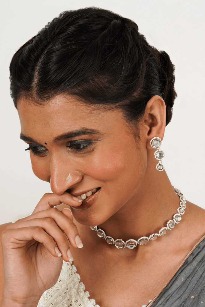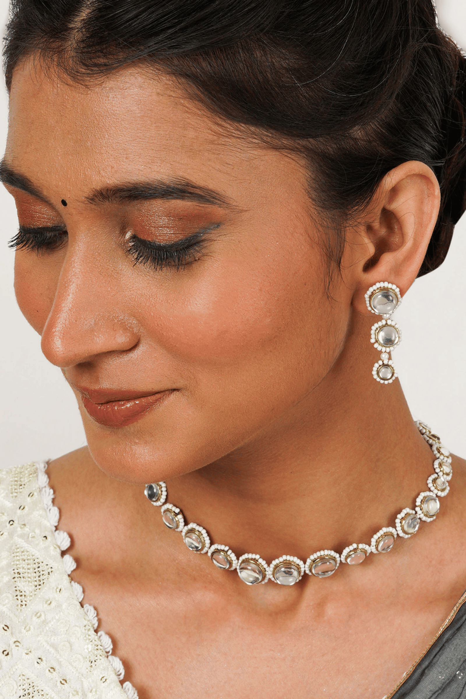 Add a touch of sophistication with the Orbital Glow Necklace Set, featuring a round Kundan single-line design that beautifully blends traditional craftsmanship with modern elegance. Adorned with sparkling Kundan stones and delicate hanging details, this necklace exudes timeless charm. The set includes matching earrings to complete your look, making it perfect for weddings, festive occasions, or contemporary celebrations.